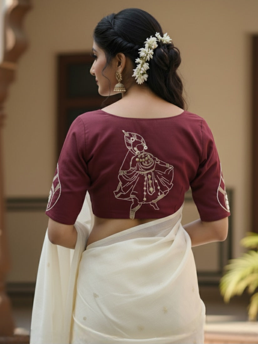 Wearing the "Yakshakala Blouse" is tribute to the rich cultural heritage of Yakshagana. Each thread tells a story, celebrating the mythical narratives and artistic brilliance that have graced Karnataka's stages for generations.