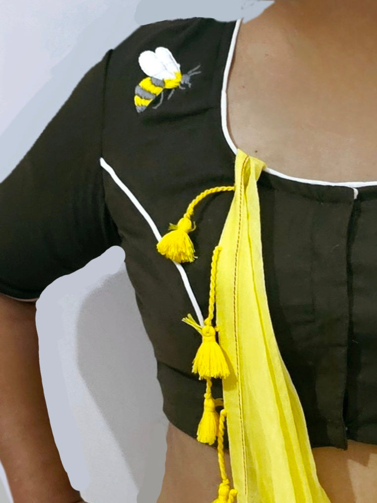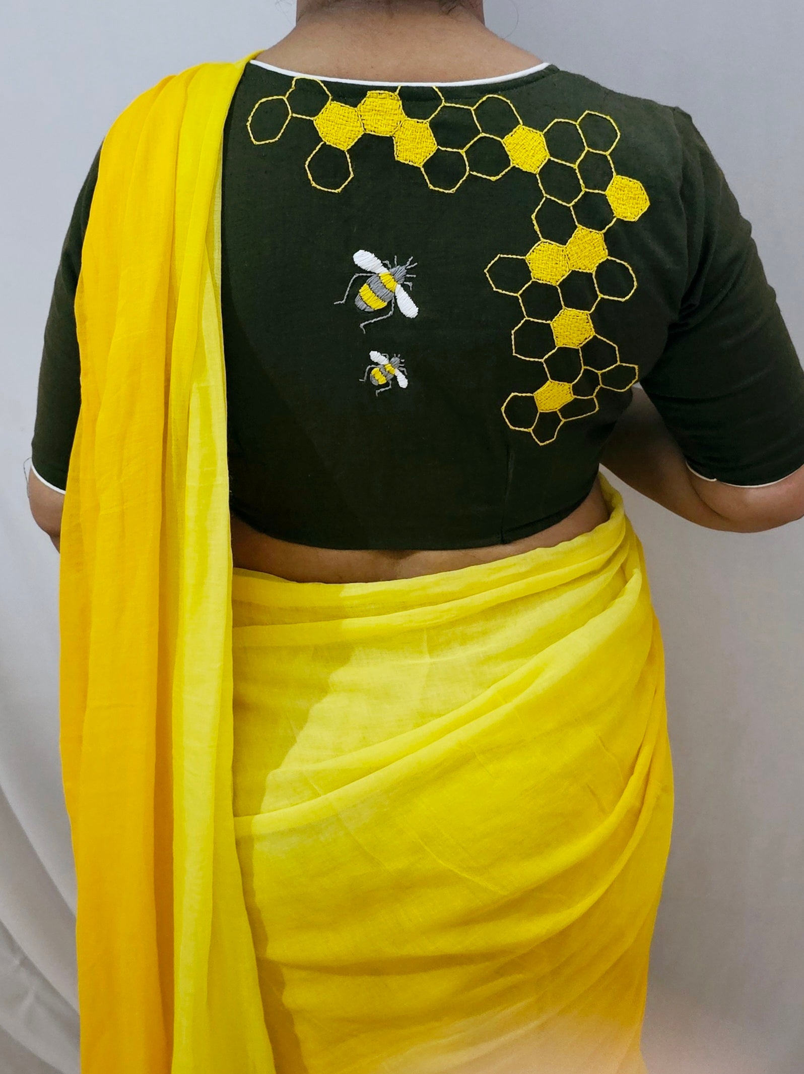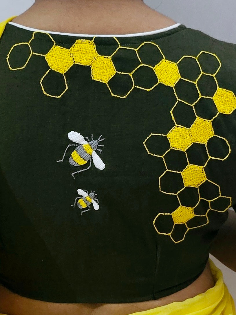 Step into a world of natural elegance with our Hive Harmony Blouse, a masterpiece of hand-embroidered honey bee and hive motifs. This artisanal creation is a tribute to the intricate beauty of nature.