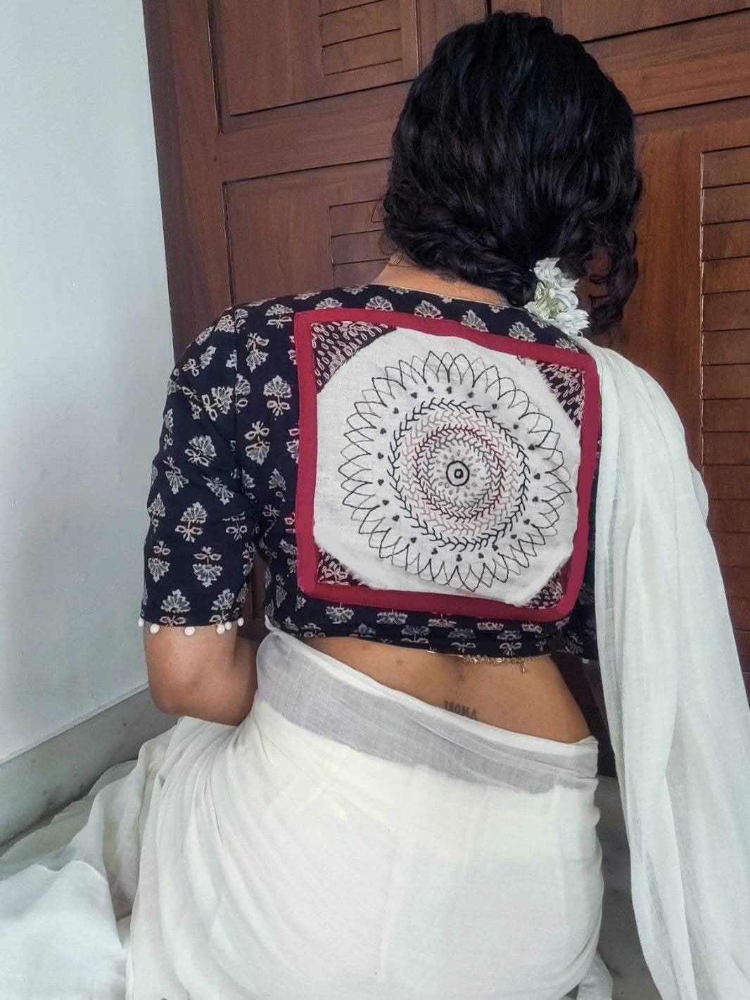 Introducing the 'Mandala Akriti' Blouse: An exquisite blend of elegance and artistry, adorned with intricate mandala weave embroidery and delicate hand-appliqué work meticulously crafted by our skilled artisans. Versatile yet captivating, this blouse adds a touch of sophistication to any saree ensemble, offering a renewed and captivating look. Elevate your wardrobe with this timeless piece that seamlessly combines tradition and modernity, perfect for those seeking effortless elegance.