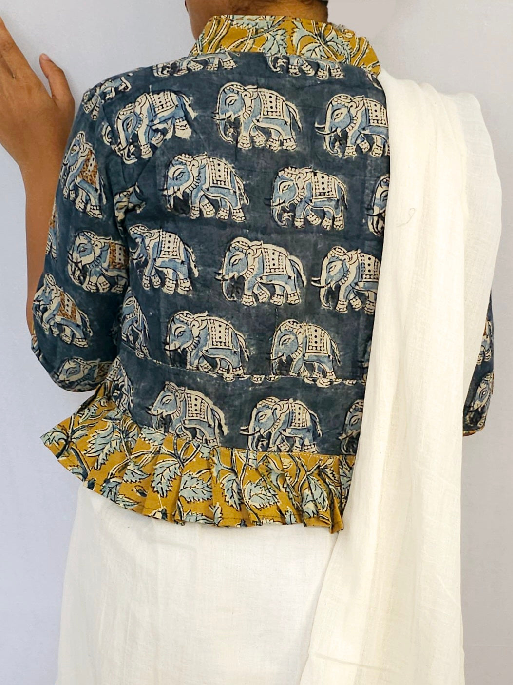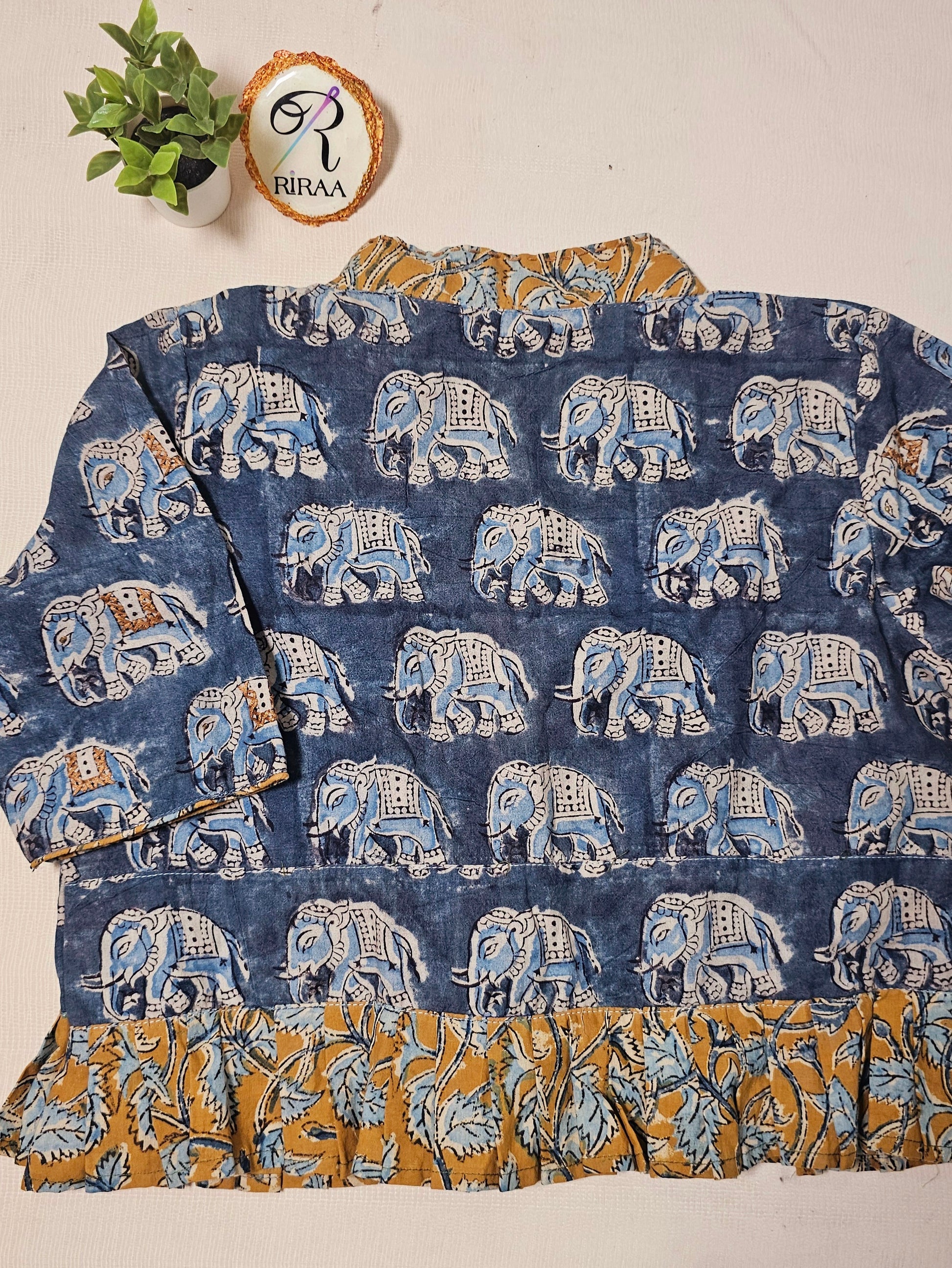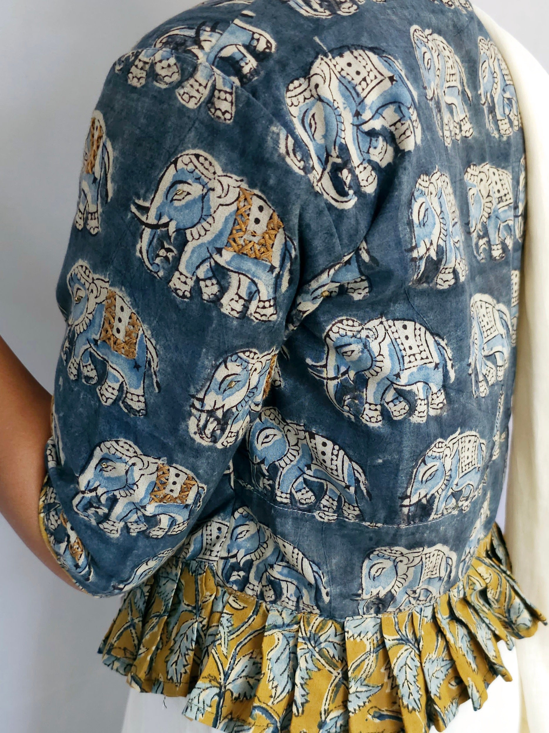 'Frill Fusion Blouse' Immerse yourself in the world of artisanal excellence with our hand-painted and hand-embroidered Katputli Blouse. Each stroke and stitch tells a story of Rajasthani heritage, making it a wearable masterpiece
