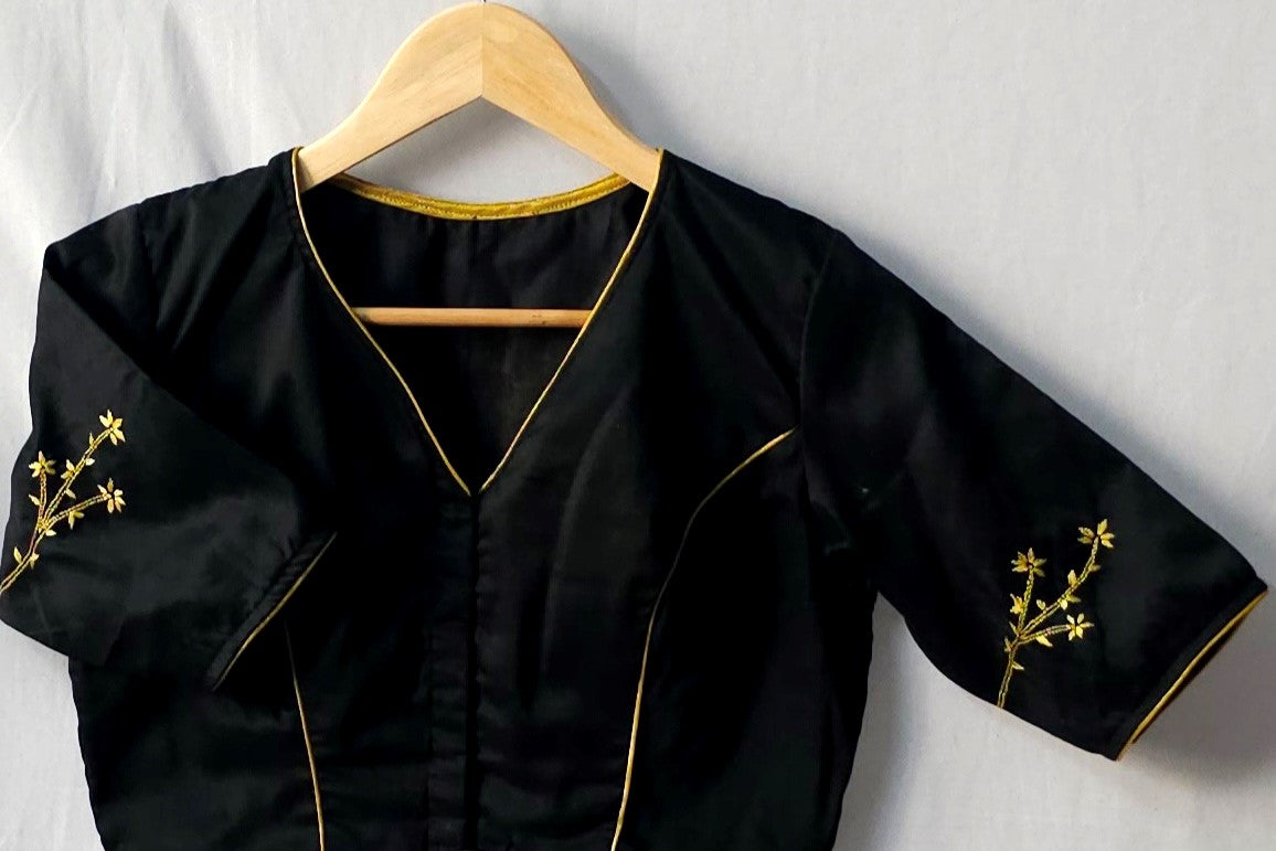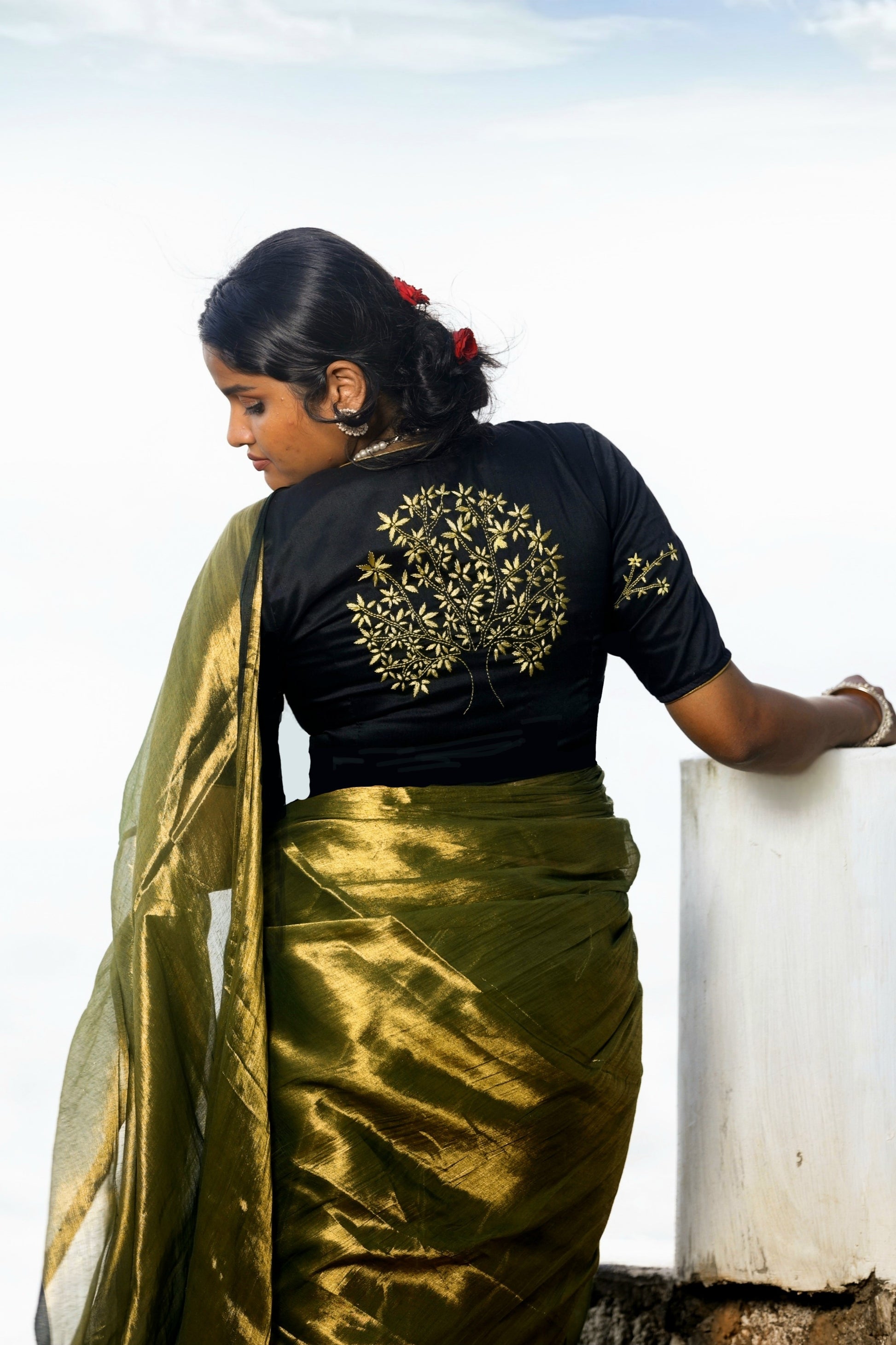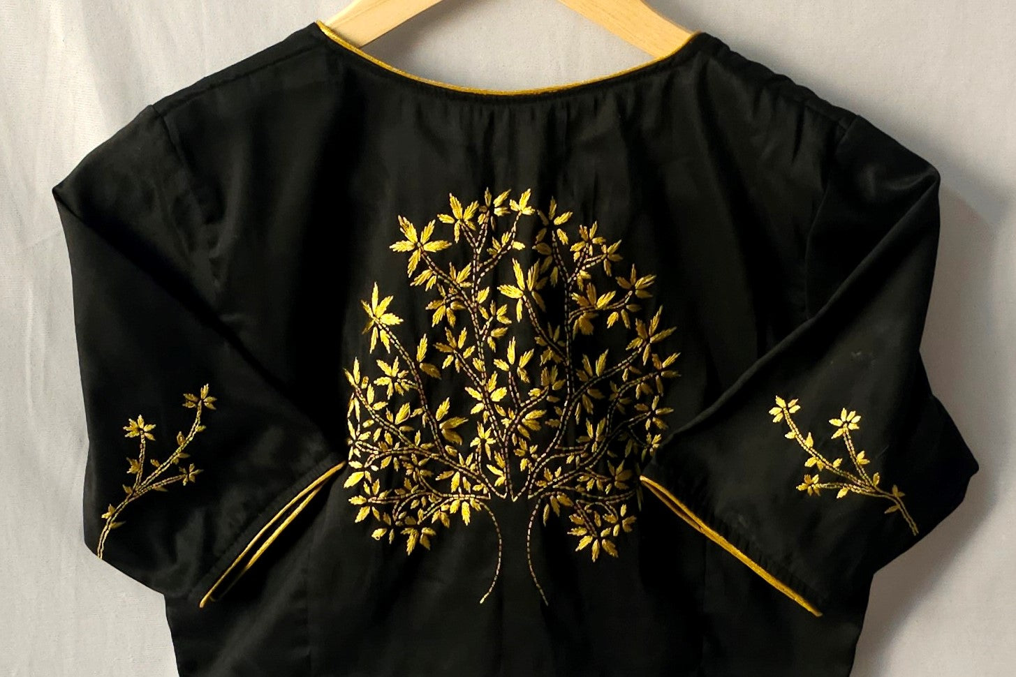 A blouse inspired by nature’s stillness. ‘Tarusha Blouse’ is hand-embroidered with a graceful tree motif and made to complement every kind of ethnic saree – cotton, khadi, or silk. It’s a quiet celebration of handmade beauty.