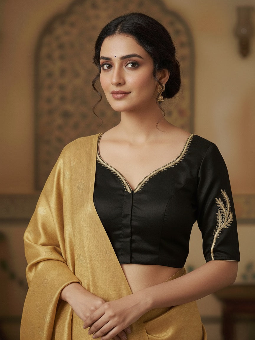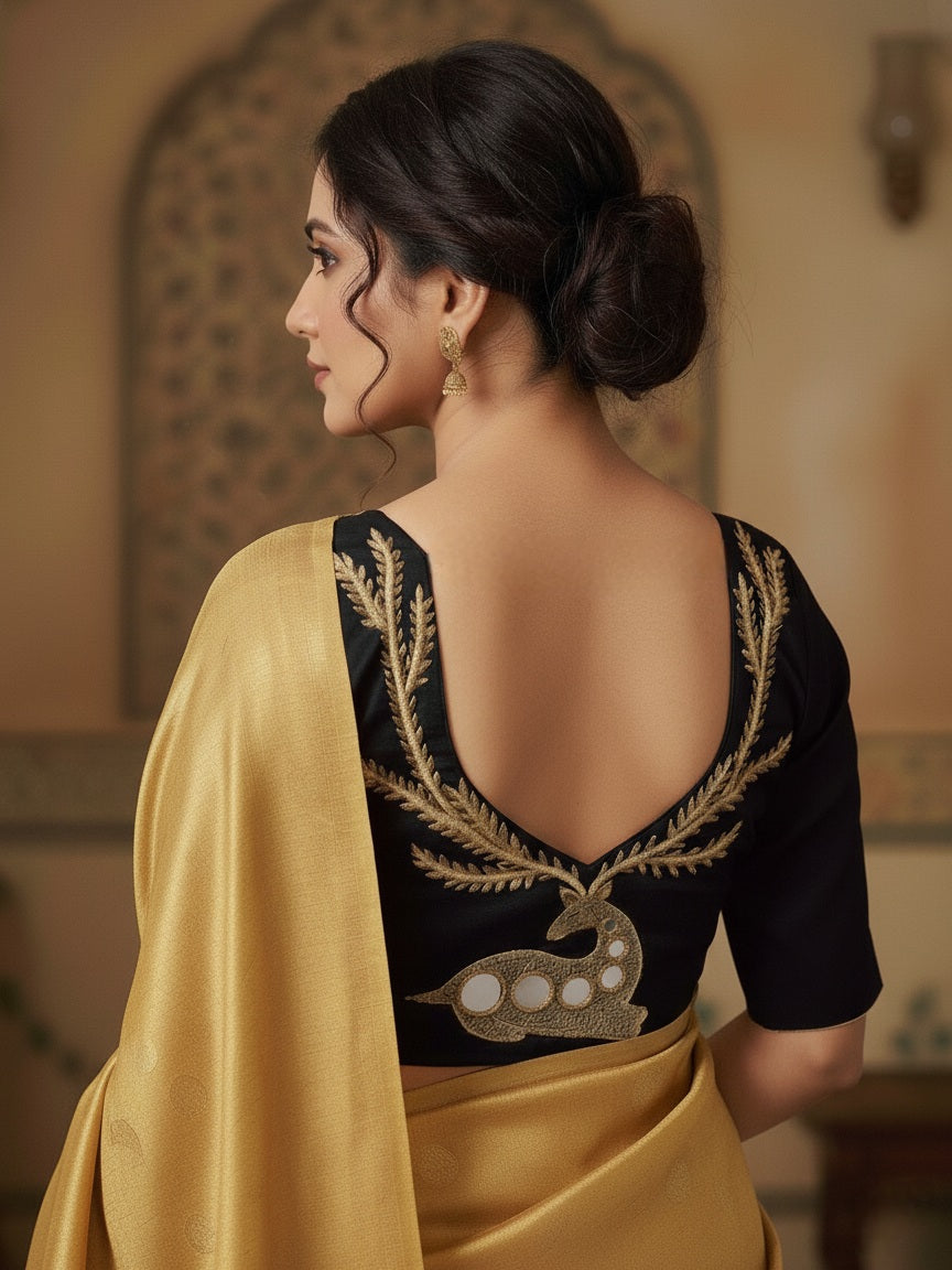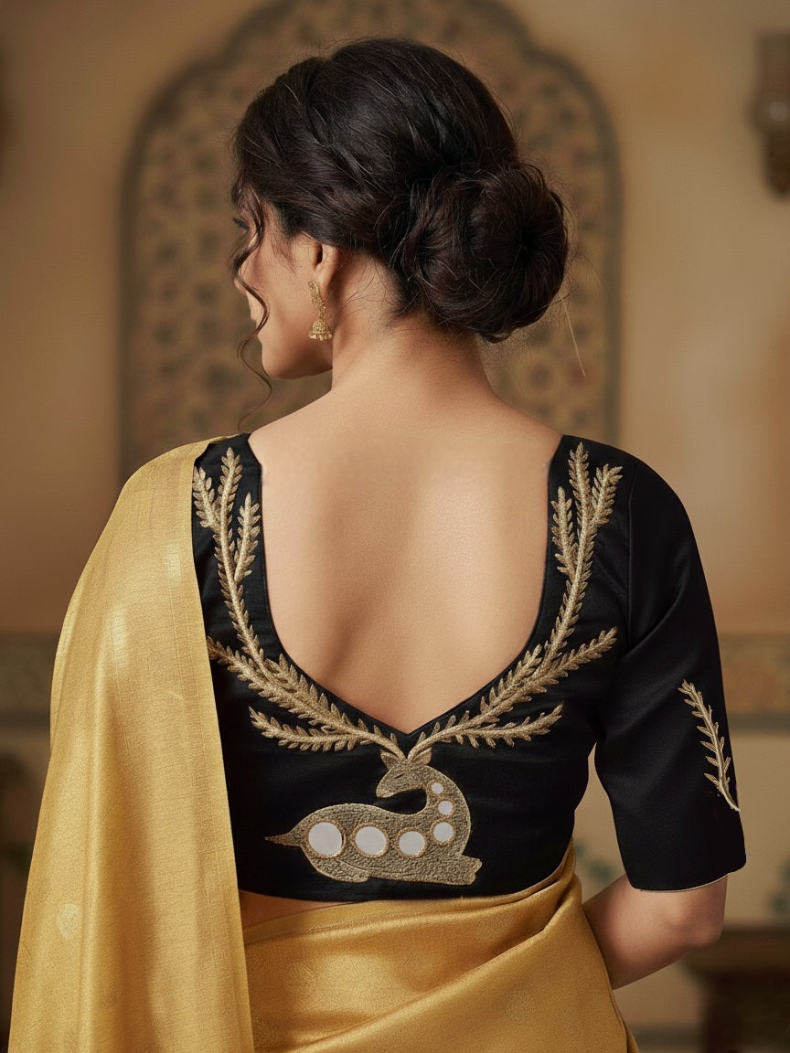 “Harini Blouse” — Inspired by the graceful beauty of the deer, this handcrafted blouse features a stunning deer motif highlighted with shisha work, aari embroidery, and intricate hand embroidery. Designed to pair perfectly with silk, Banarasi, or zari border sarees, Harini adds timeless charm to weddings and traditional occasions.