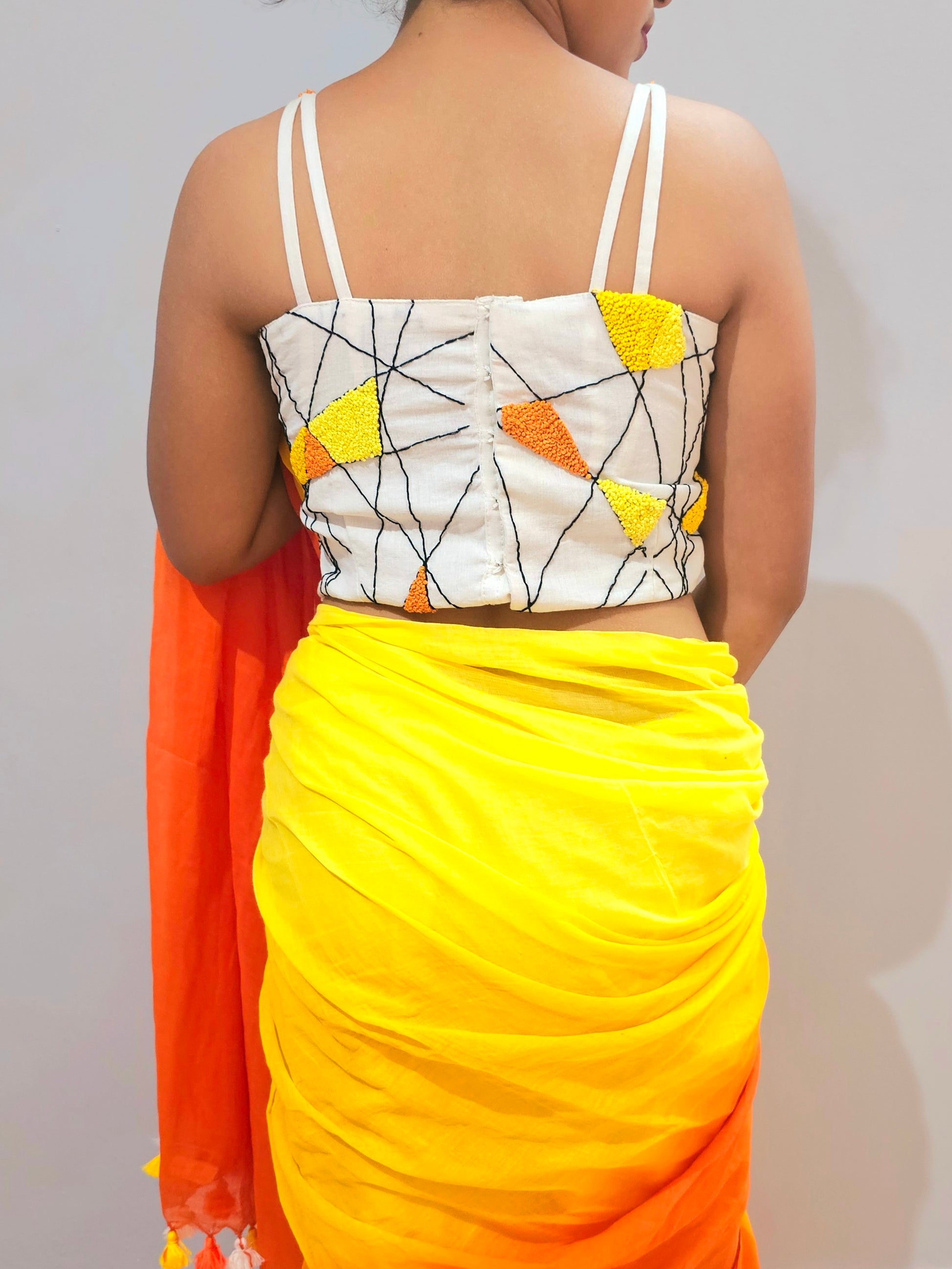 Introducing the Heer blouse, a celebration of unique design and exquisite hand embroidery. The distinctive triangle patterns, meticulously stitched by skilled artisans, give this blouse a modern yet timeless appeal. Each geometric motif is crafted with attention to detail, making the Heer blouse a standout piece in any wardrobe.