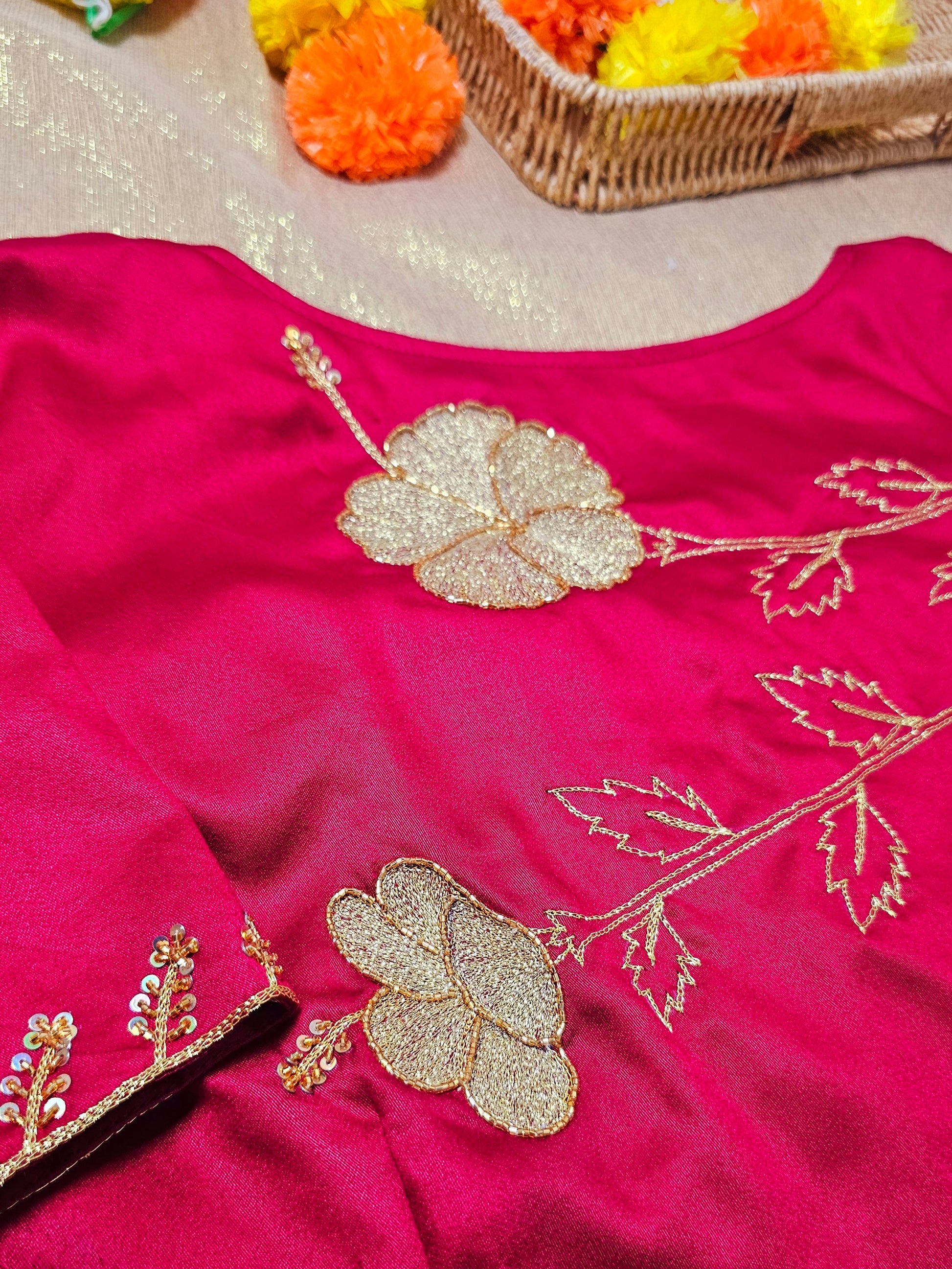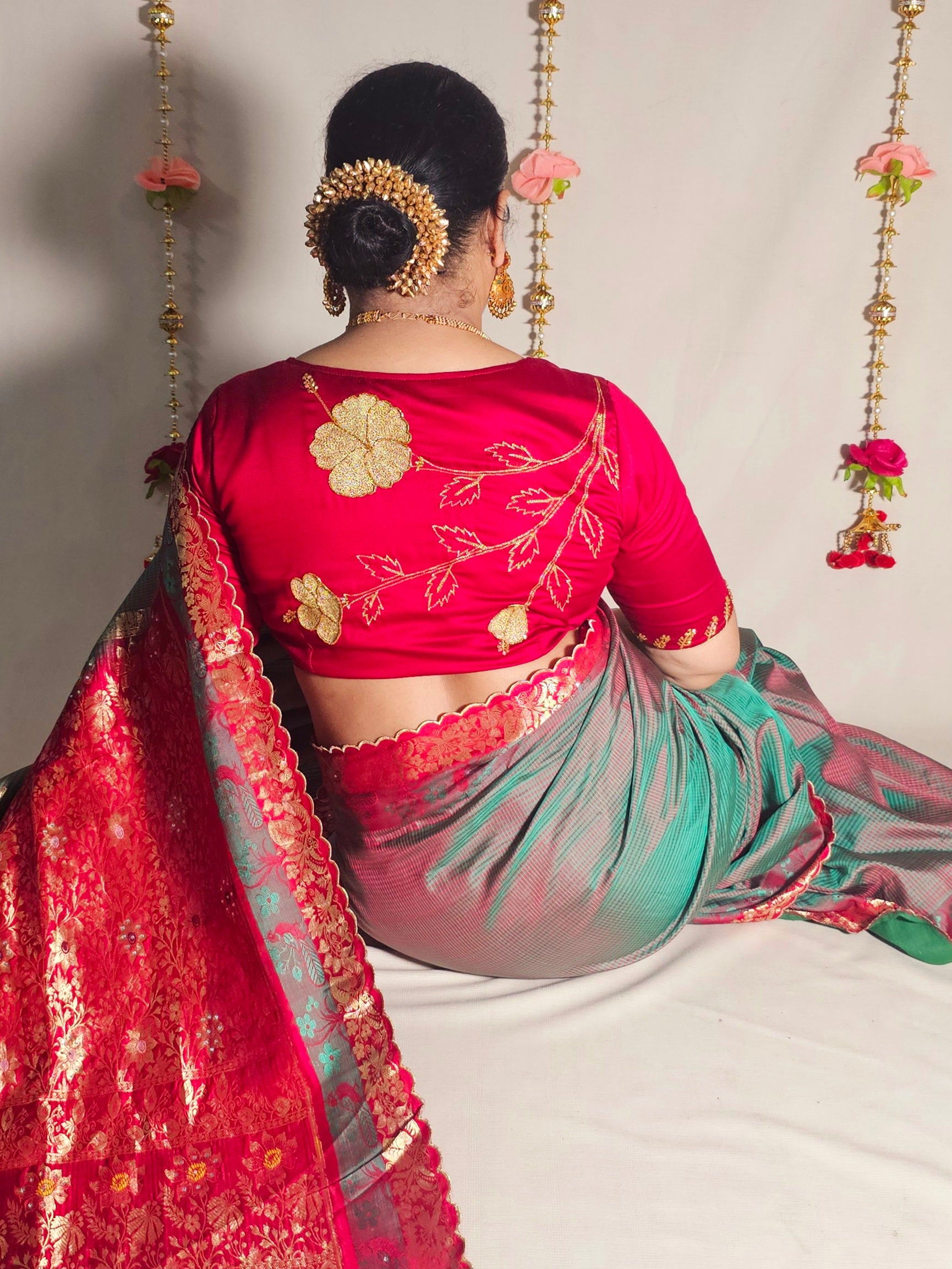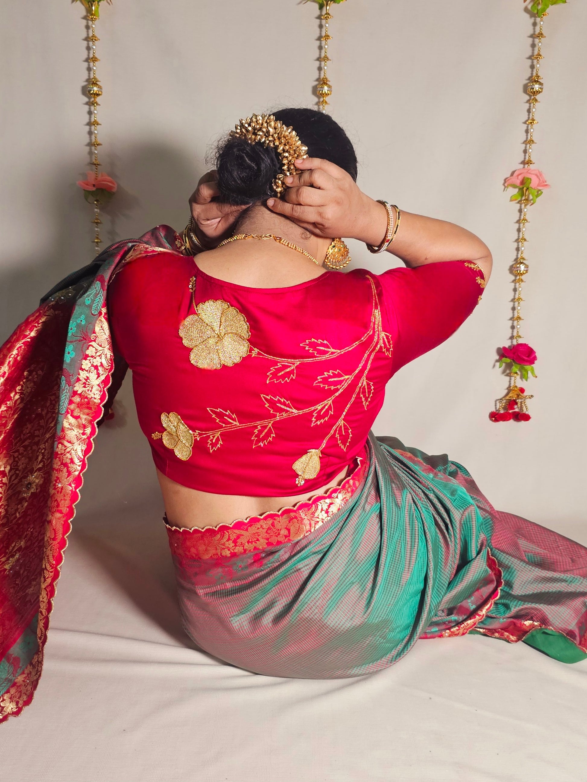 Jaswand Blouse – inspired by the hibiscus, beloved of Lord Ganesha. A divine touch for your traditional festive celebrations. Wear it to radiate elegance and devotion together. Match it with any Banarasi or golden border saree for a complete festive look.