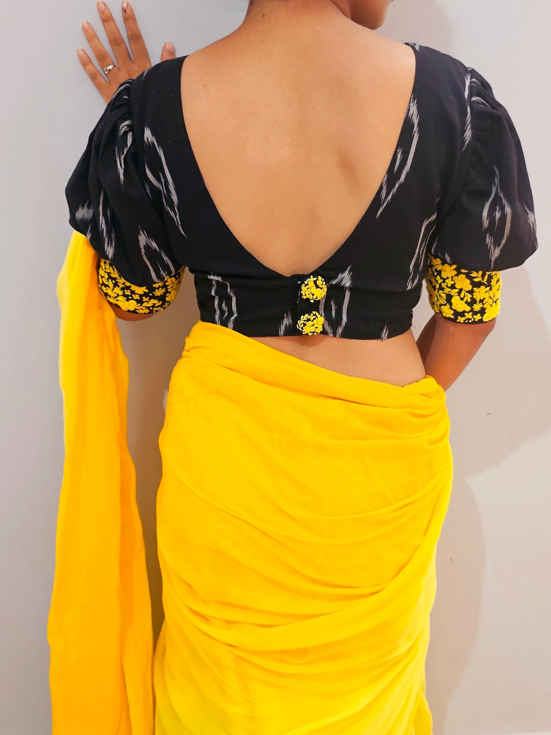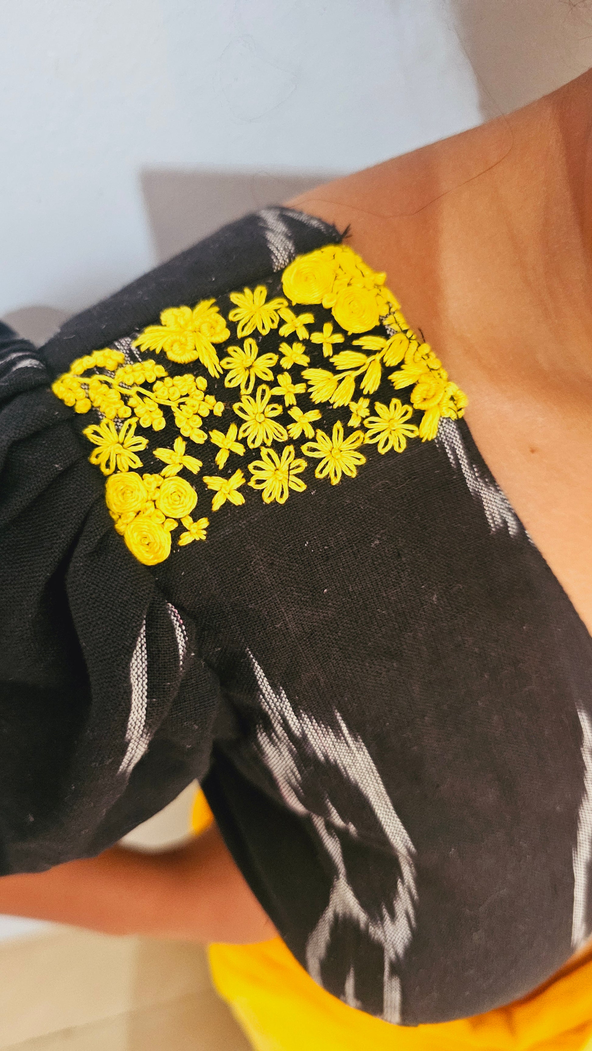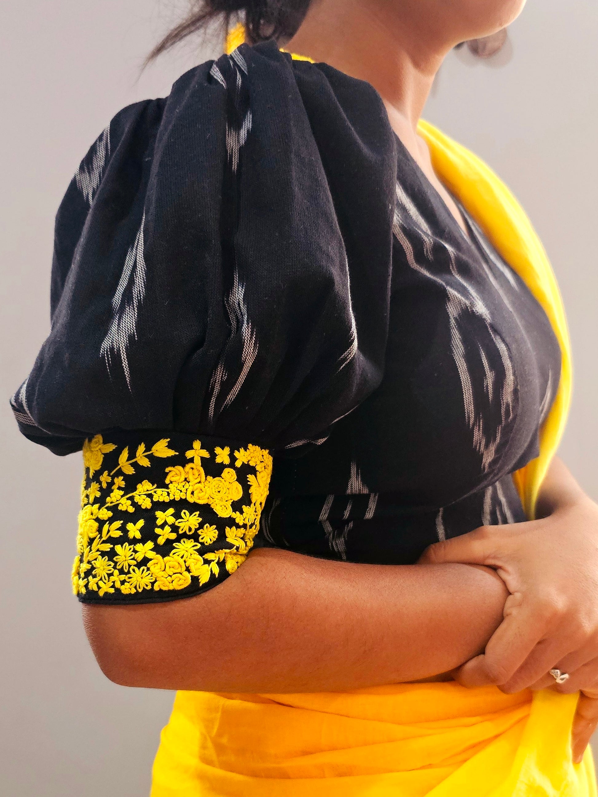 Introducing the Kanika blouse, a perfect blend of tradition and trend. This exquisite blouse features vibrant yellow floral embroidery that adds a cheerful and elegant touch. The stylish puff sleeves provide a modern twist, making it suitable for both casual and formal occasions. The Kanika blouse is a testament to meticulous craftsmanship and contemporary design, creating a look that is both unique and timeless. Enhance your wardrobe with the radiant beauty and sophisticated style of the Kanika blouse.