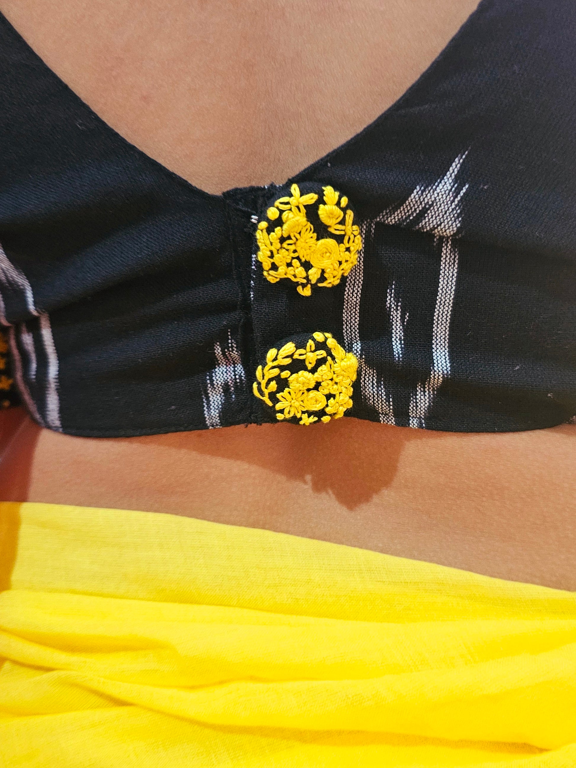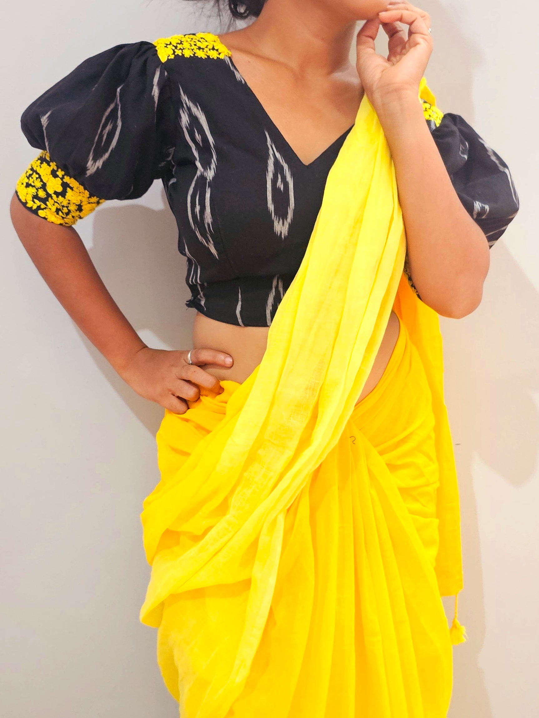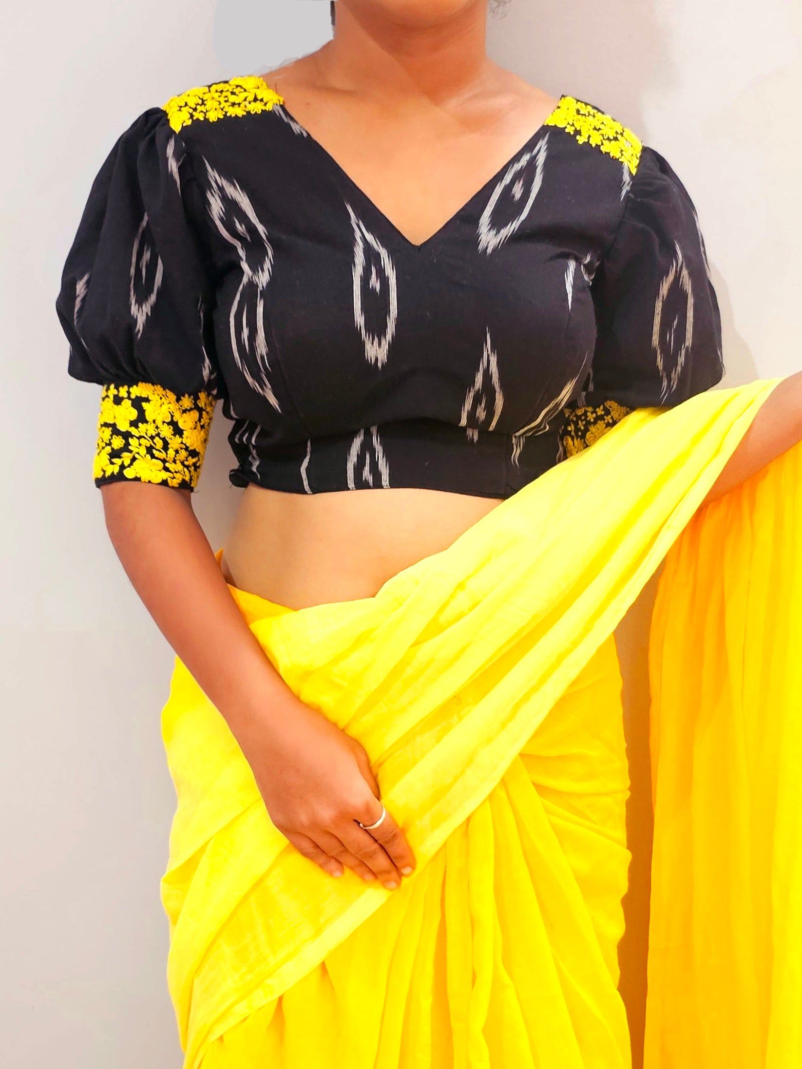 Introducing the Kanika blouse, a perfect blend of tradition and trend. This exquisite blouse features vibrant yellow floral embroidery that adds a cheerful and elegant touch. The stylish puff sleeves provide a modern twist, making it suitable for both casual and formal occasions. The Kanika blouse is a testament to meticulous craftsmanship and contemporary design, creating a look that is both unique and timeless. Enhance your wardrobe with the radiant beauty and sophisticated style of the Kanika blouse.