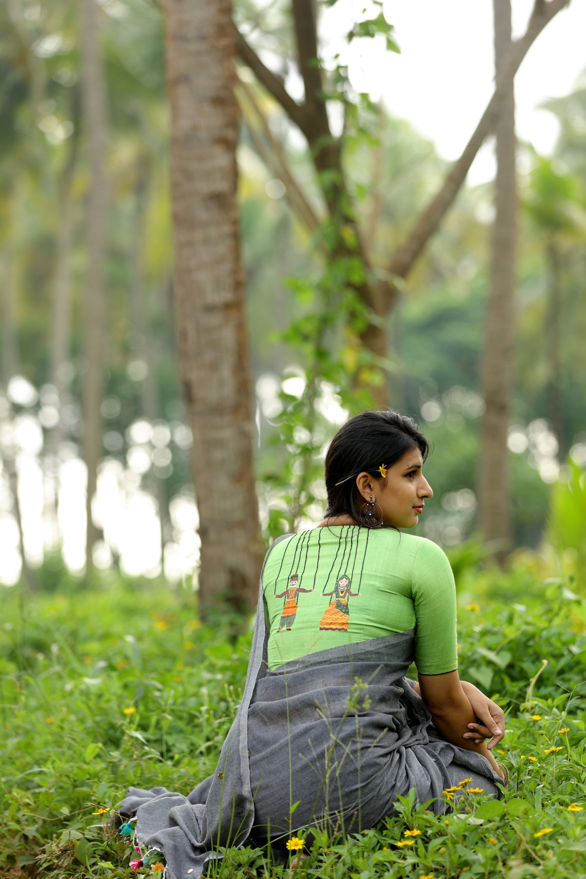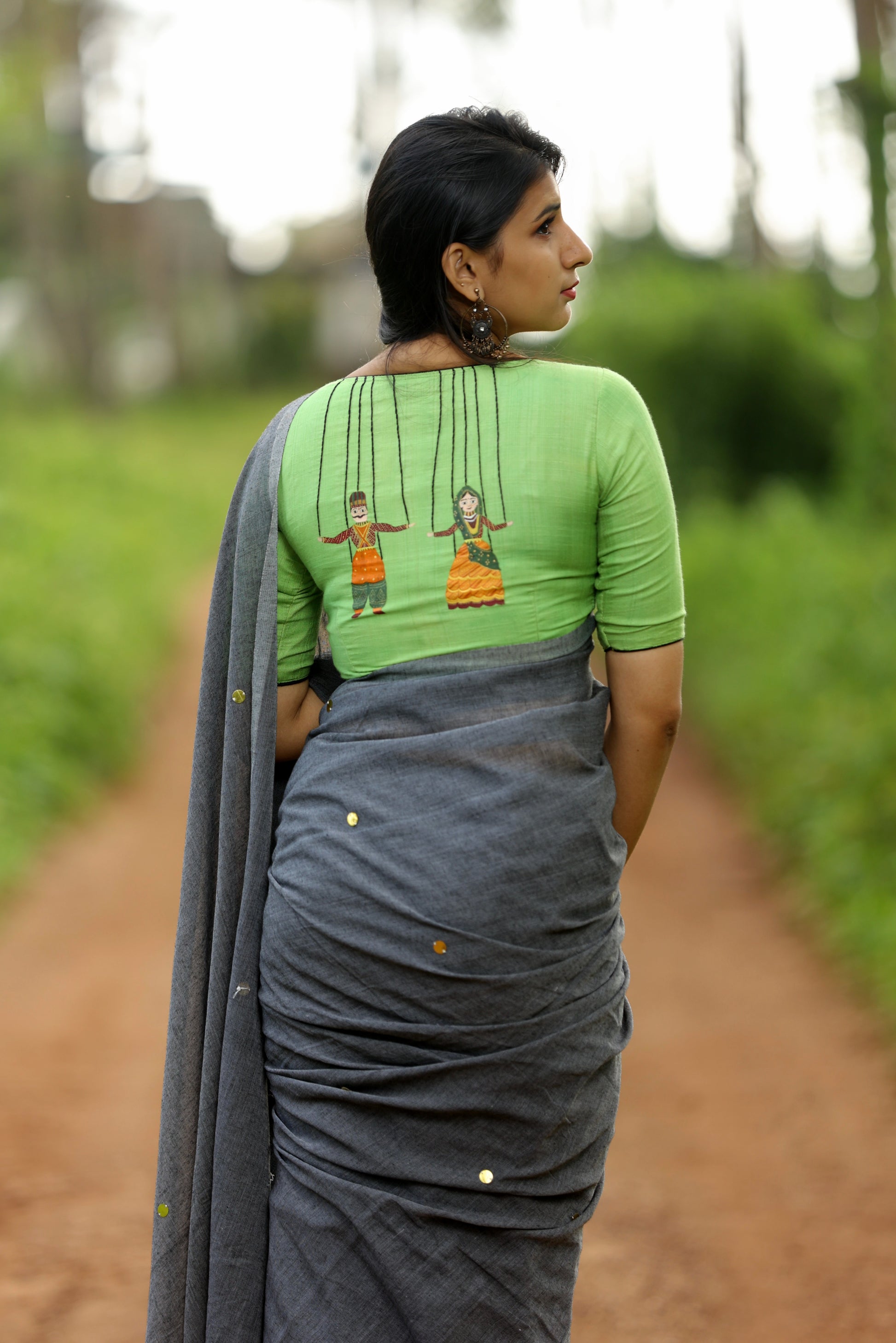 Katputli Blouse : Immerse yourself in the world of artisanal excellence with our hand-painted and hand-embroidered Katputli Blouse. Each stroke and stitch tells a story of Rajasthani heritage, making it a wearable masterpiece