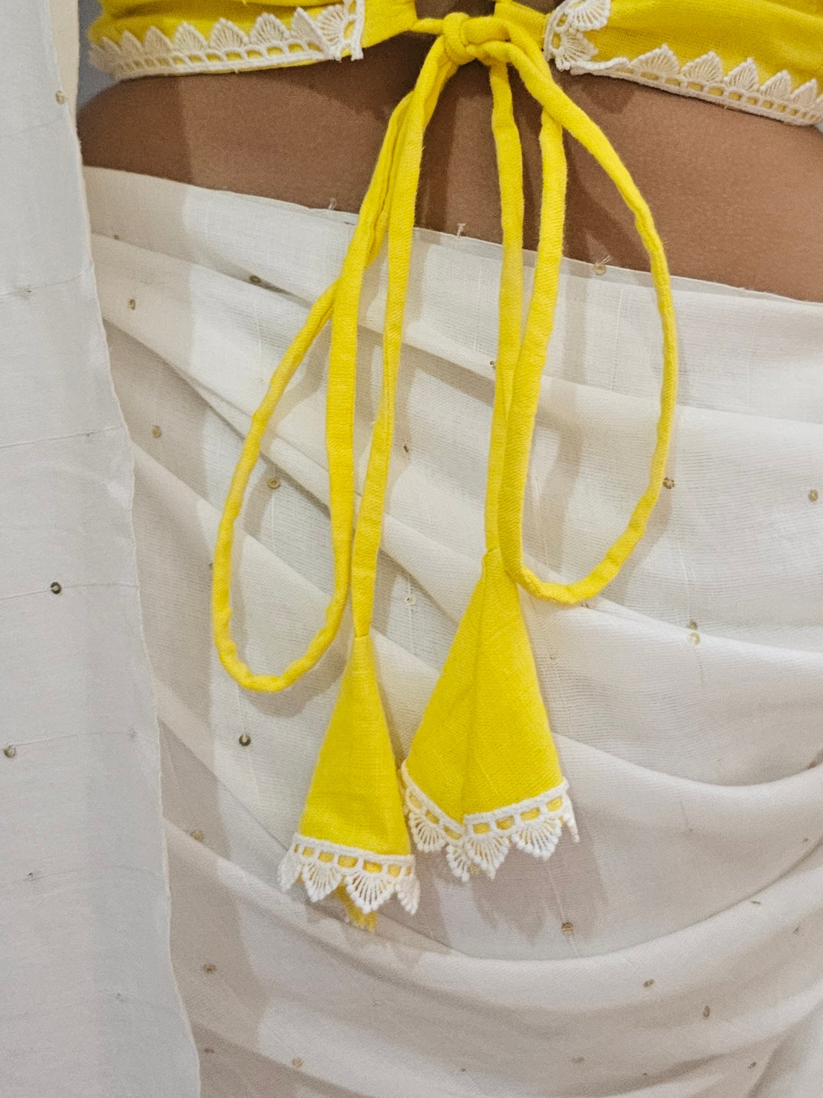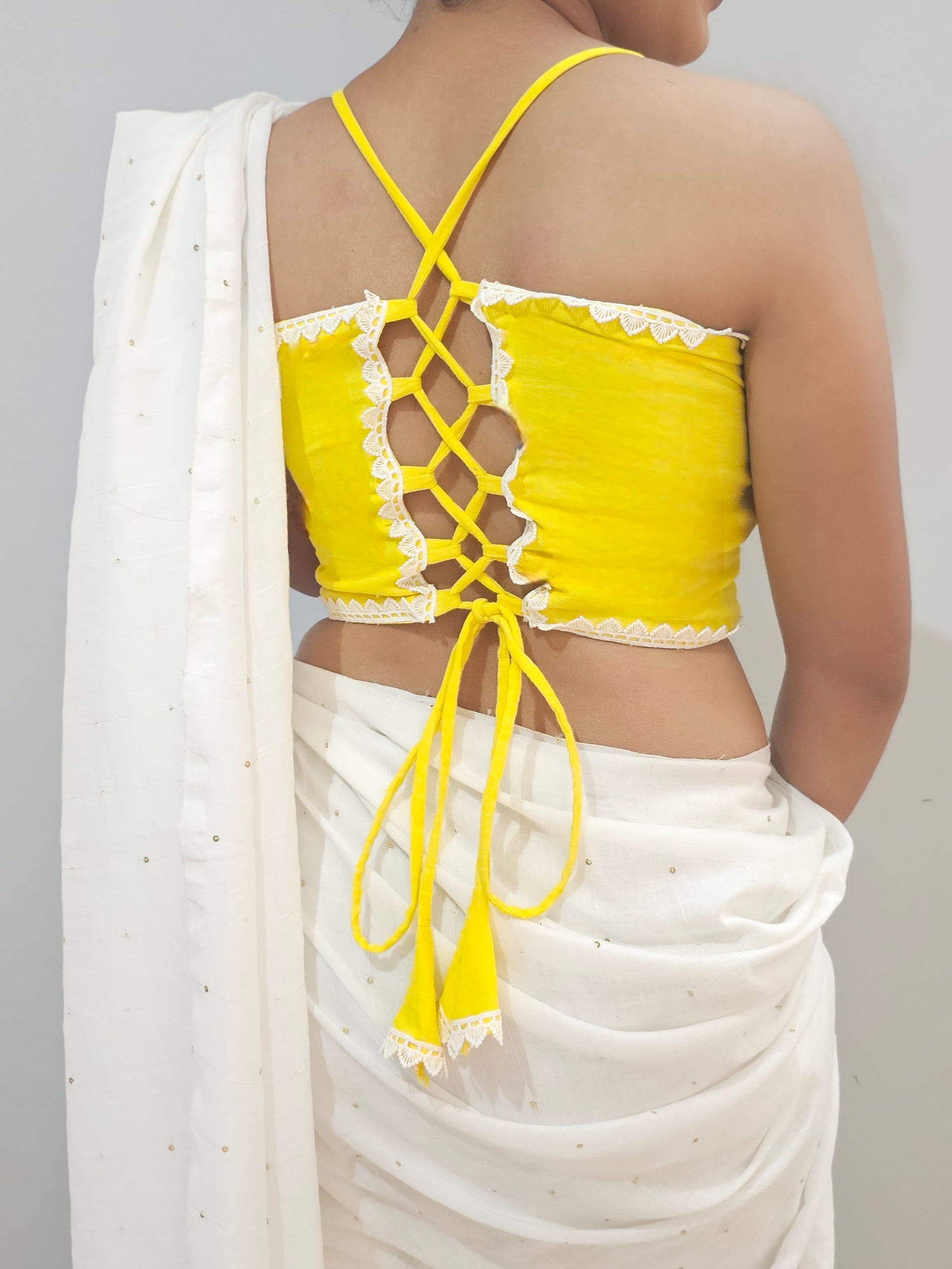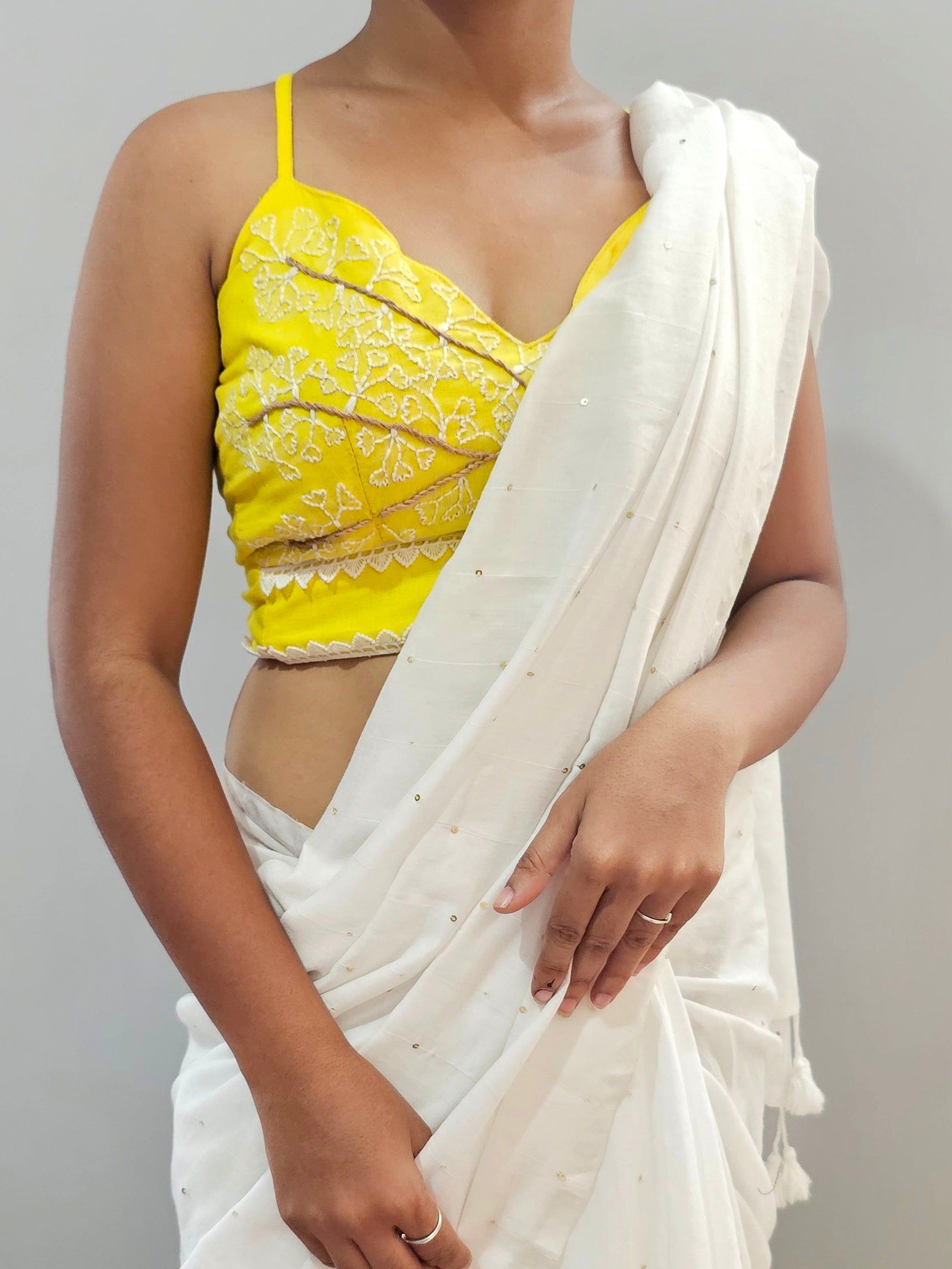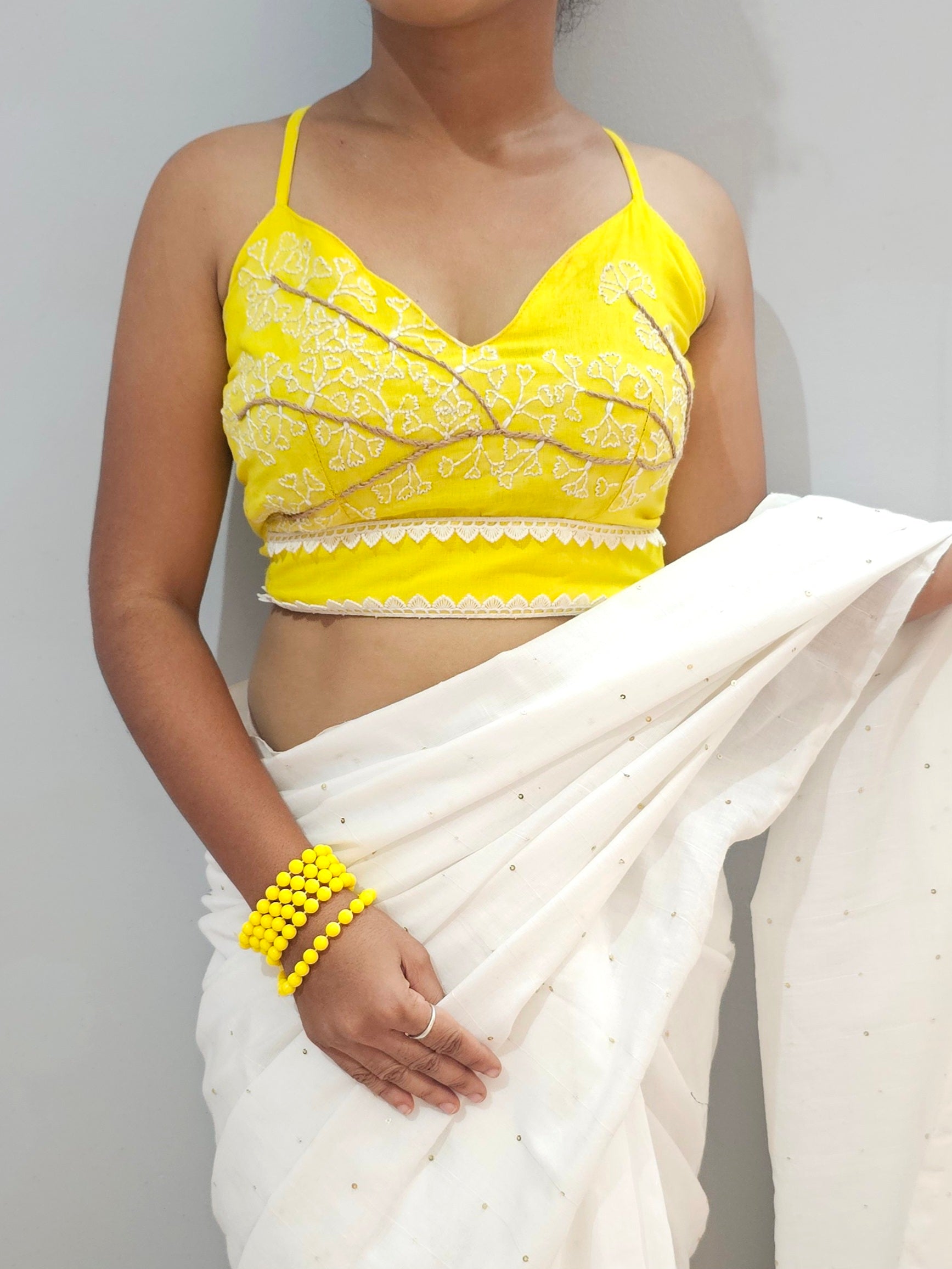 Introducing the Lehar Blouse : where sophistication meets allure in a harmonious dance. Adorned with delicate floral motifs and intricate lacework, this bralette blouse exudes timeless elegance and feminine charm. Perfect for adding a touch of grace to any ensemble, the Lehar Blouse is a versatile and captivating choice that promises to elevate your style with its understated beauty. Whether paired with a saree, jeans, or other outfits, it effortlessly complements a variety of looks with its versatile appeal.