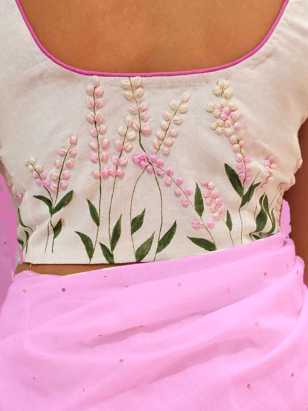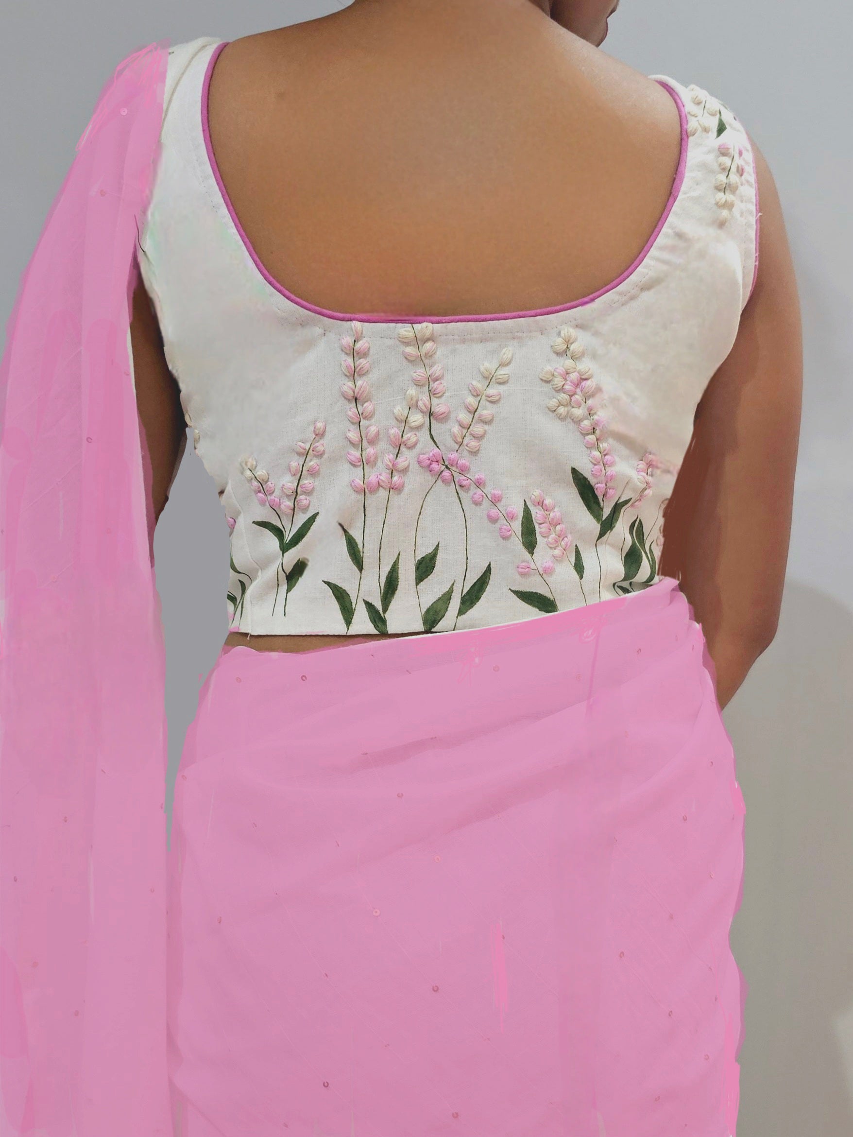 Introducing the Sargam Blouse, a symbol of unparalleled luxury and sophistication. With its exquisite 3D embroidered floral motifs and meticulously hand-embroidered leaves, this blouse captures the essence of regal beauty, making every wearer feel like royalty.