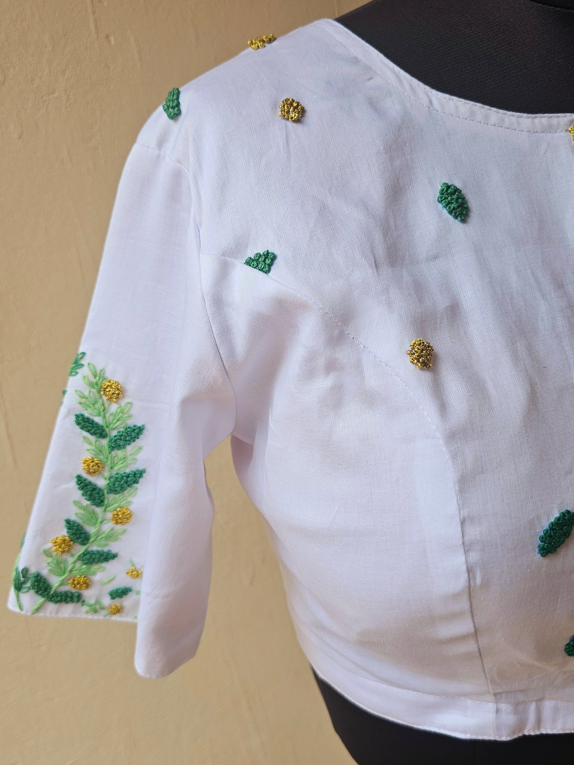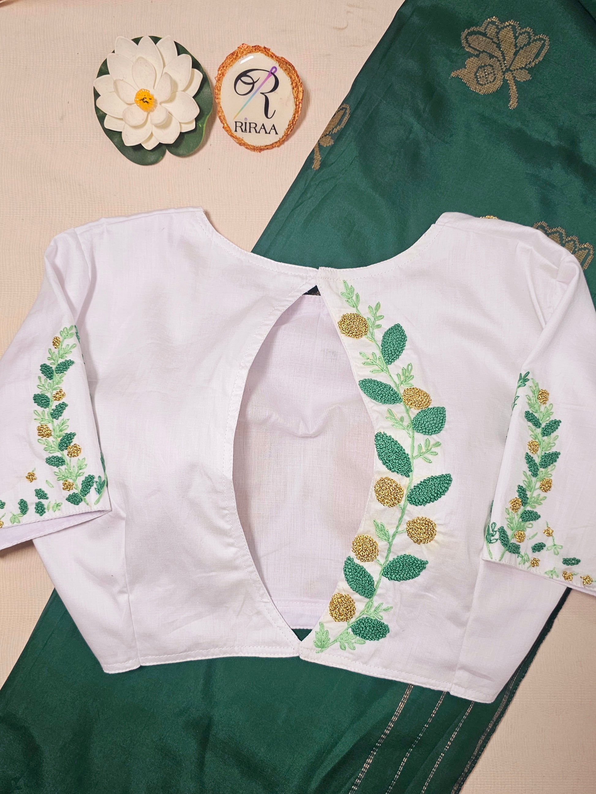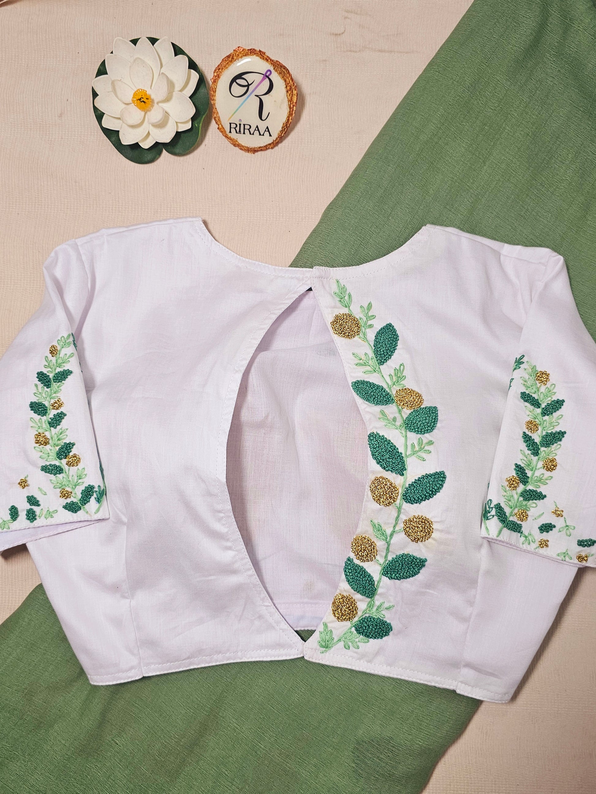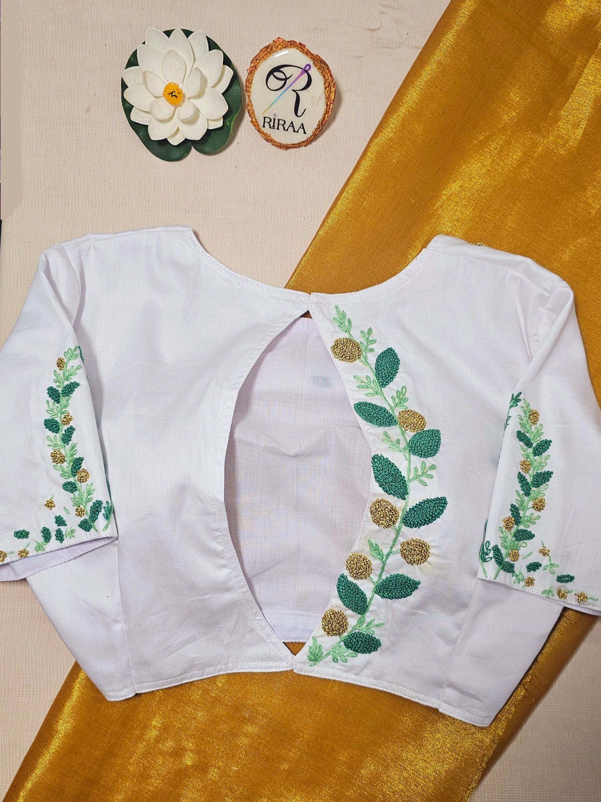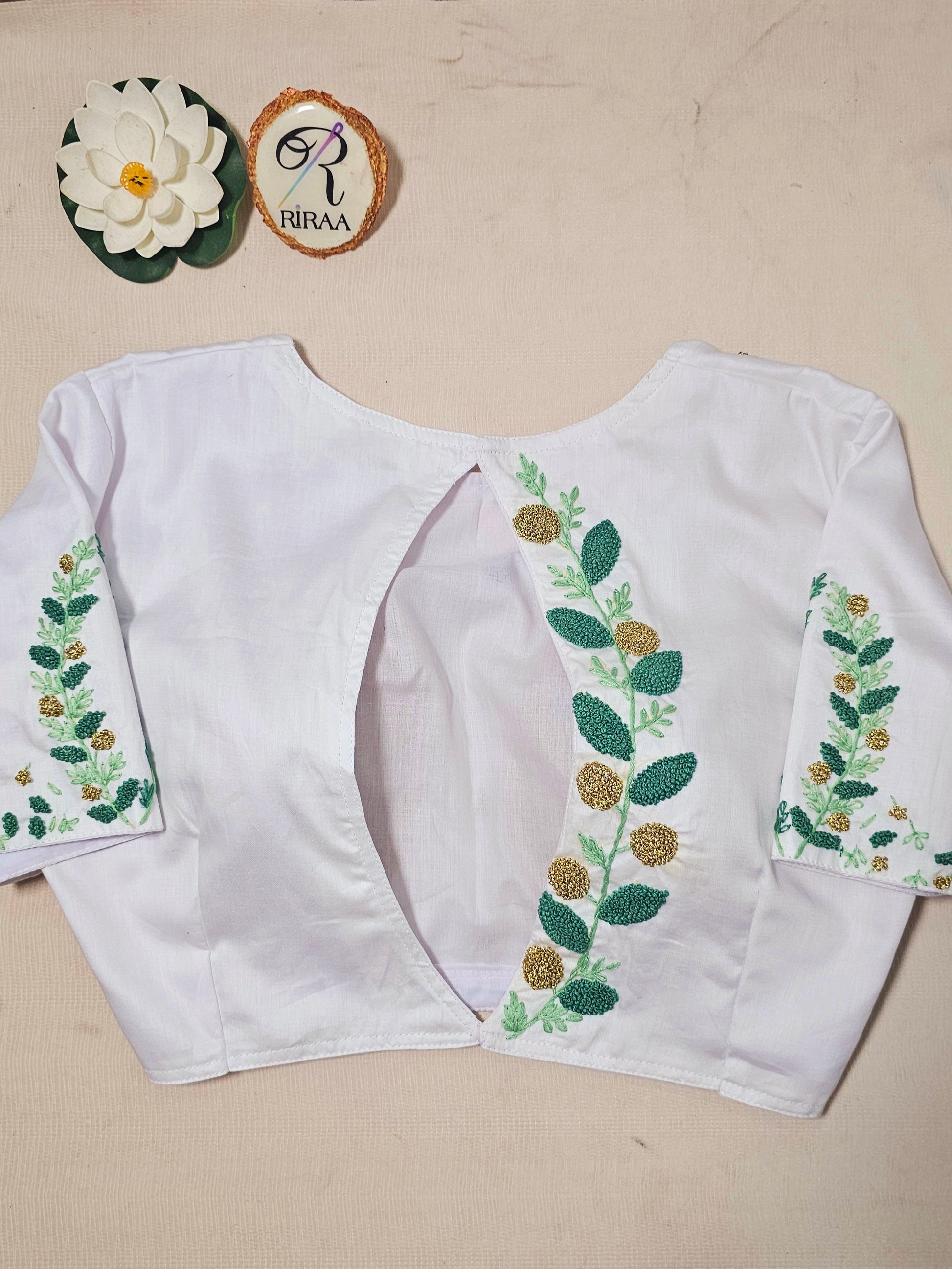 Introducing the "Madhrima blouse", our premium breathtaking masterpiece adorned with exquisite floral hand embroidery, where each delicate stitch illuminates the fabric with timeless elegance. Crafted with meticulous attention to detail, this blouse radiates sophistication and grace, ensuring you stand out with effortless beauty on any occasion. Elevate your ensemble with the "Madhurima blouse" and let its captivating floral motifs enchant and inspire every glance.