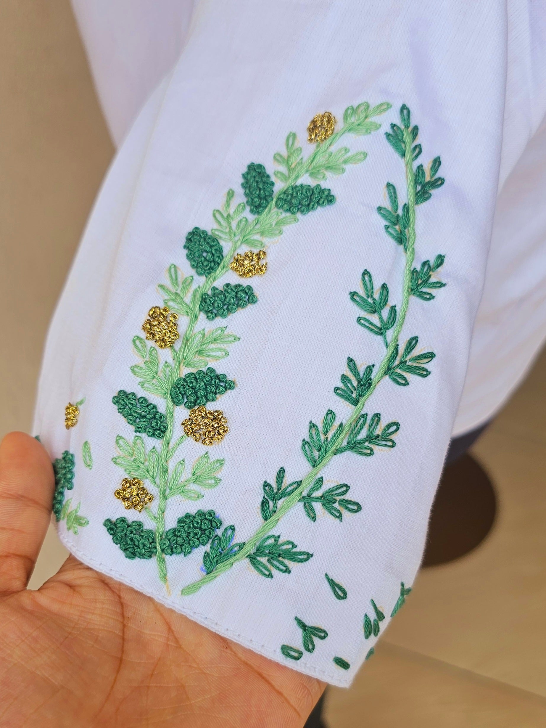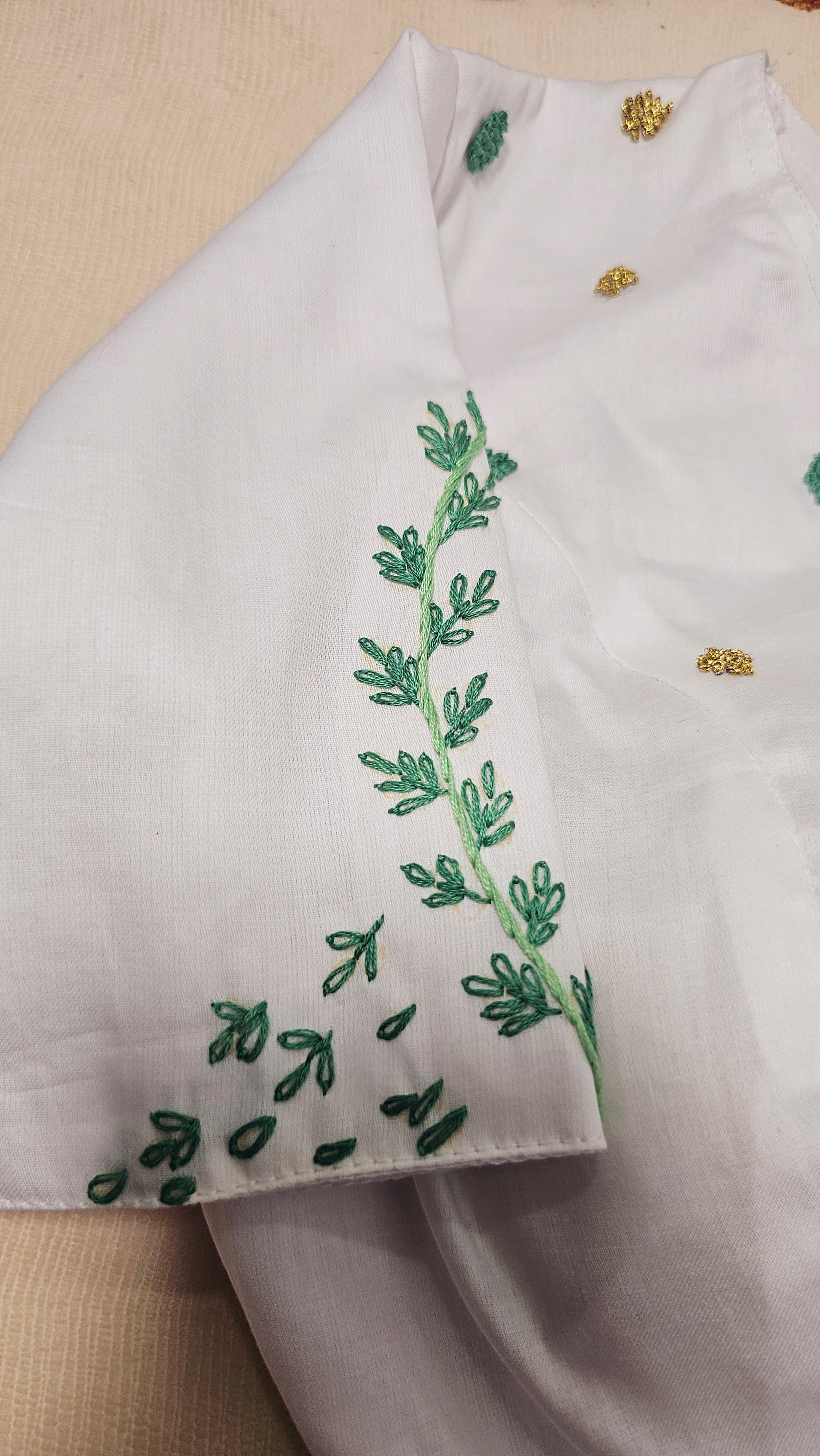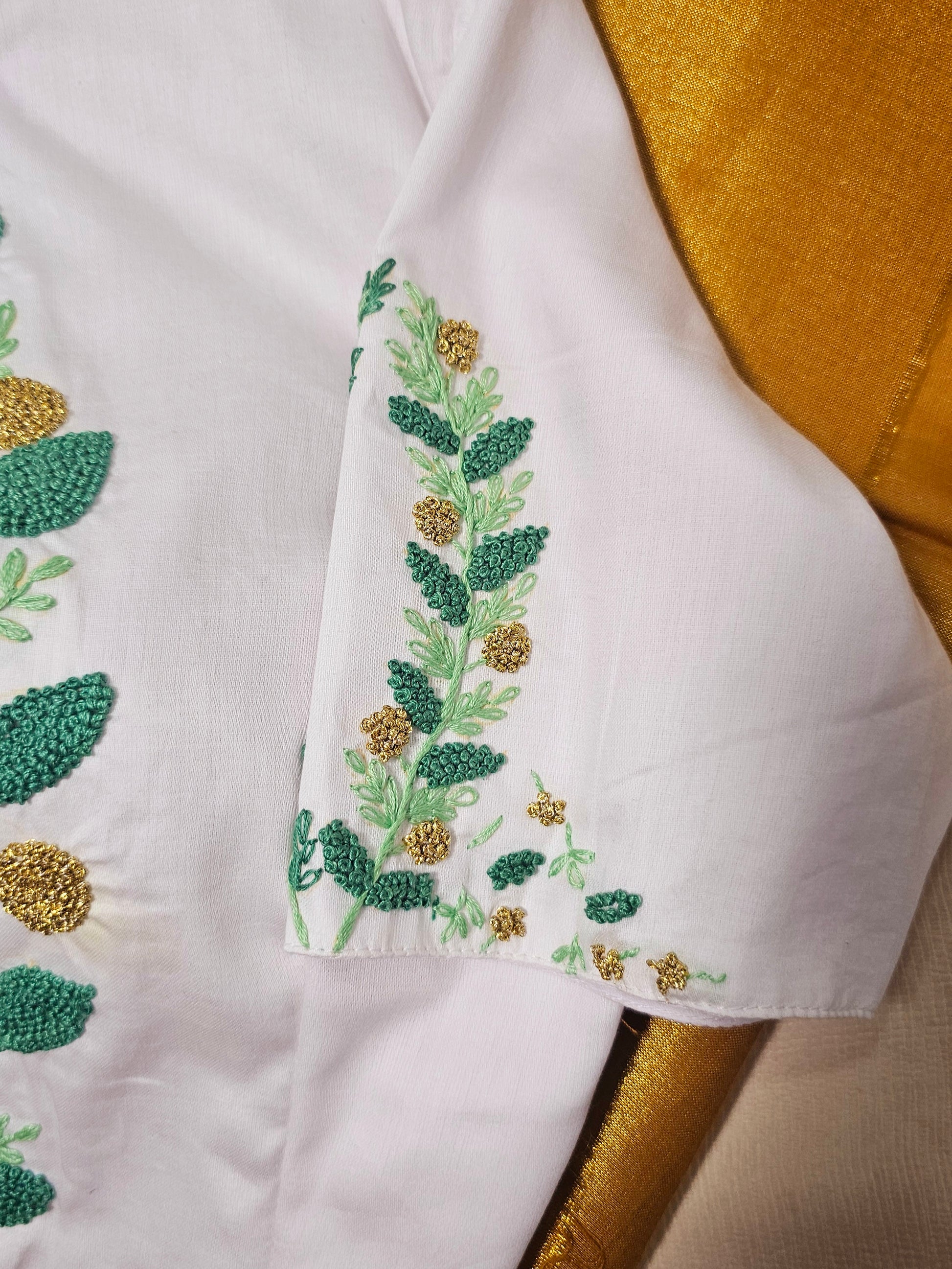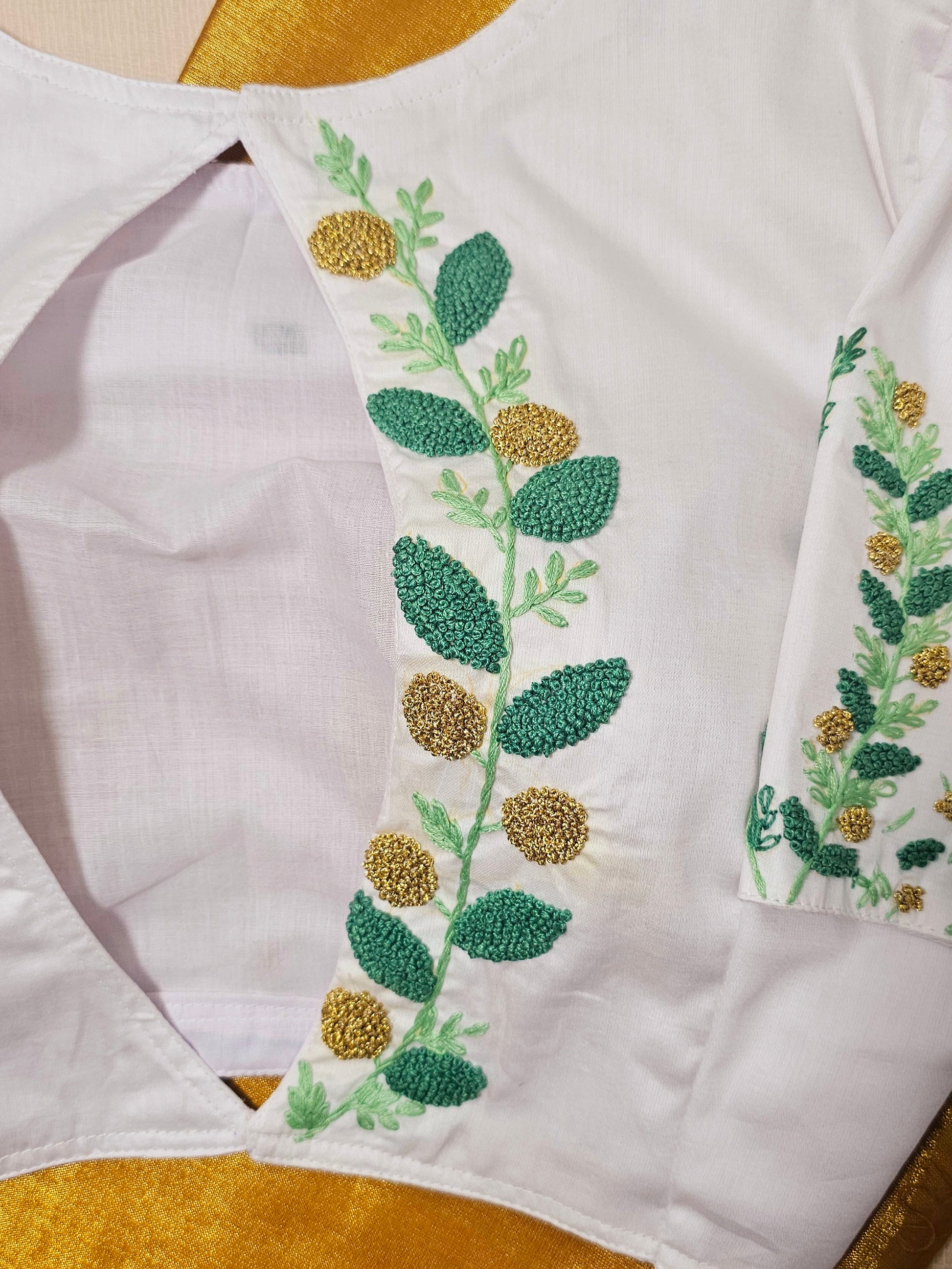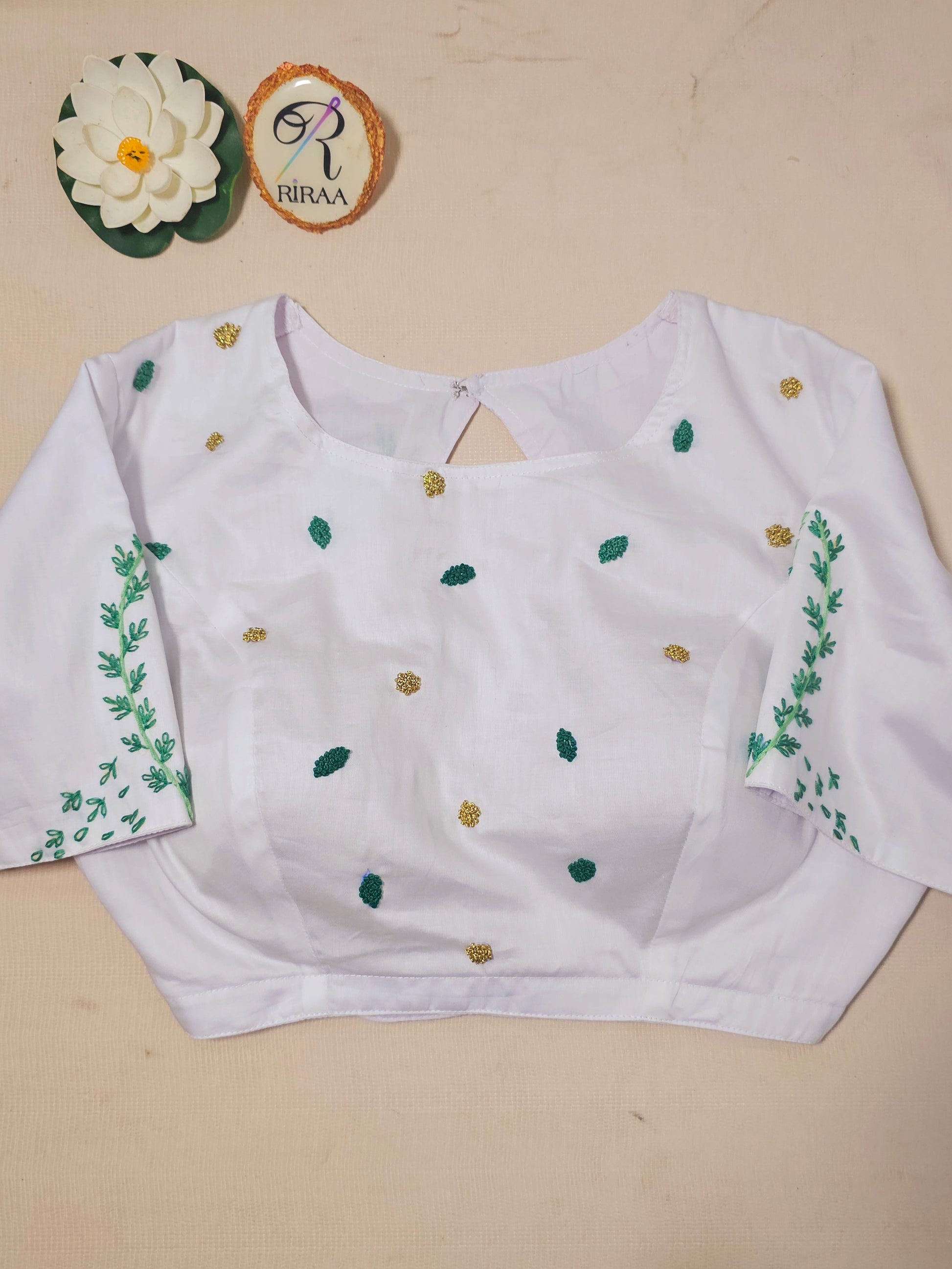 Introducing the "Madhrima blouse", our premium breathtaking masterpiece adorned with exquisite floral hand embroidery, where each delicate stitch illuminates the fabric with timeless elegance. Crafted with meticulous attention to detail, this blouse radiates sophistication and grace, ensuring you stand out with effortless beauty on any occasion. Elevate your ensemble with the "Madhurima blouse" and let its captivating floral motifs enchant and inspire every glance.