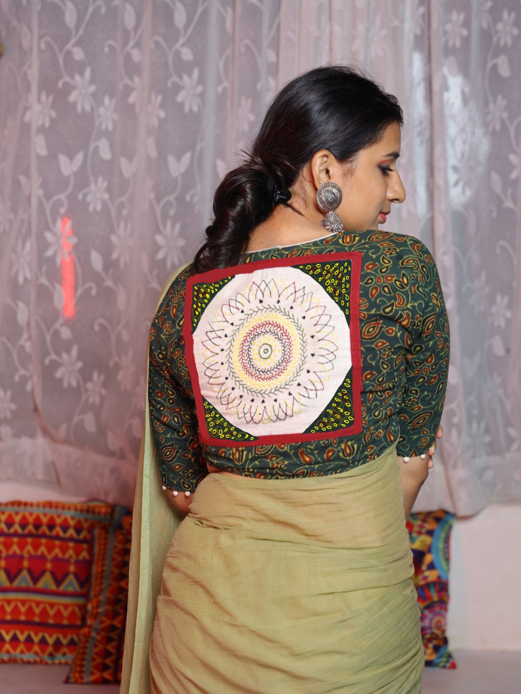 Introducing the 'Mandala Akriti' Blouse: An exquisite blend of elegance and artistry, adorned with intricate mandala weave embroidery and delicate hand-appliqué work meticulously crafted by our skilled artisans. Versatile yet captivating, this blouse adds a touch of sophistication to any saree ensemble, offering a renewed and captivating look. Elevate your wardrobe with this timeless piece that seamlessly combines tradition and modernity, perfect for those seeking effortless elegance.