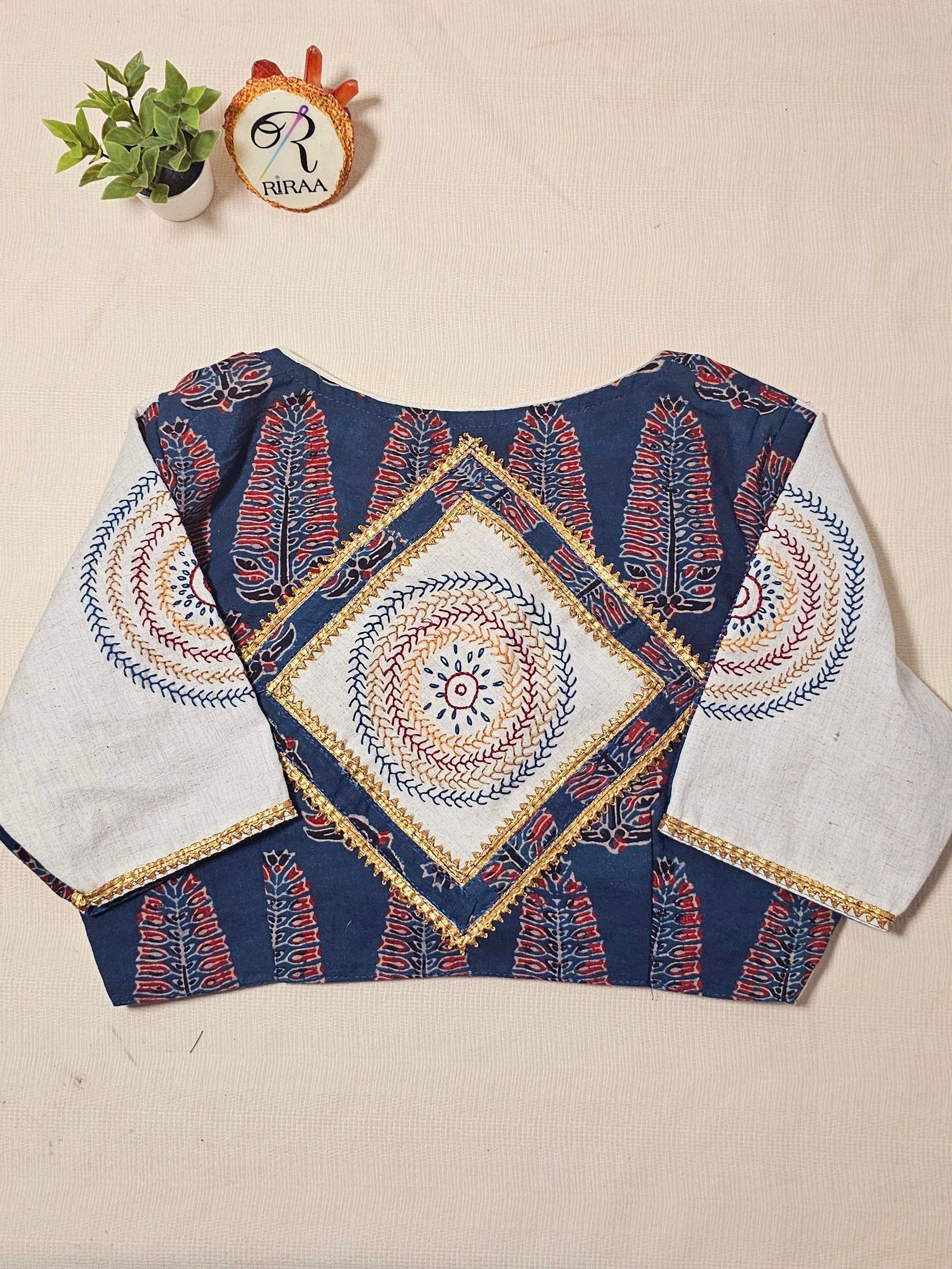 The 'MANDARIKA' blouse intricately blends the mesmerizing beauty of mandala designs with the delicate artistry of appliqué work, accentuated by the intricate charm of gotapatti embellishments. Adorned with meticulous hand-embroidered details, it stands as a wearable masterpiece that radiates elegance and cultural richness.