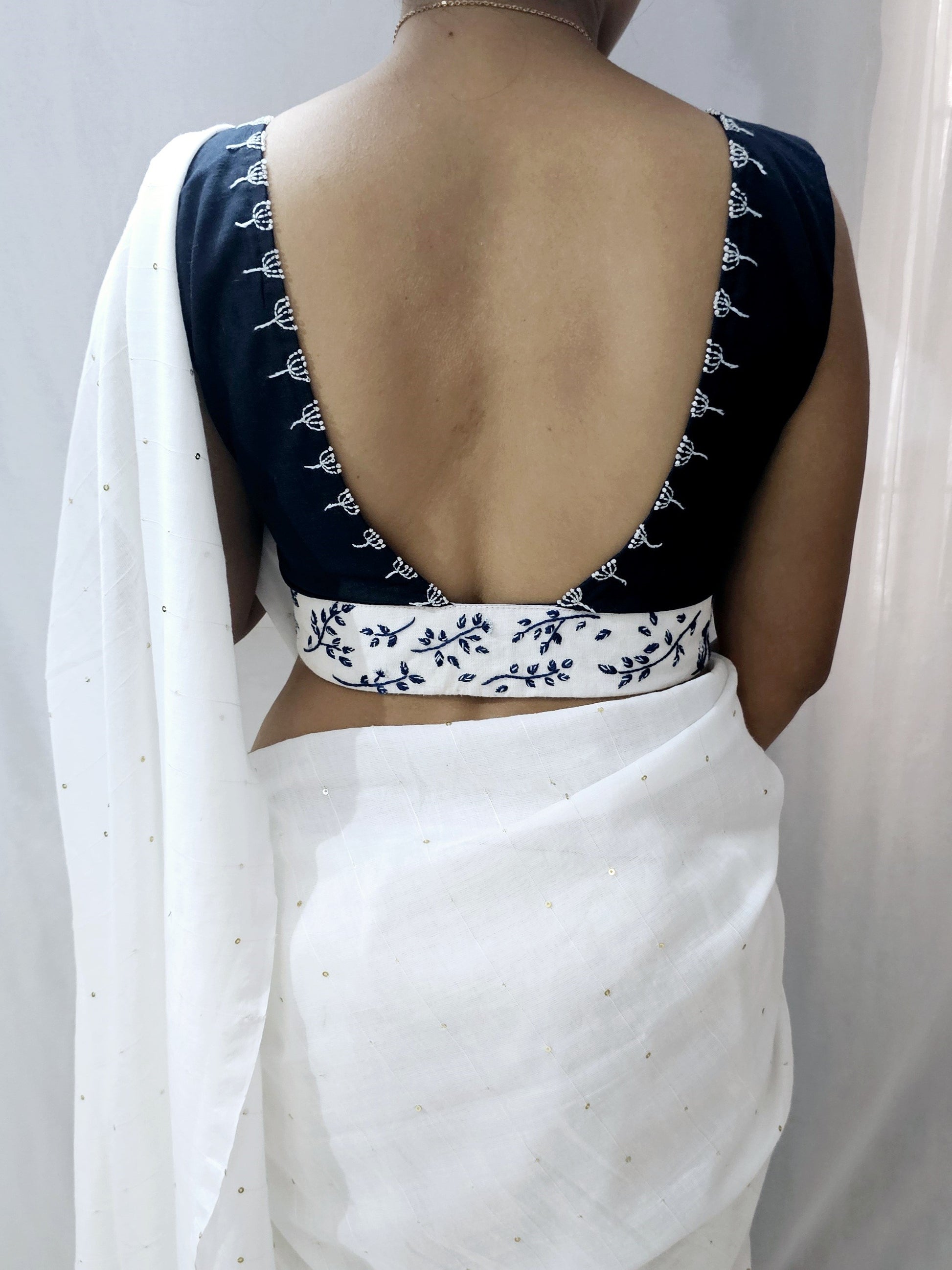 Introducing the "Neel Blouse" – a wearable masterpiece that seamlessly merges nature's beauty with timeless elegance. Hand-embroidered leaf motifs and delicate beadwork at the neckline elevate this blouse to a whole new level of sophistication. Wherever you go, expect all eyes to be on you as you effortlessly exude chic style and artisanal glamour in this standout wardrobe essential.