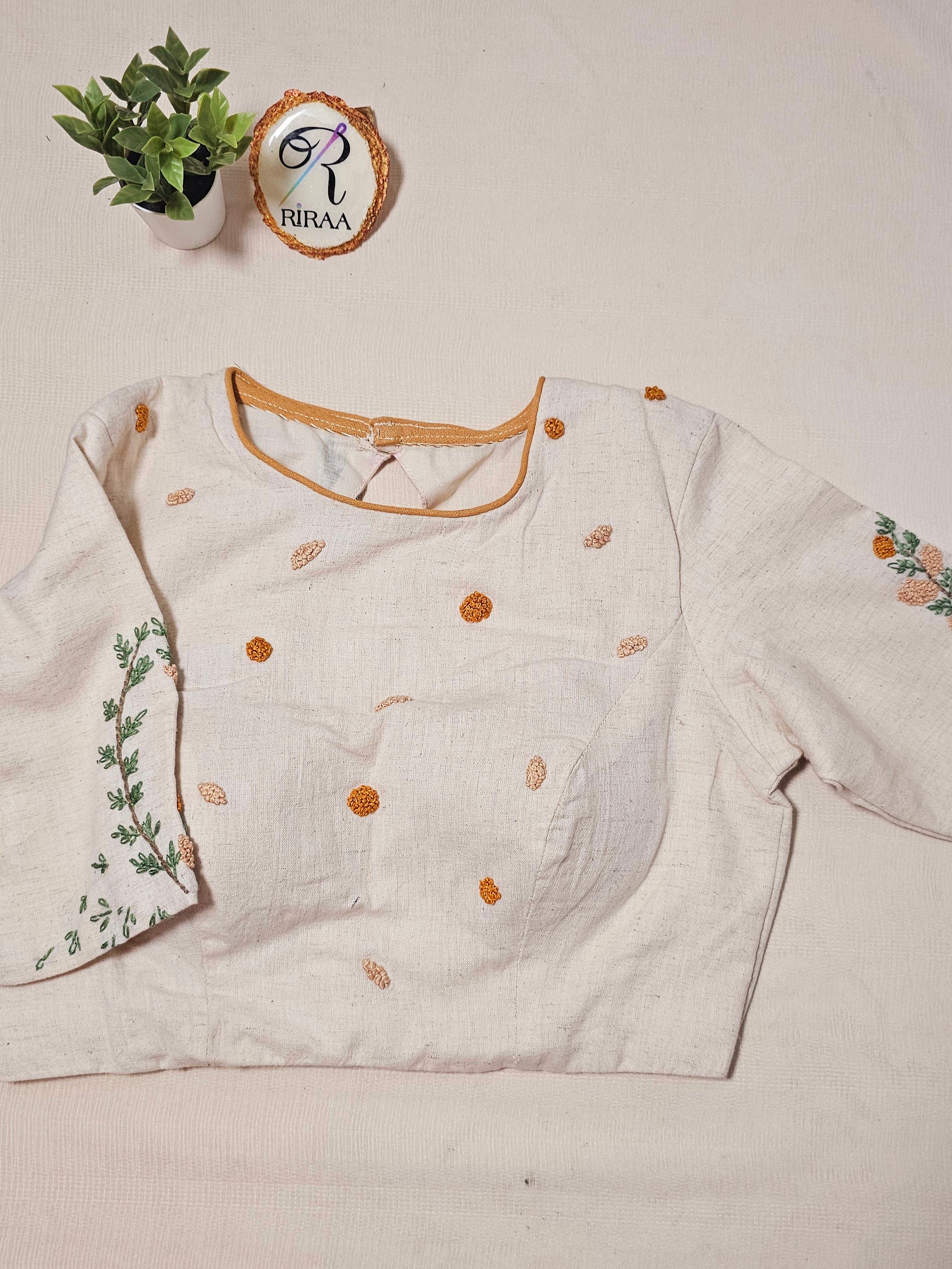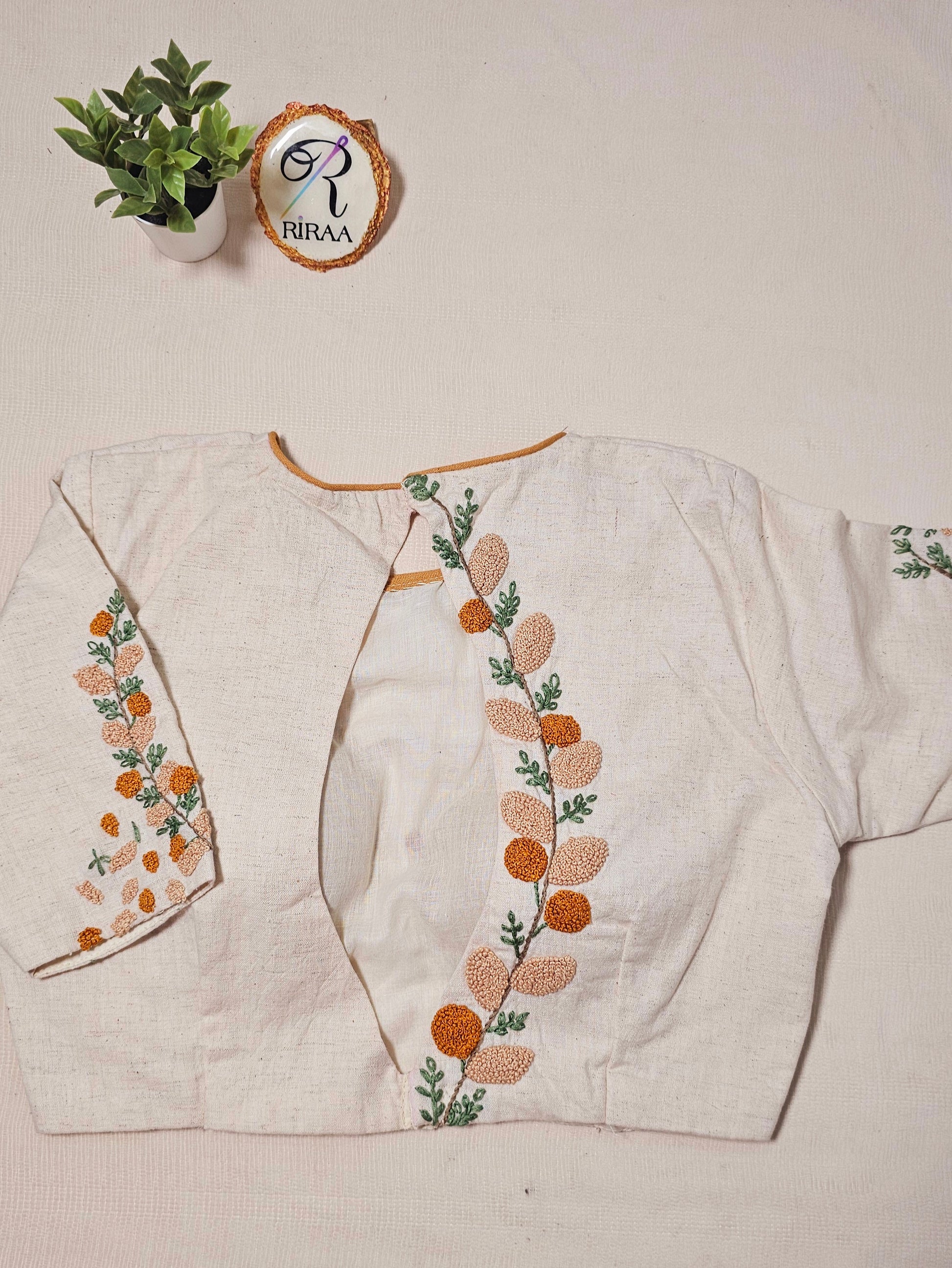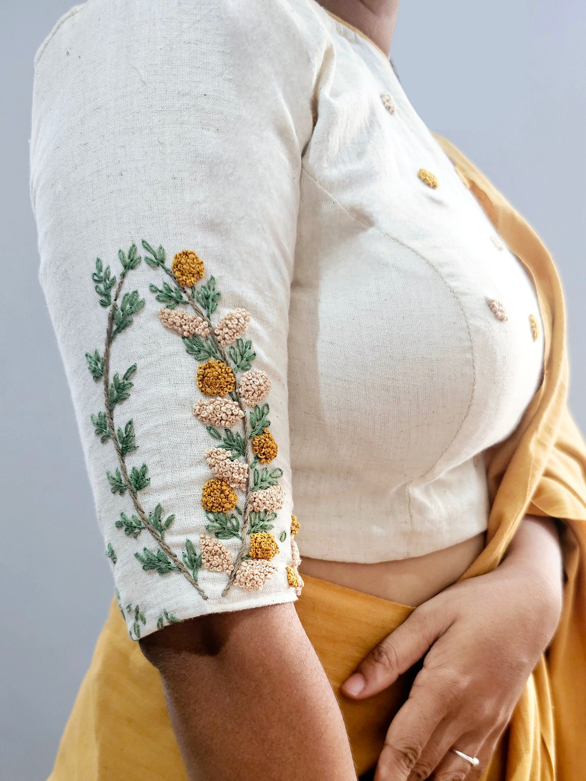 Introducing the "Madhrima blouse", our premium breathtaking masterpiece adorned with exquisite floral hand embroidery, where each delicate stitch illuminates the fabric with timeless elegance. Crafted with meticulous attention to detail, this blouse radiates sophistication and grace, ensuring you stand out with effortless beauty on any occasion. Elevate your ensemble with the "Madhurima blouse" and let its captivating floral motifs enchant and inspire every glance.