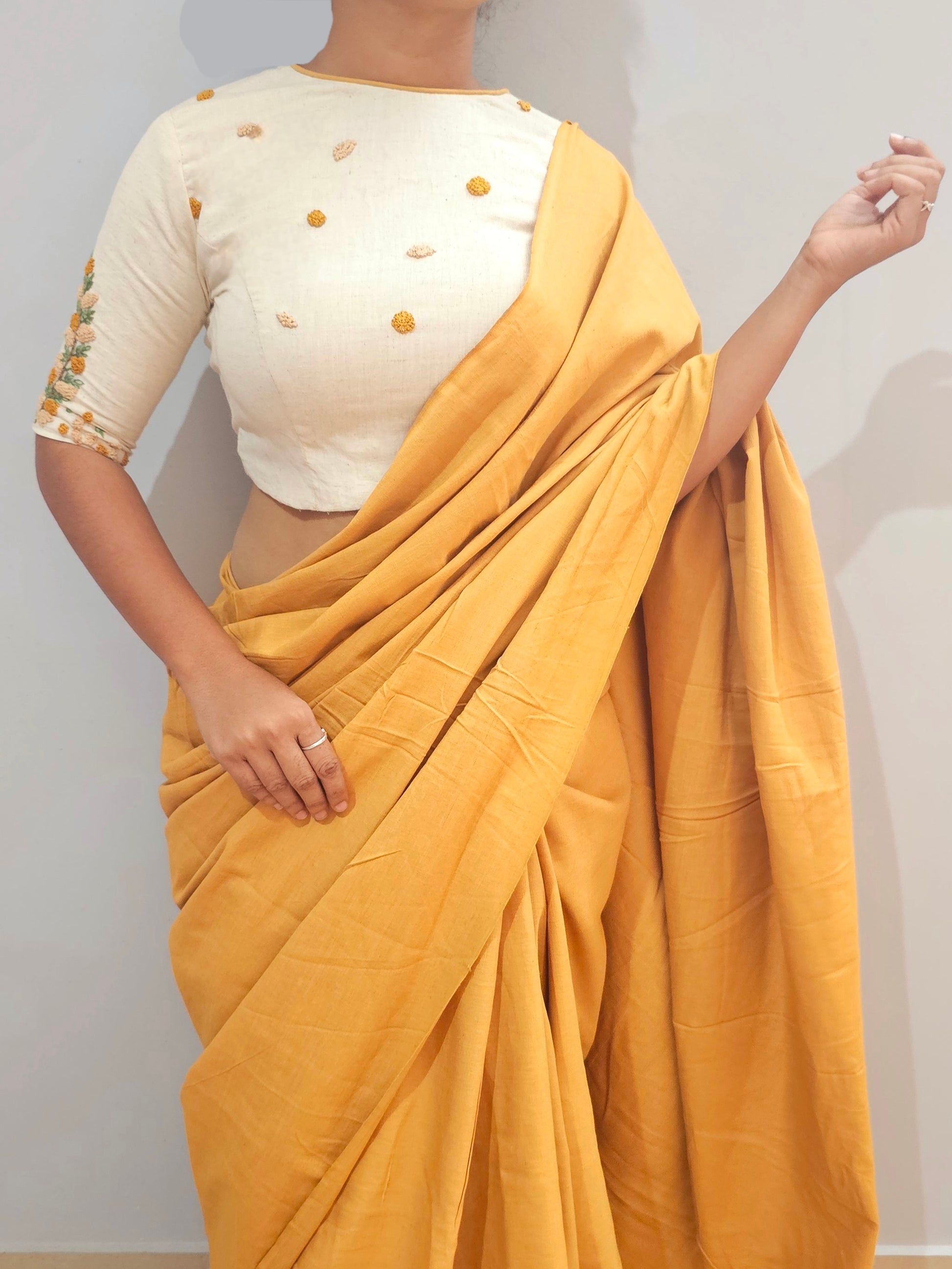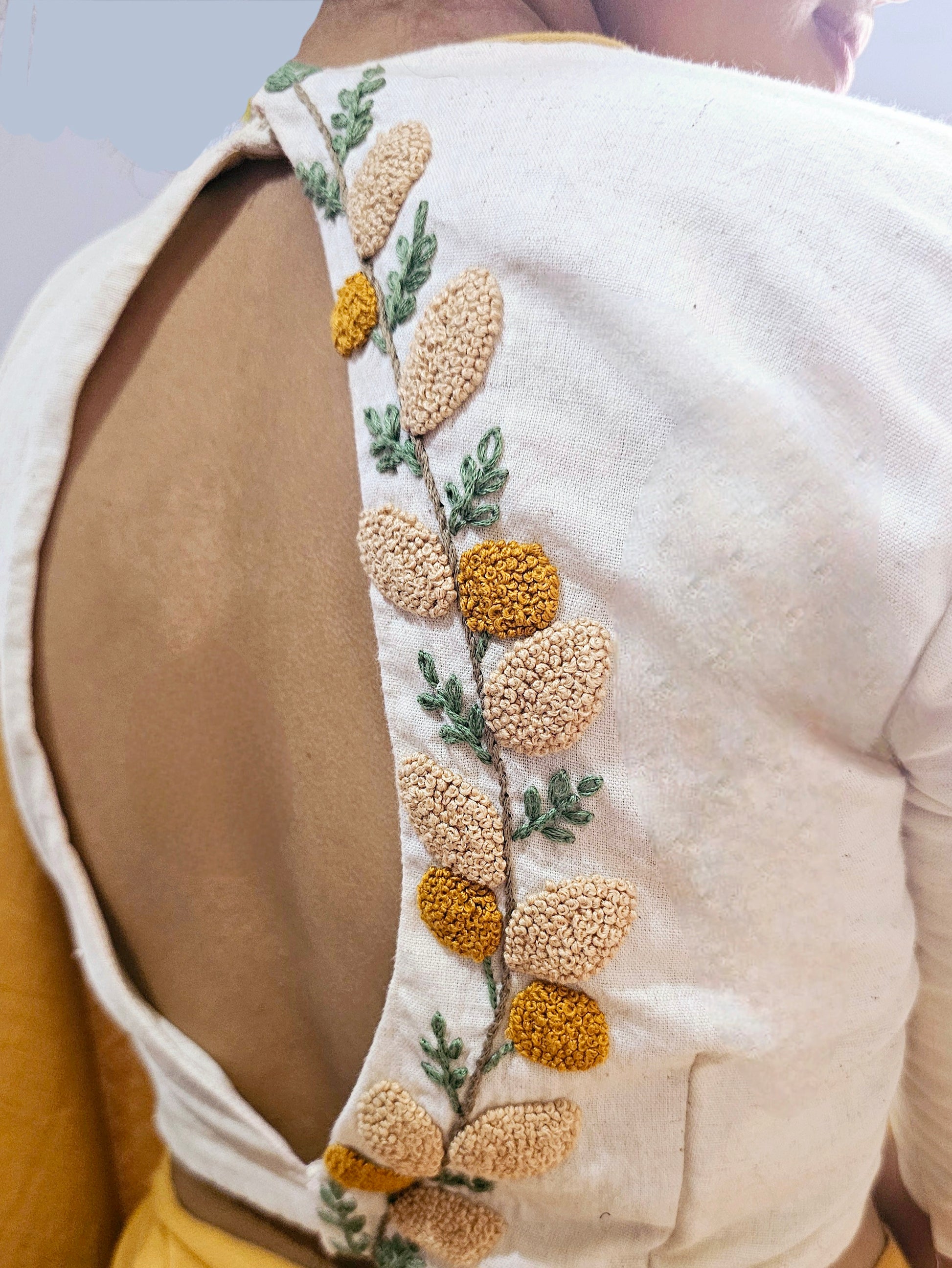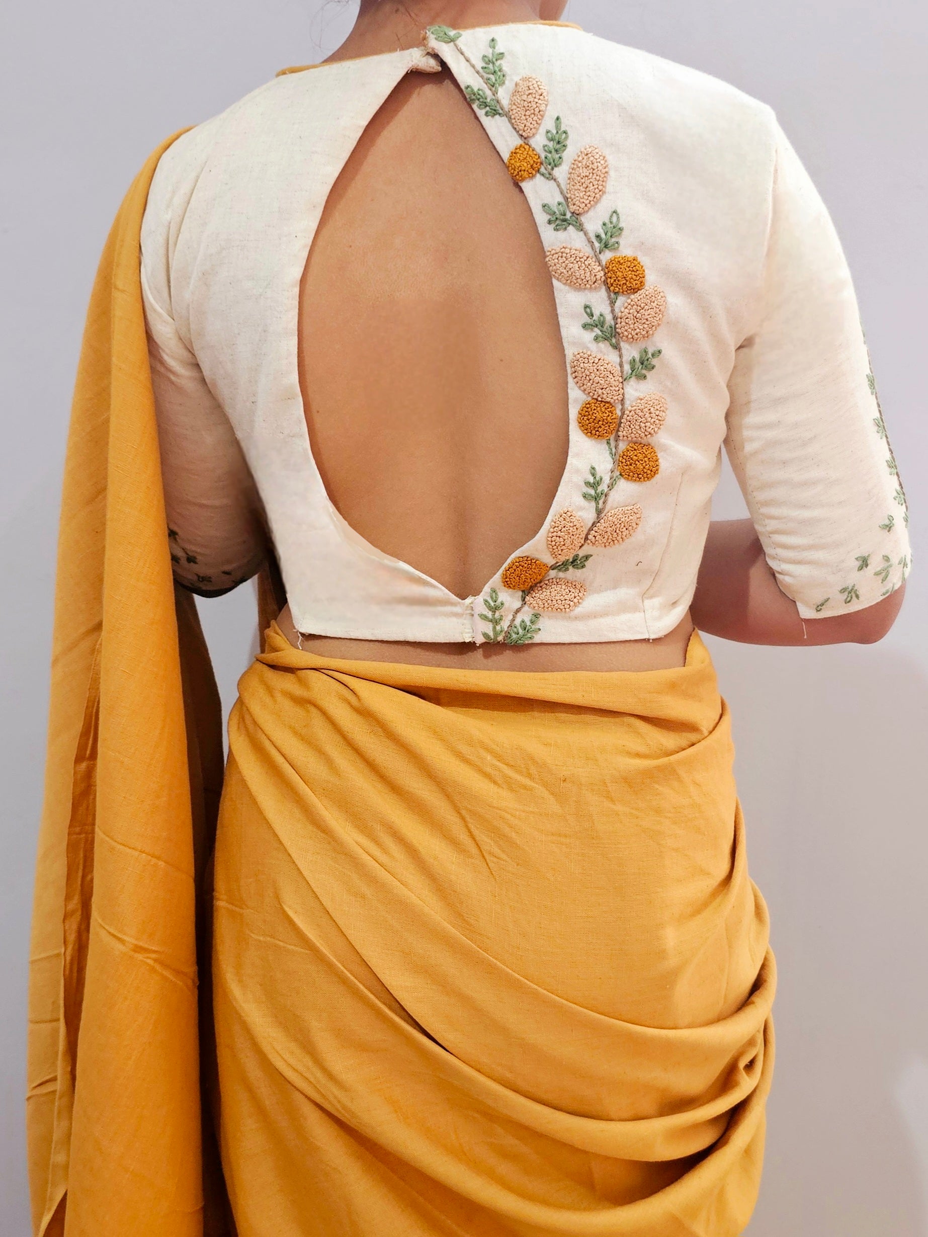 Introducing the "Madhrima blouse", our premium breathtaking masterpiece adorned with exquisite floral hand embroidery, where each delicate stitch illuminates the fabric with timeless elegance. Crafted with meticulous attention to detail, this blouse radiates sophistication and grace, ensuring you stand out with effortless beauty on any occasion. Elevate your ensemble with the "Madhurima blouse" and let its captivating floral motifs enchant and inspire every glance.