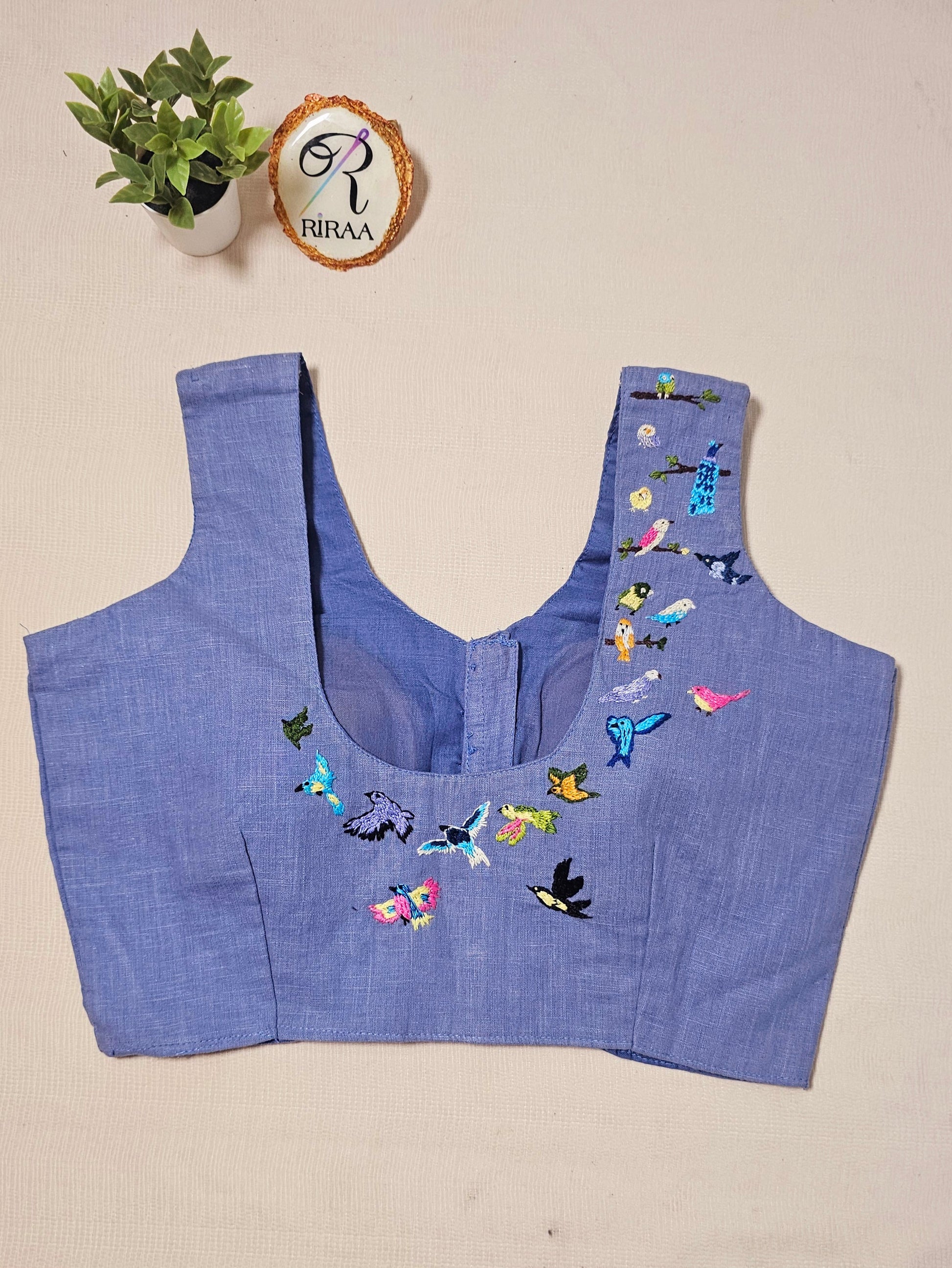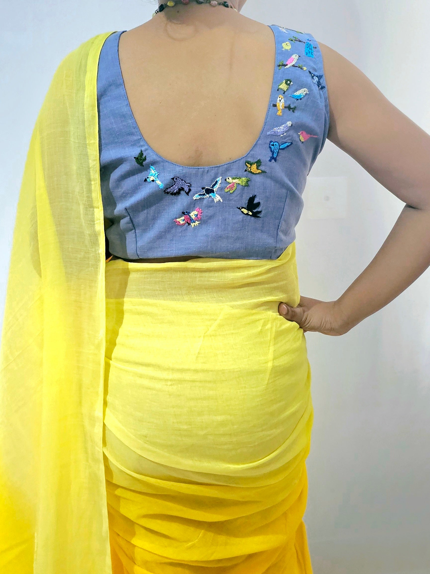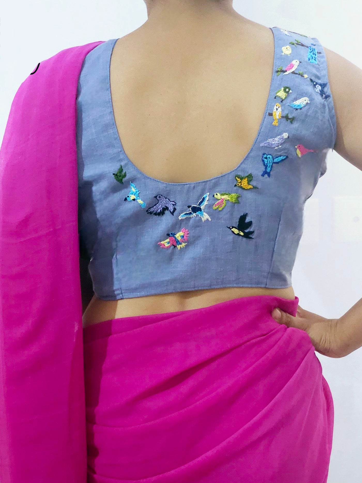 Embark on a journey of style and grace with the "Pakshi Pravah" blouse, where handcrafted birds soar across the fabric, lending a sense of whimsy and elegance to your look. Each intricately embroidered motif tells a story of freedom and beauty, making this blouse a captivating addition to any wardrobe.