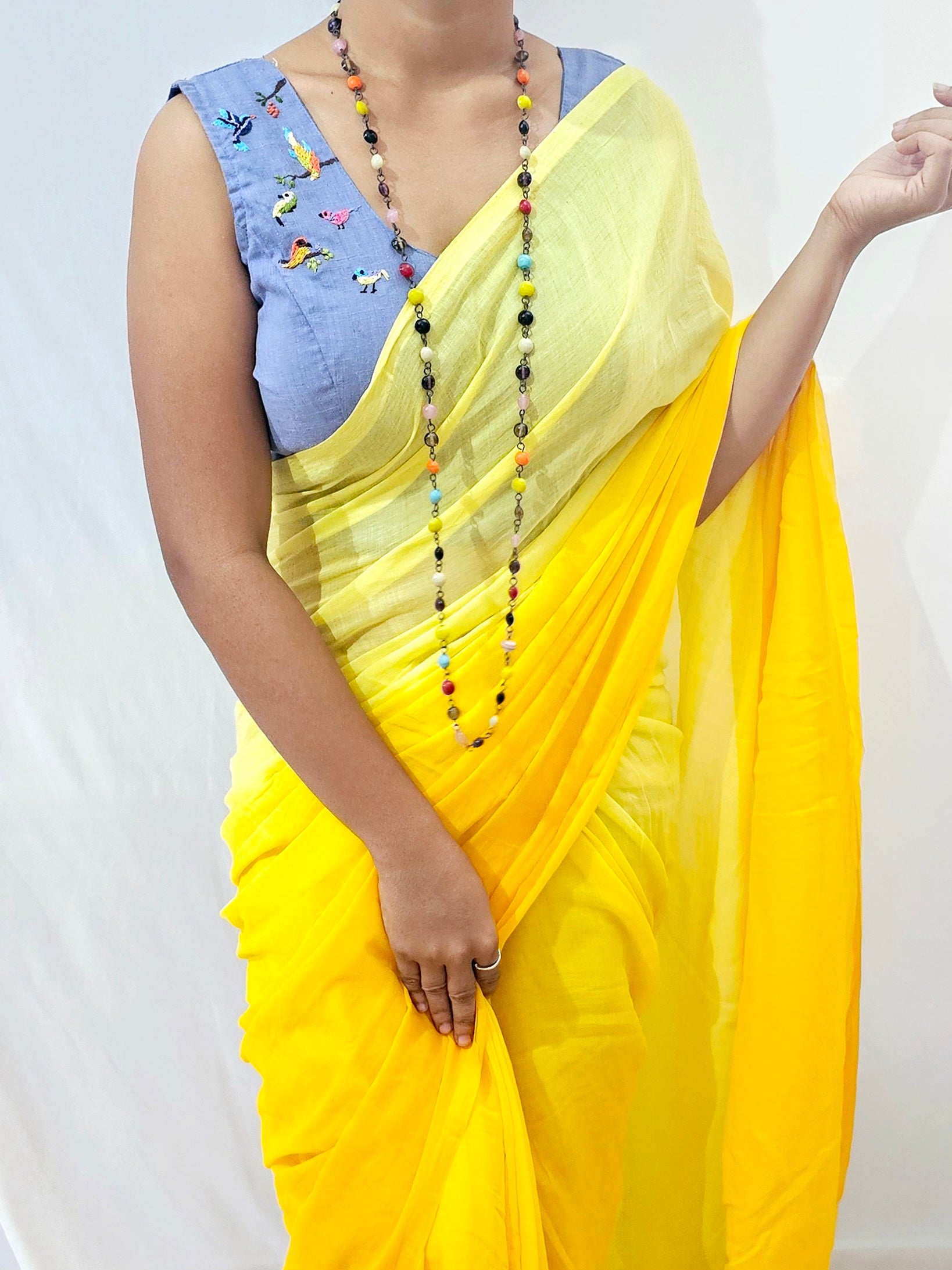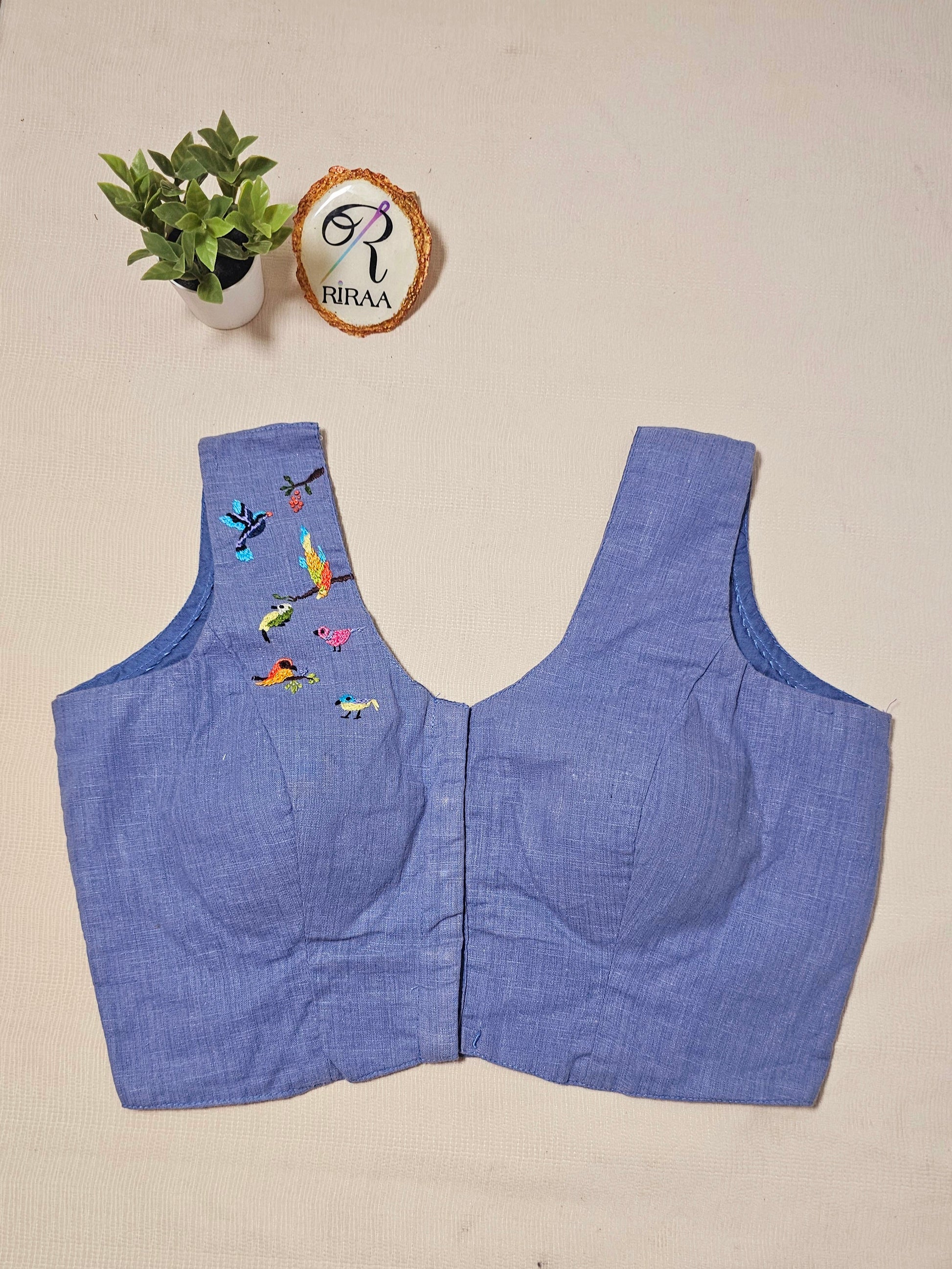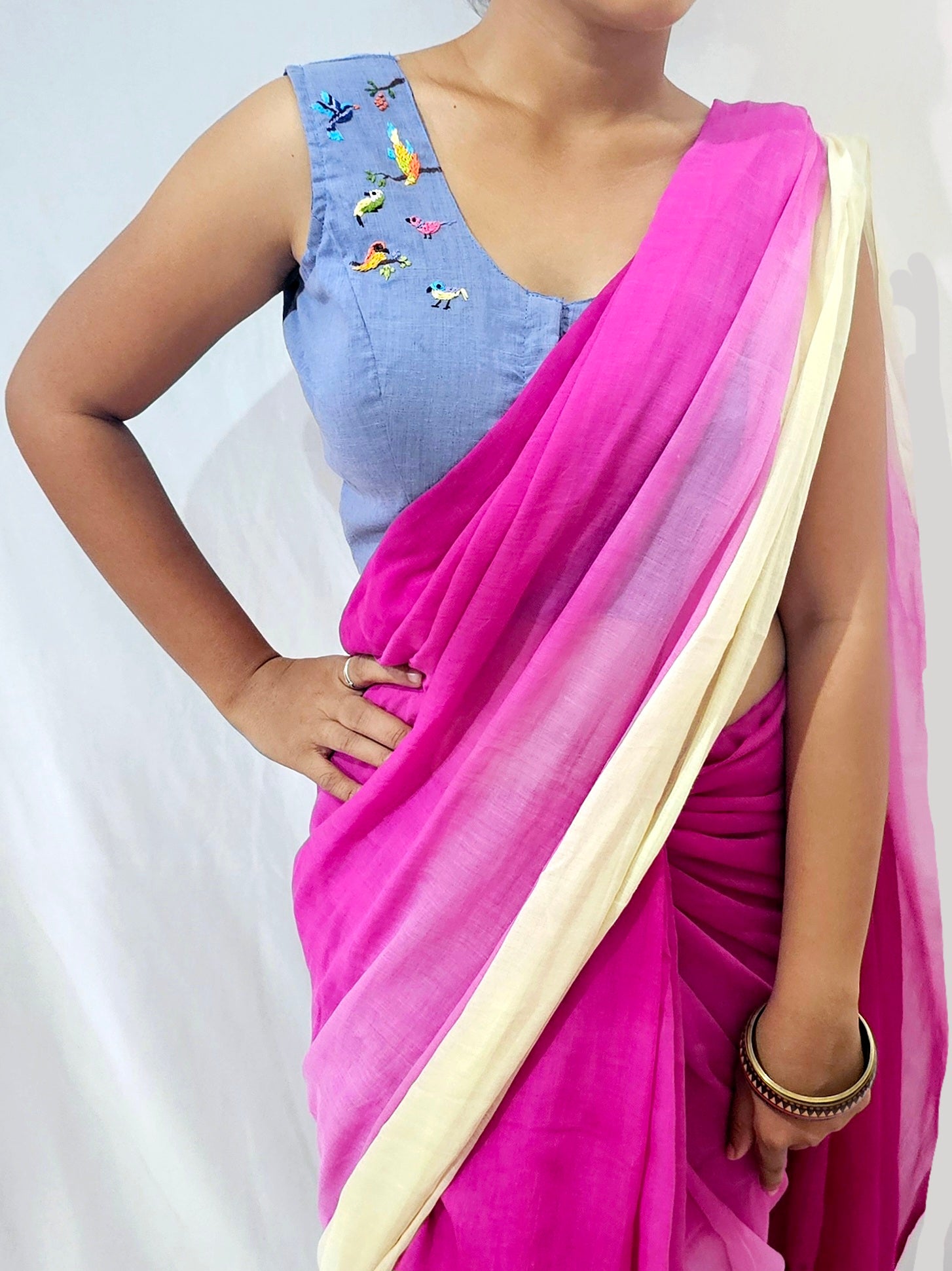 Embark on a journey of style and grace with the "Pakshi Pravah" blouse, where handcrafted birds soar across the fabric, lending a sense of whimsy and elegance to your look. Each intricately embroidered motif tells a story of freedom and beauty, making this blouse a captivating addition to any wardrobe.