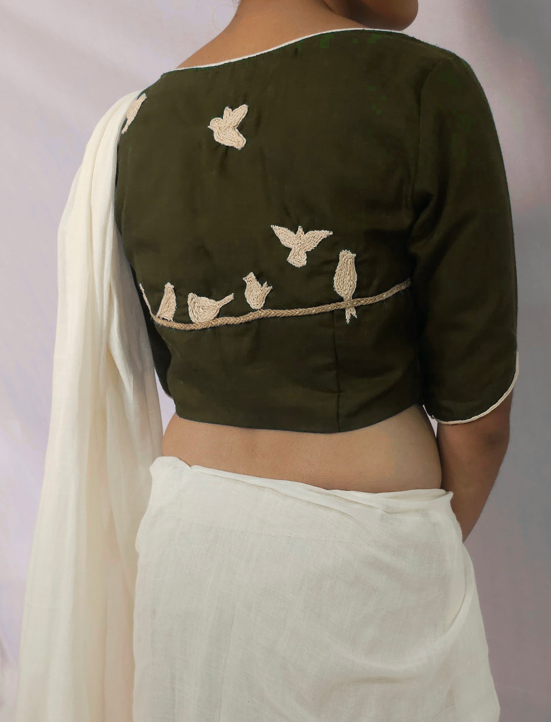 The Pankhuri Blouse brings nature's serenity to your attire, with embroidered birds finding solace on a delicate rope, creating a graceful and captivating motif.