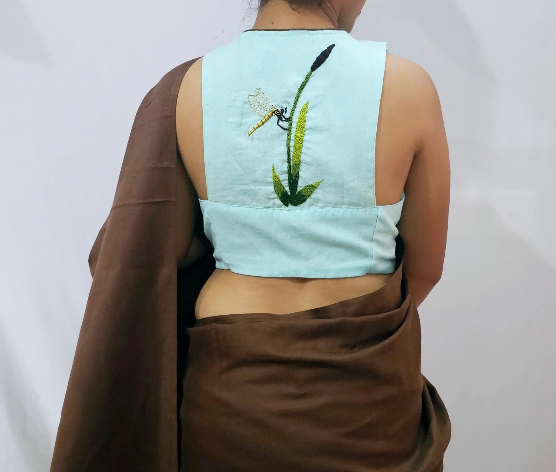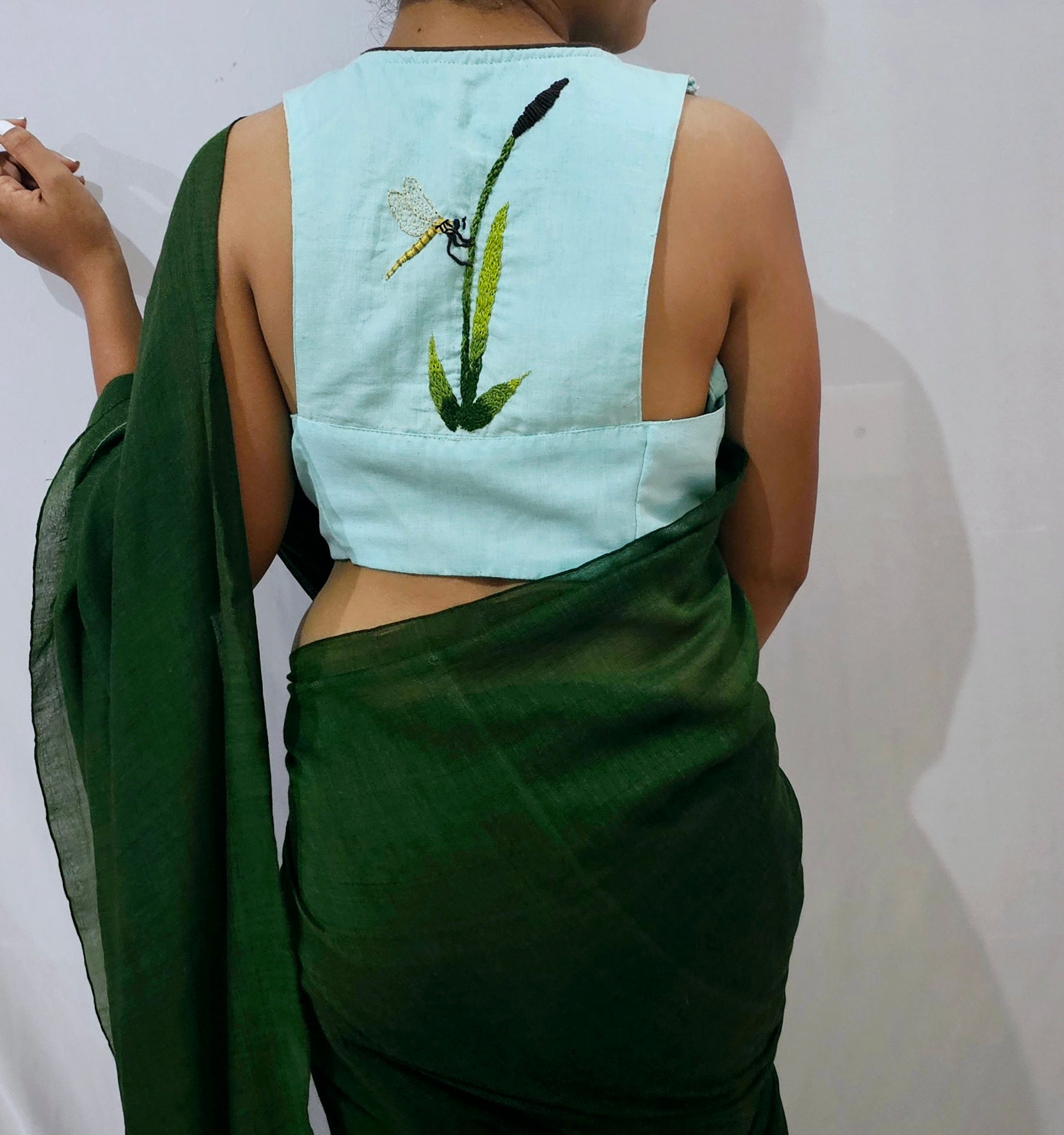 Introducing the Patanga Blouse, a celebration of nature's delicate beauty and artisanal craftsmanship. Featuring exquisite 3D hand-embroidered dragonfly motifs, this blouse brings a touch of whimsical elegance to any wardrobe. Its unique razor back pattern adds a modern edge, perfectly blending ethereal charm with contemporary style, making it a standout piece for those who appreciate intricate detail and timeless fashion.