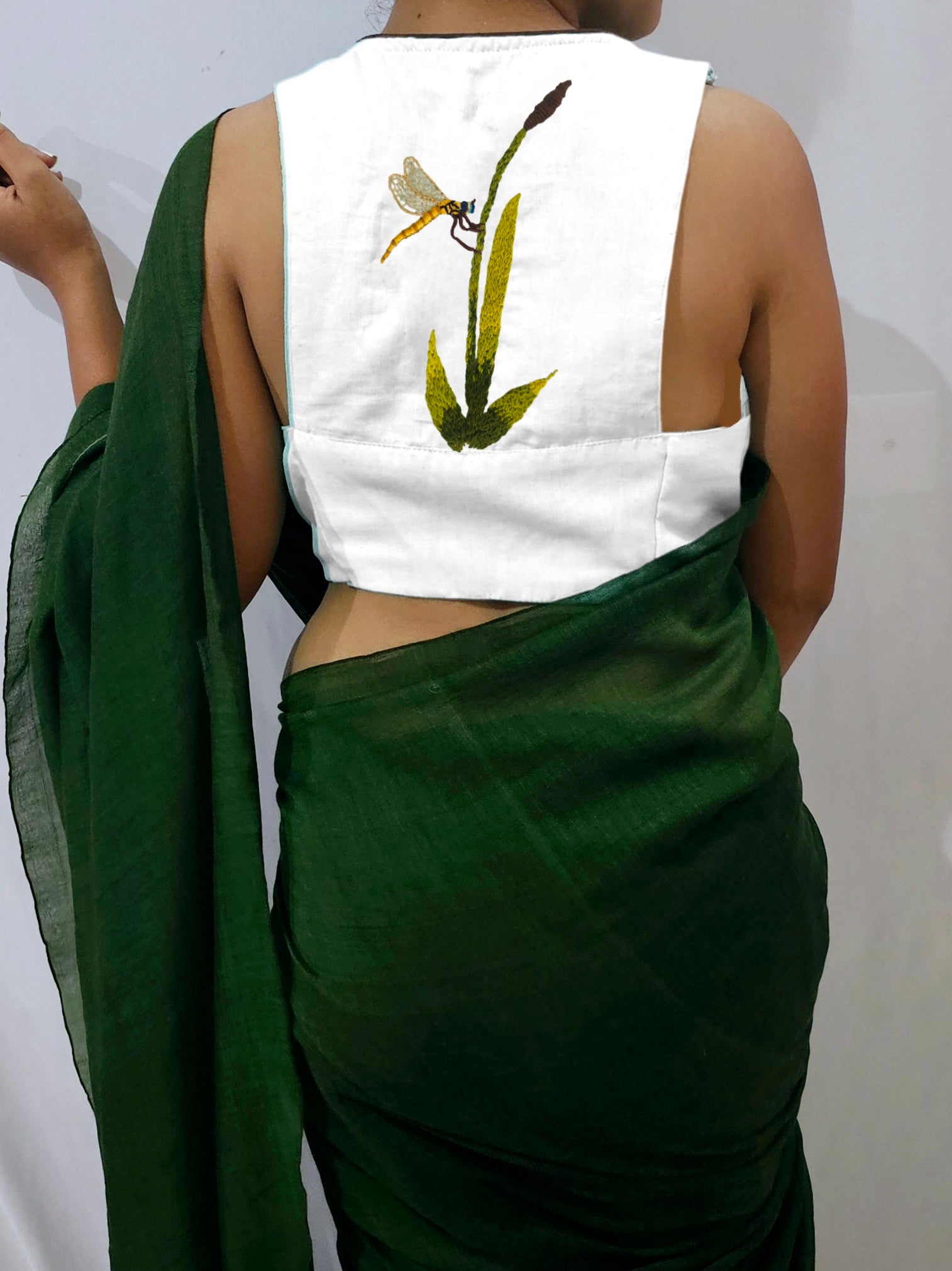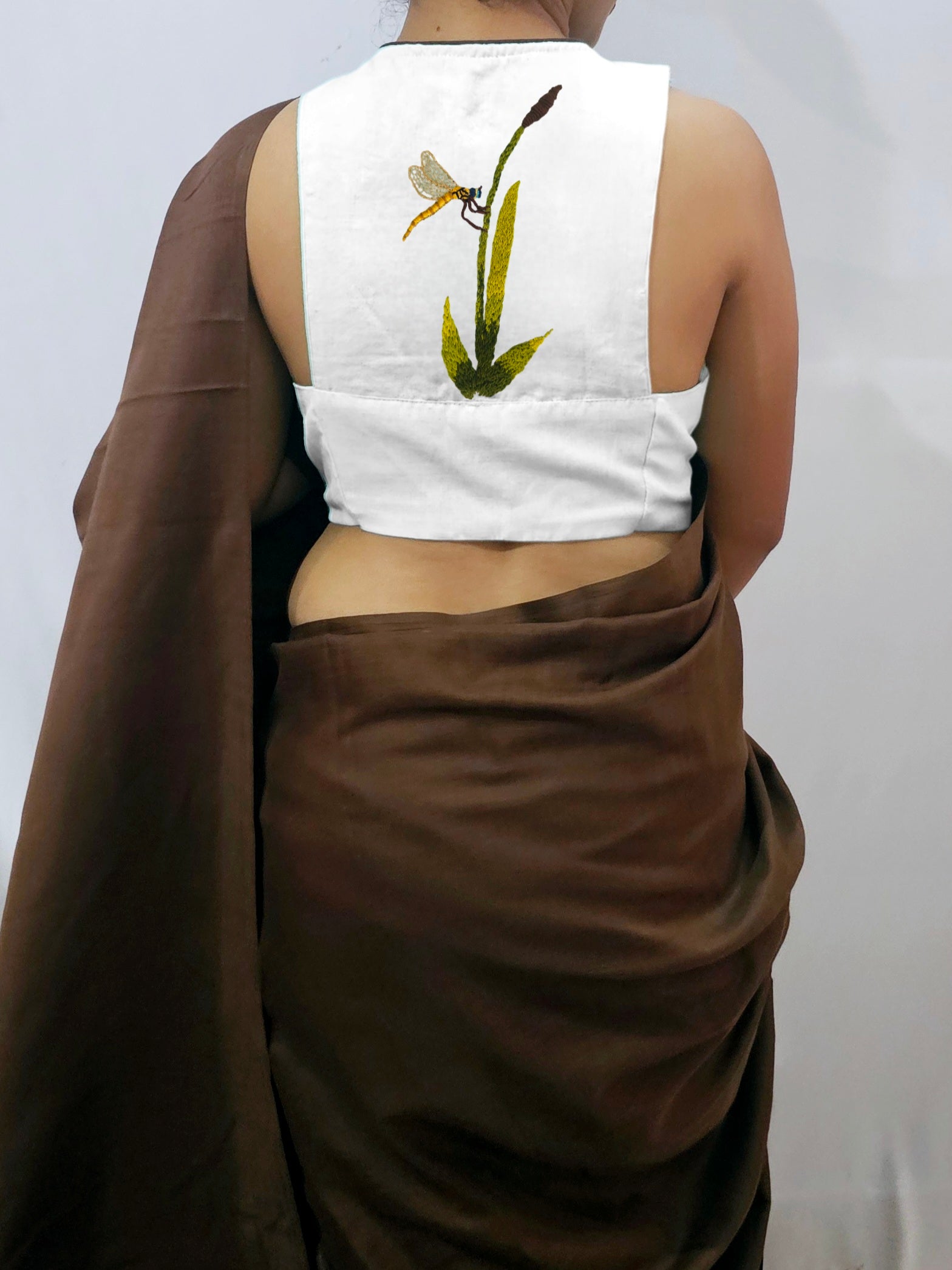 Introducing the Patanga Blouse, a celebration of nature's delicate beauty and artisanal craftsmanship. Featuring exquisite 3D hand-embroidered dragonfly motifs, this blouse brings a touch of whimsical elegance to any wardrobe. Its unique razor back pattern adds a modern edge, perfectly blending ethereal charm with contemporary style, making it a standout piece for those who appreciate intricate detail and timeless fashion.