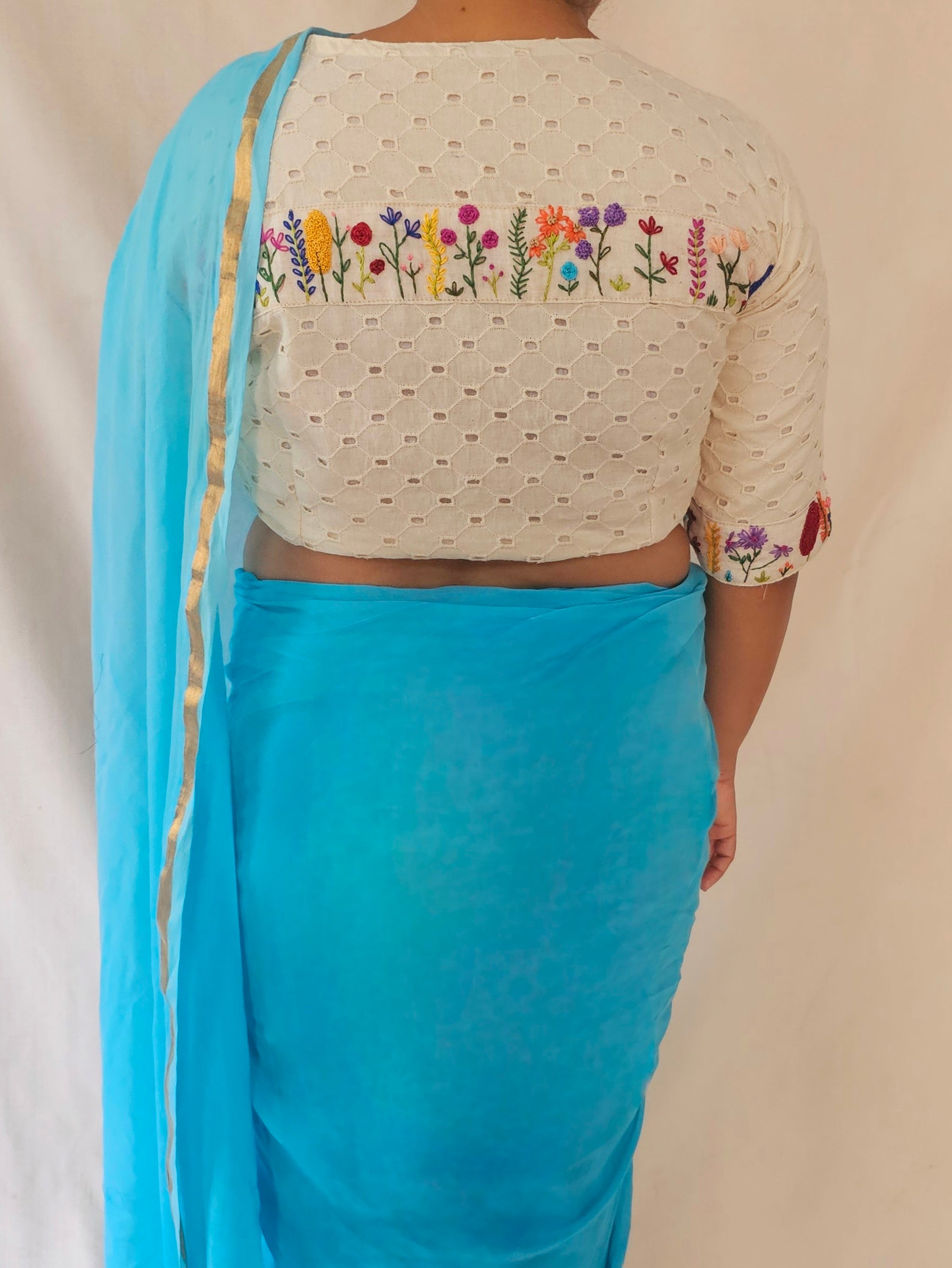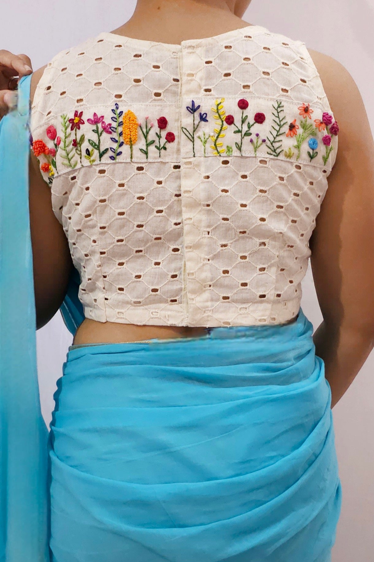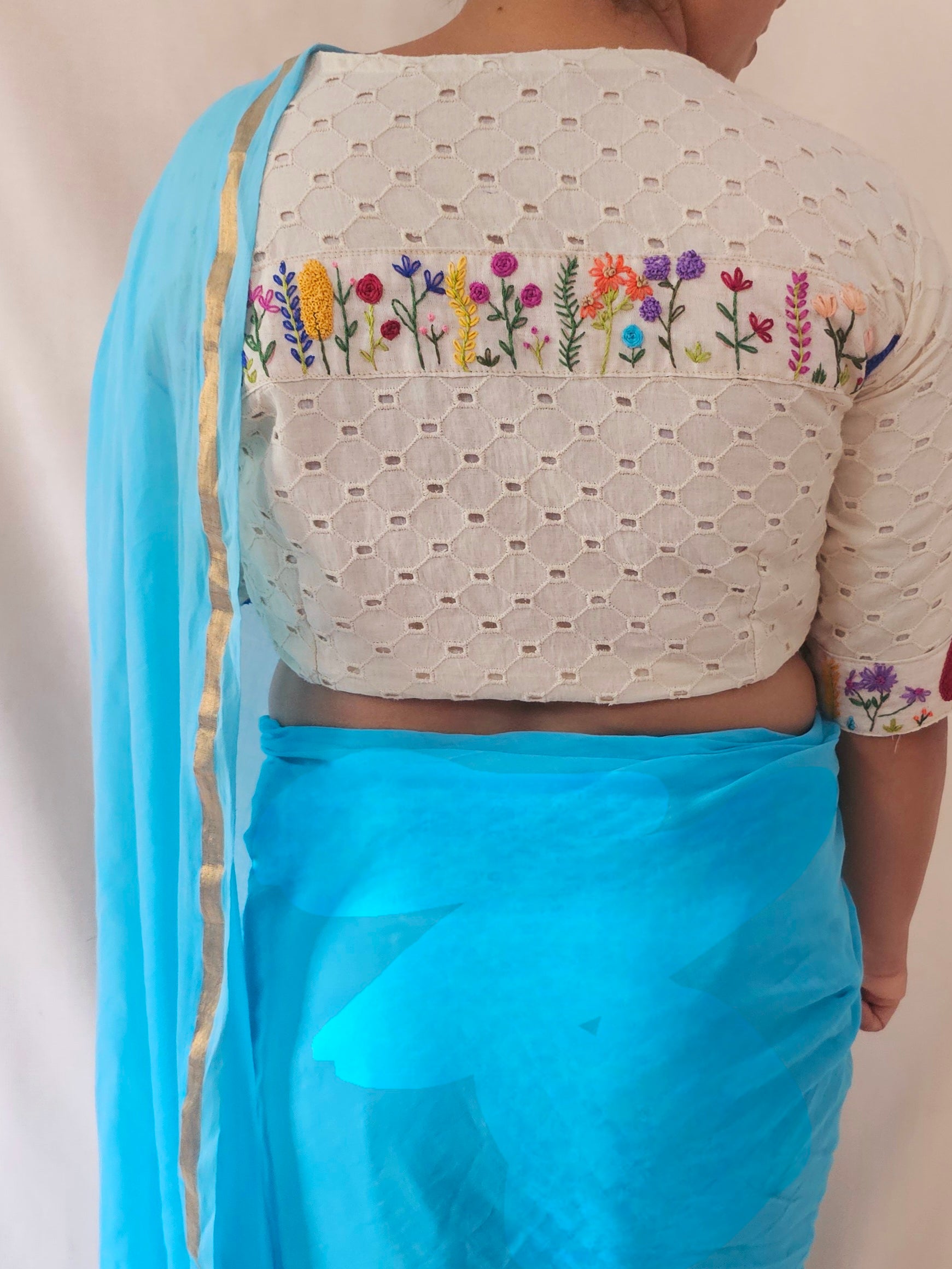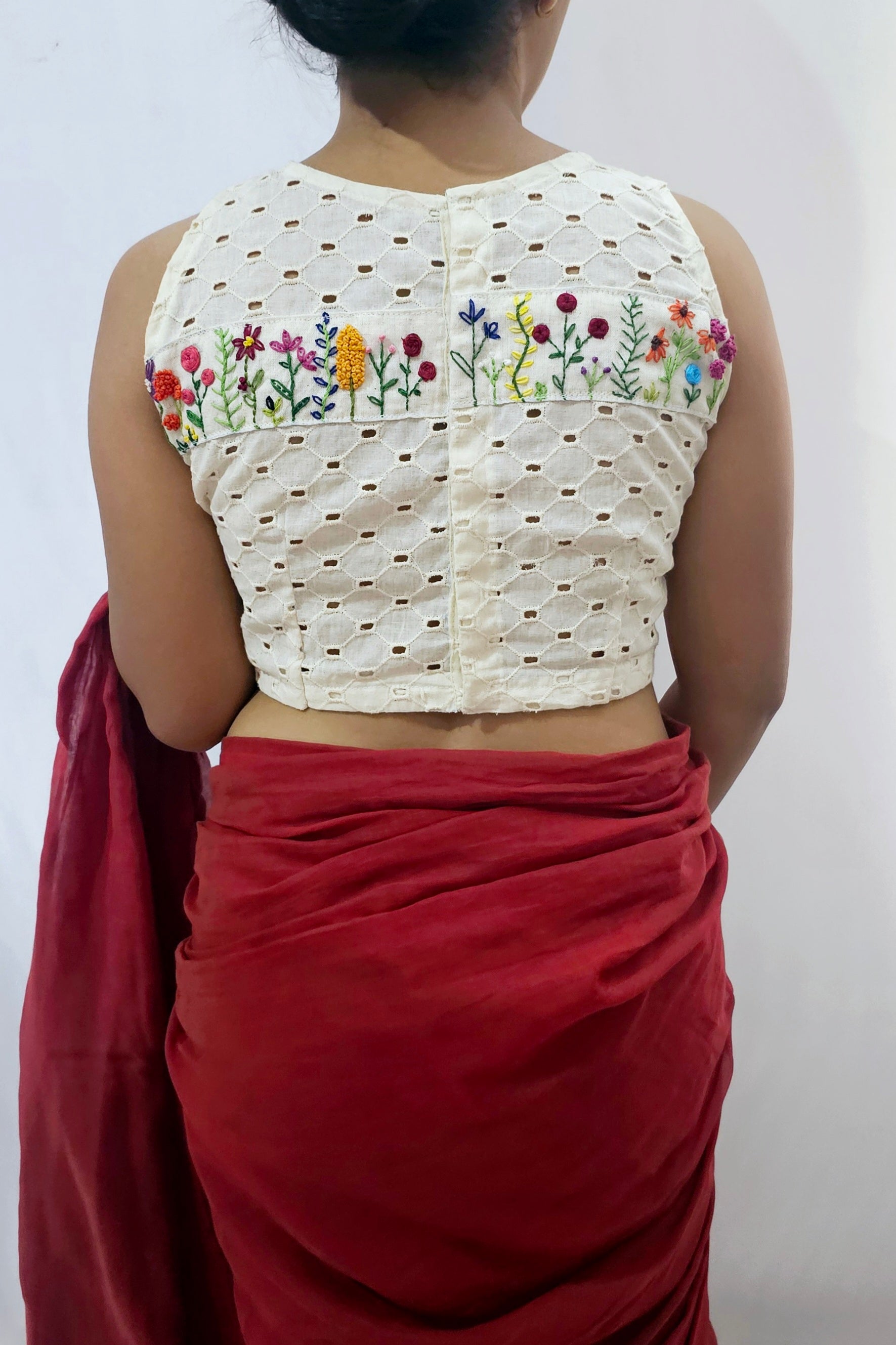 Introducing our 'Pushprang' blouse, meticulously handcrafted with an array of vibrant, multicolored flowers delicately embroidered onto soft fabric. This stunning piece seamlessly complements any saree, adding a burst of color and elegance to your ensemble. Whether you choose a classic silk saree or a contemporary georgette drape, the timeless beauty of the 'Pushprang' blouse effortlessly enhances your look, making it perfect for any occasion.