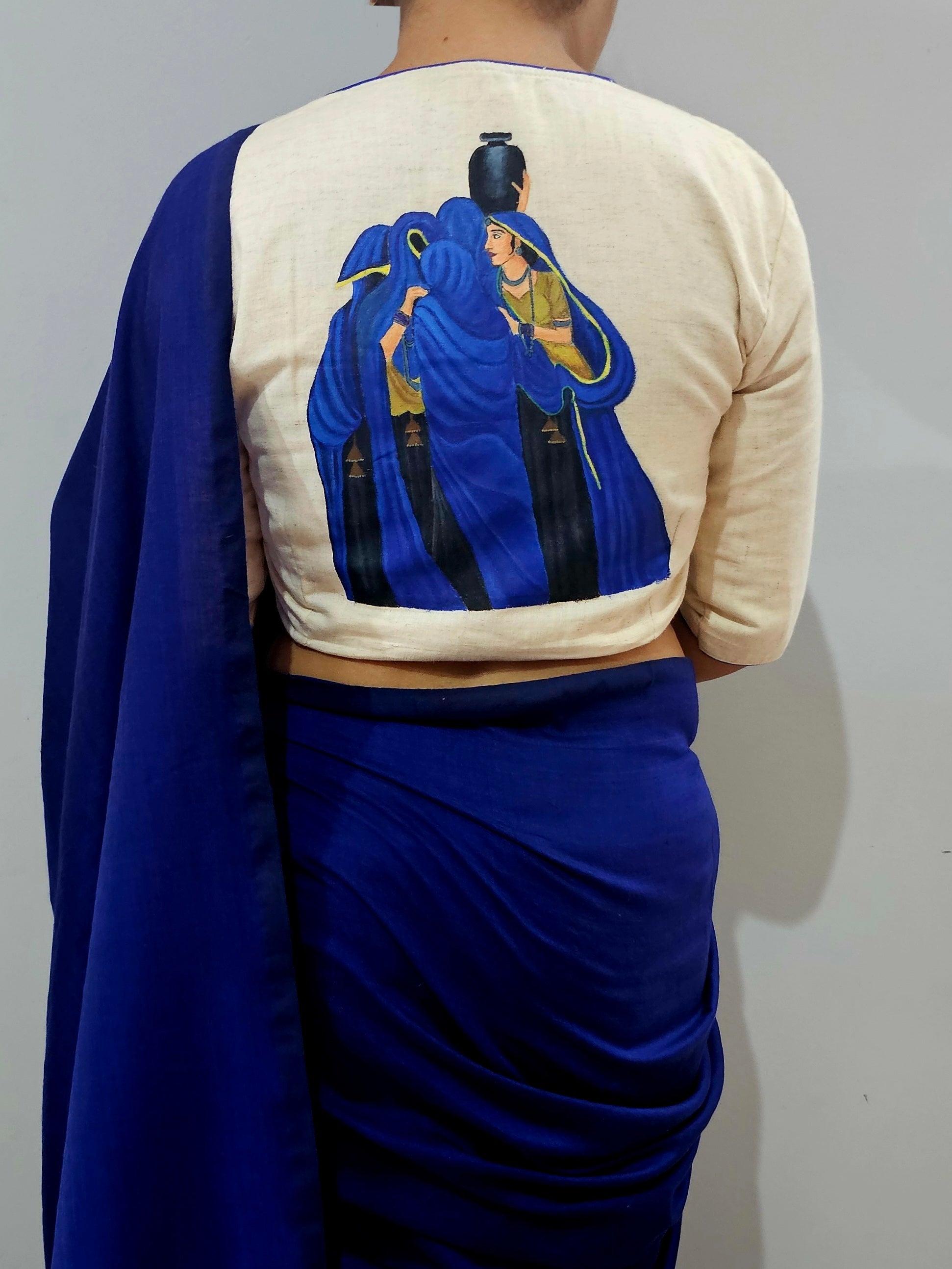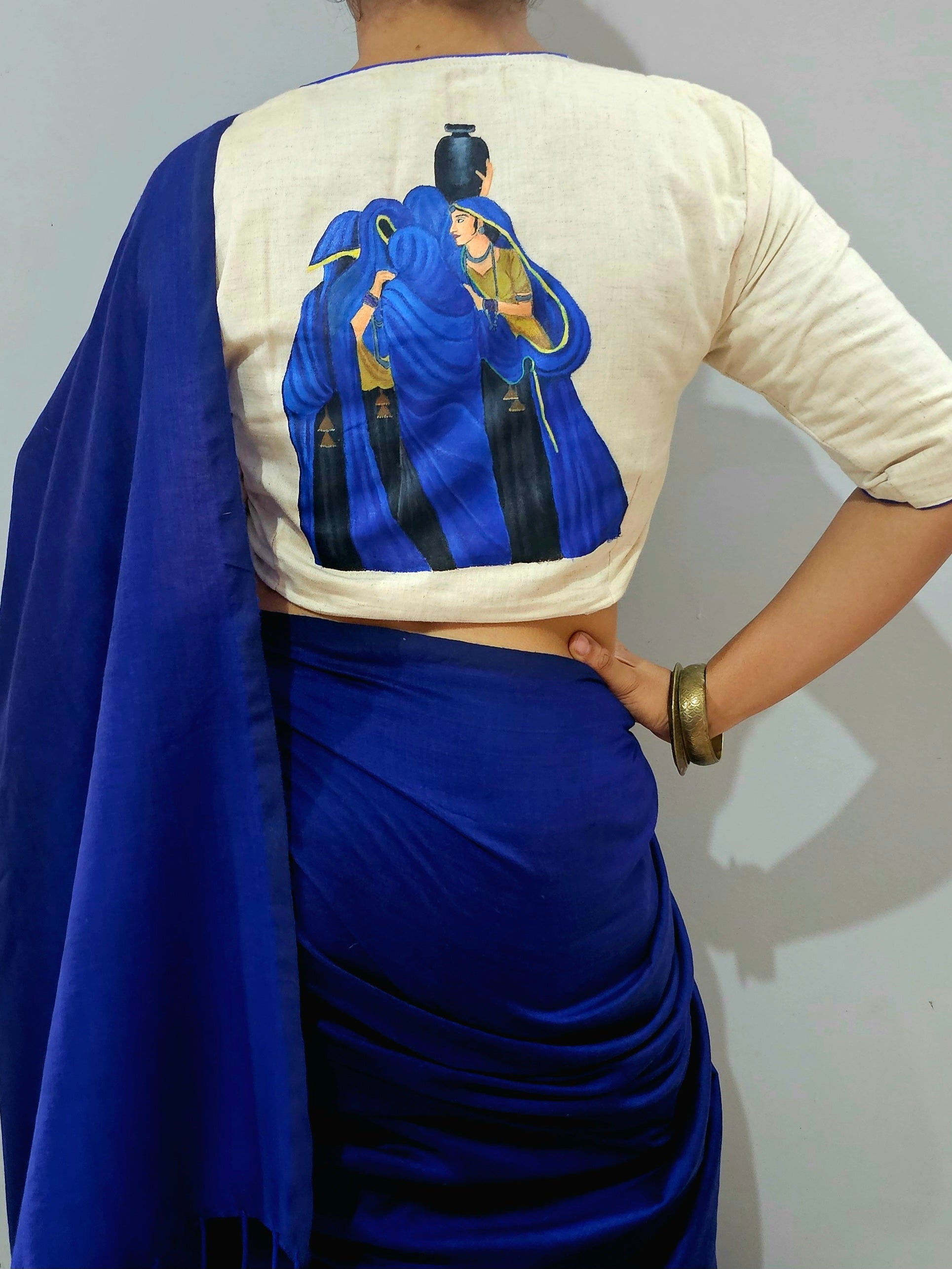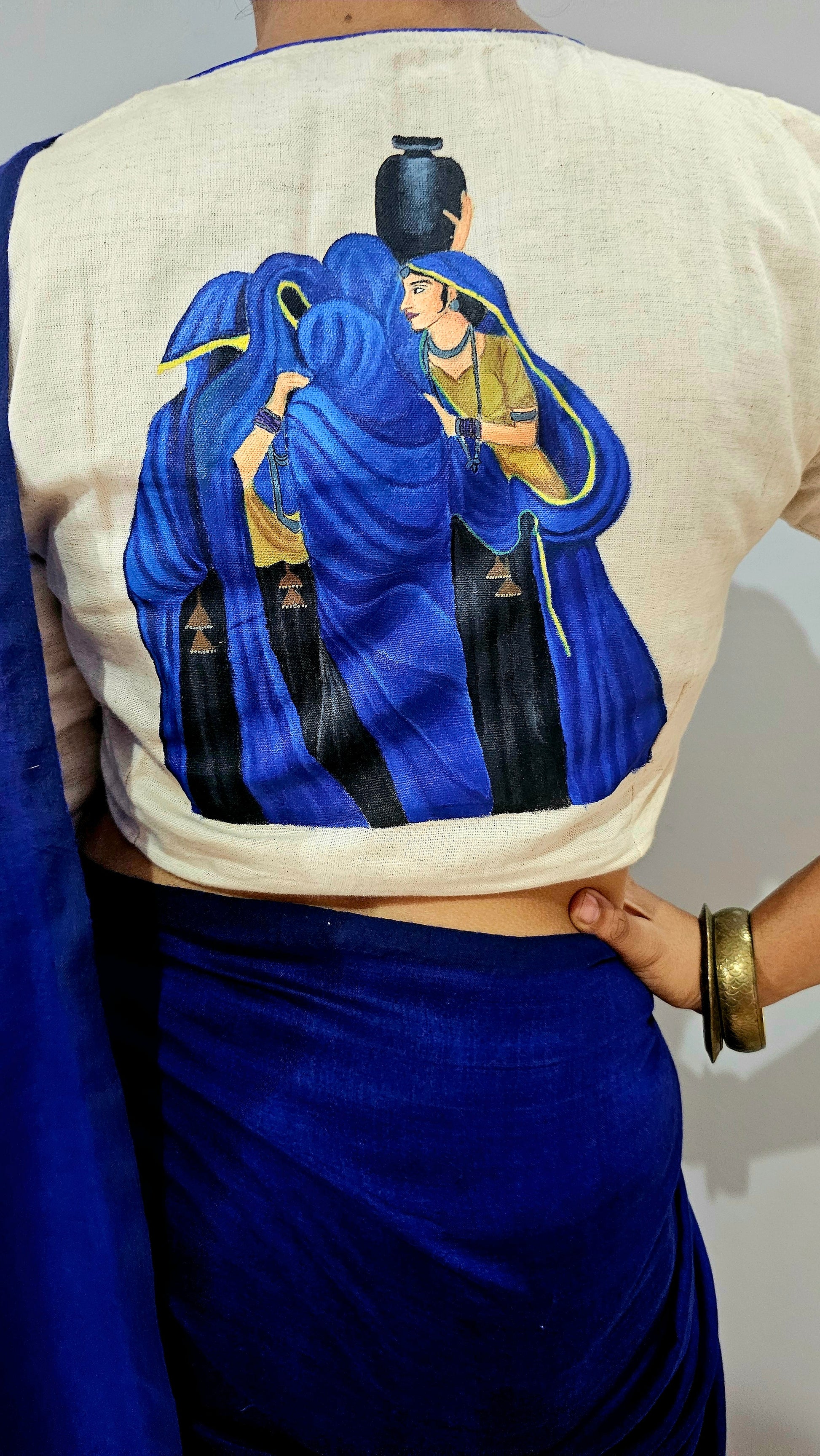 'Rural Charm Blouse' In every brushstroke, this blouse captures the essence of rural life, depicting hardworking women in their element. It's a wearable masterpiece, an ode to their enduring strength and refined charm.