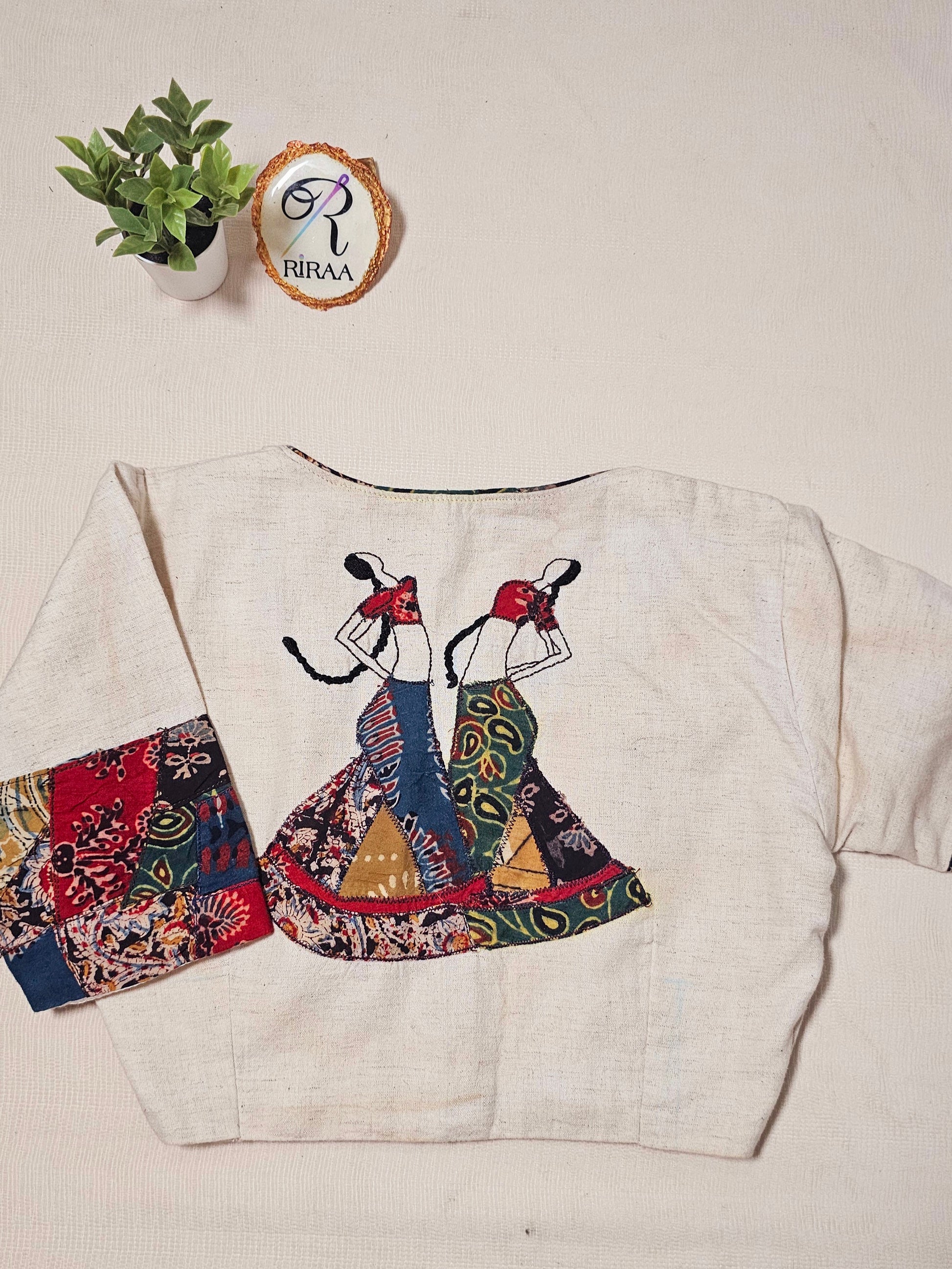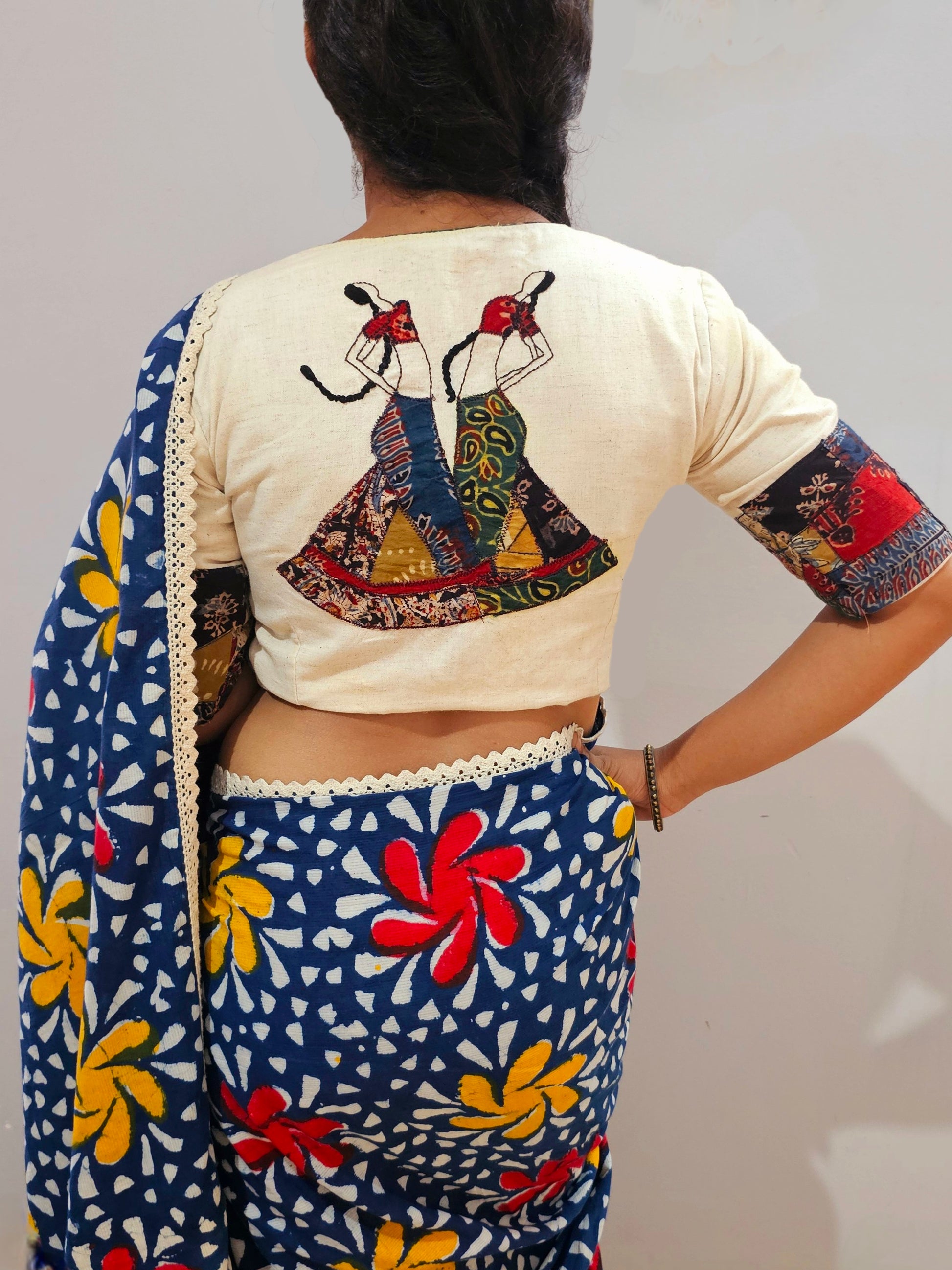 SAHELI BLOUSE Experience the harmonious blend of artistry and friendship with our Saheli blouse. Intricately embellished with hand embroidery and appliqué, this blouse showcases a captivating motif of two ladies dancing, symbolizing the beauty of shared moments and laughter.