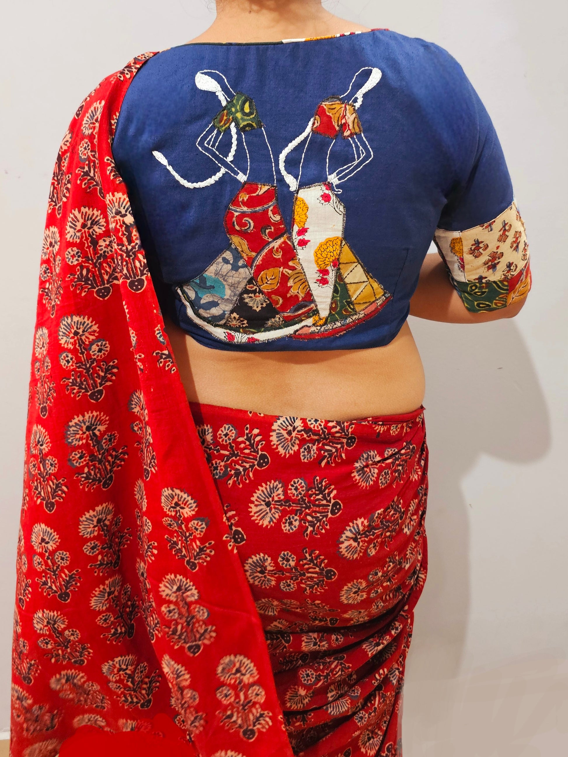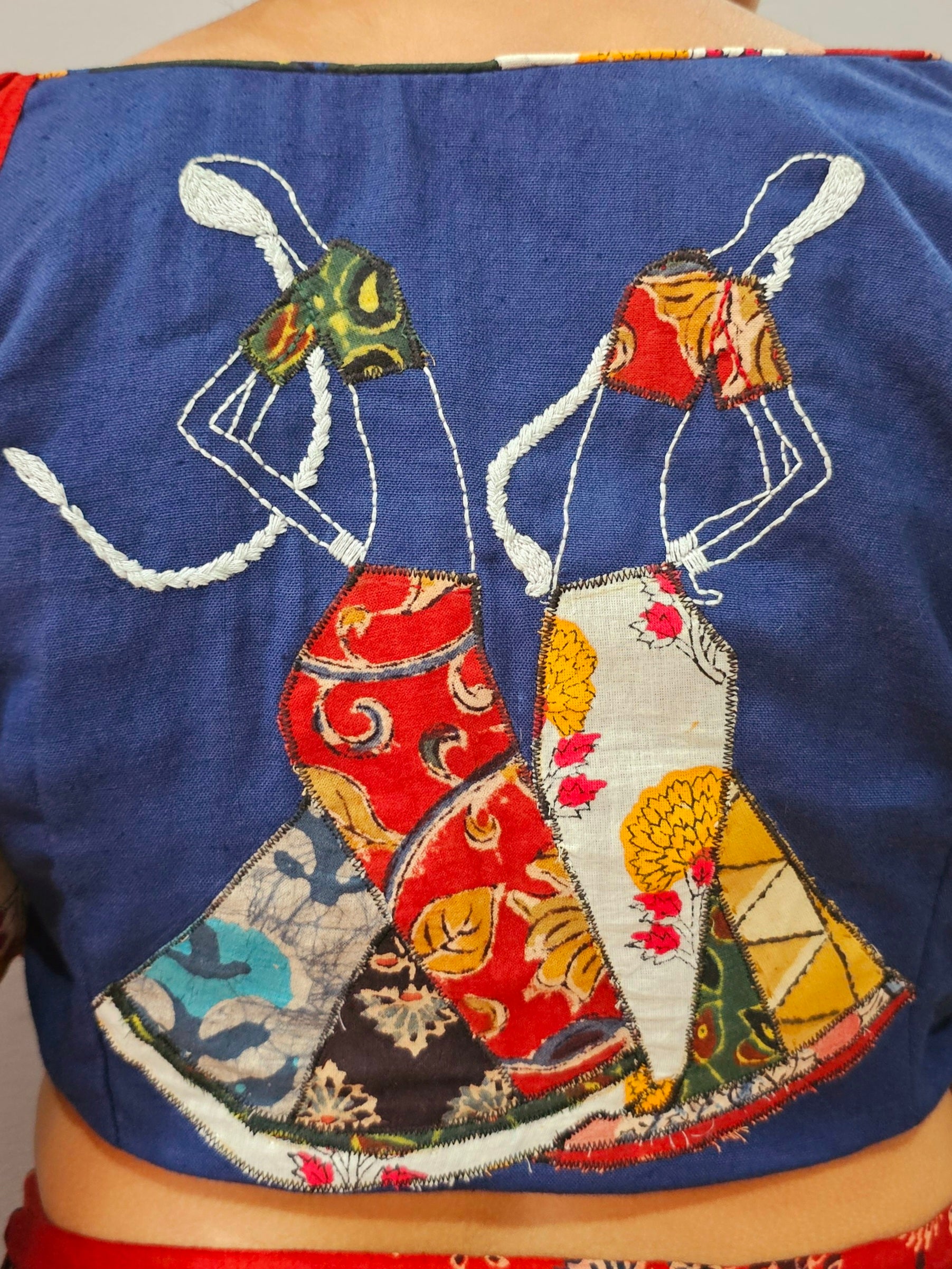 SAHELI BLOUSE Experience the harmonious blend of artistry and friendship with our Saheli blouse. Intricately embellished with hand embroidery and appliqué, this blouse showcases a captivating motif of two ladies dancing, symbolizing the beauty of shared moments and laughter.