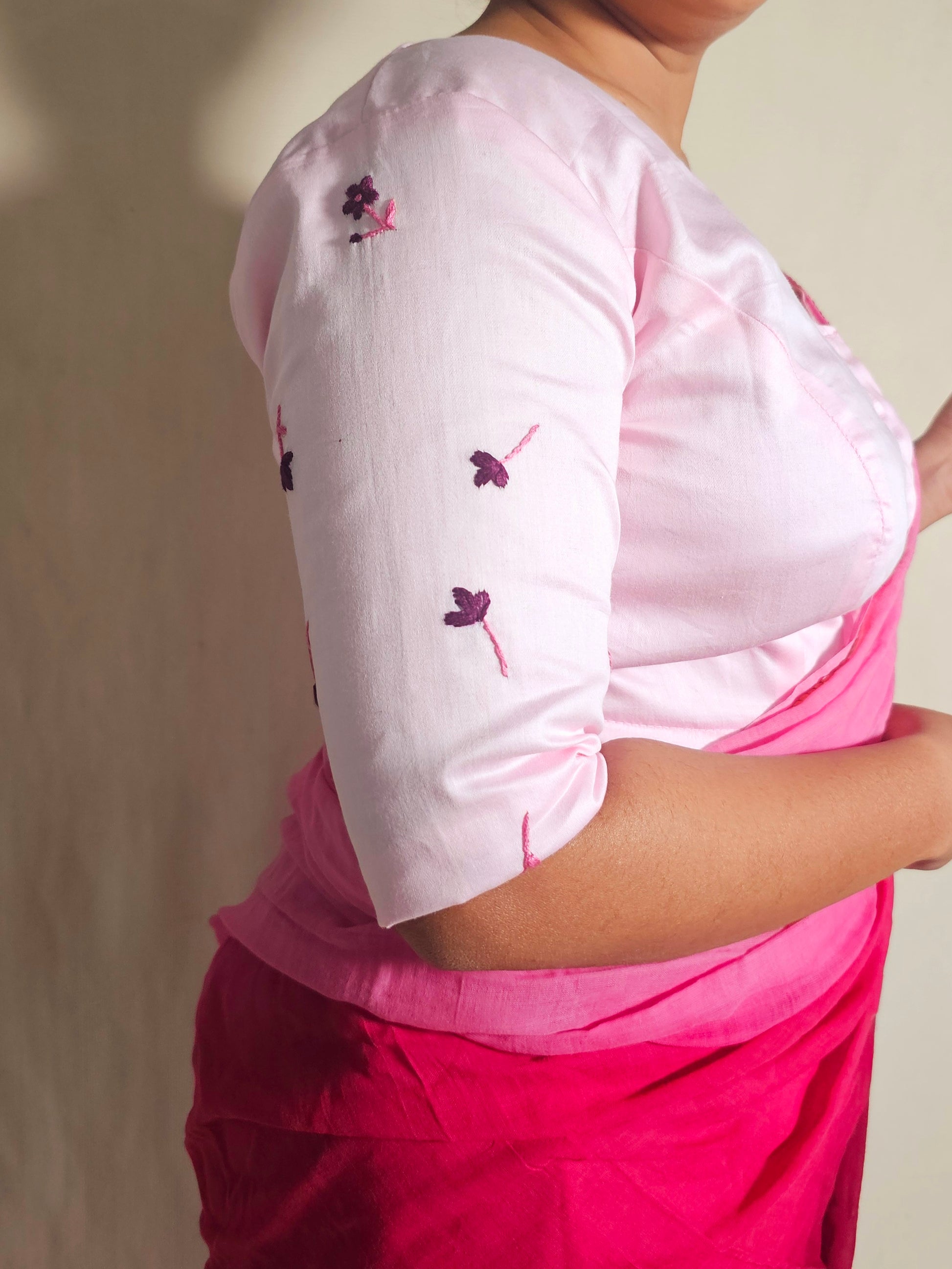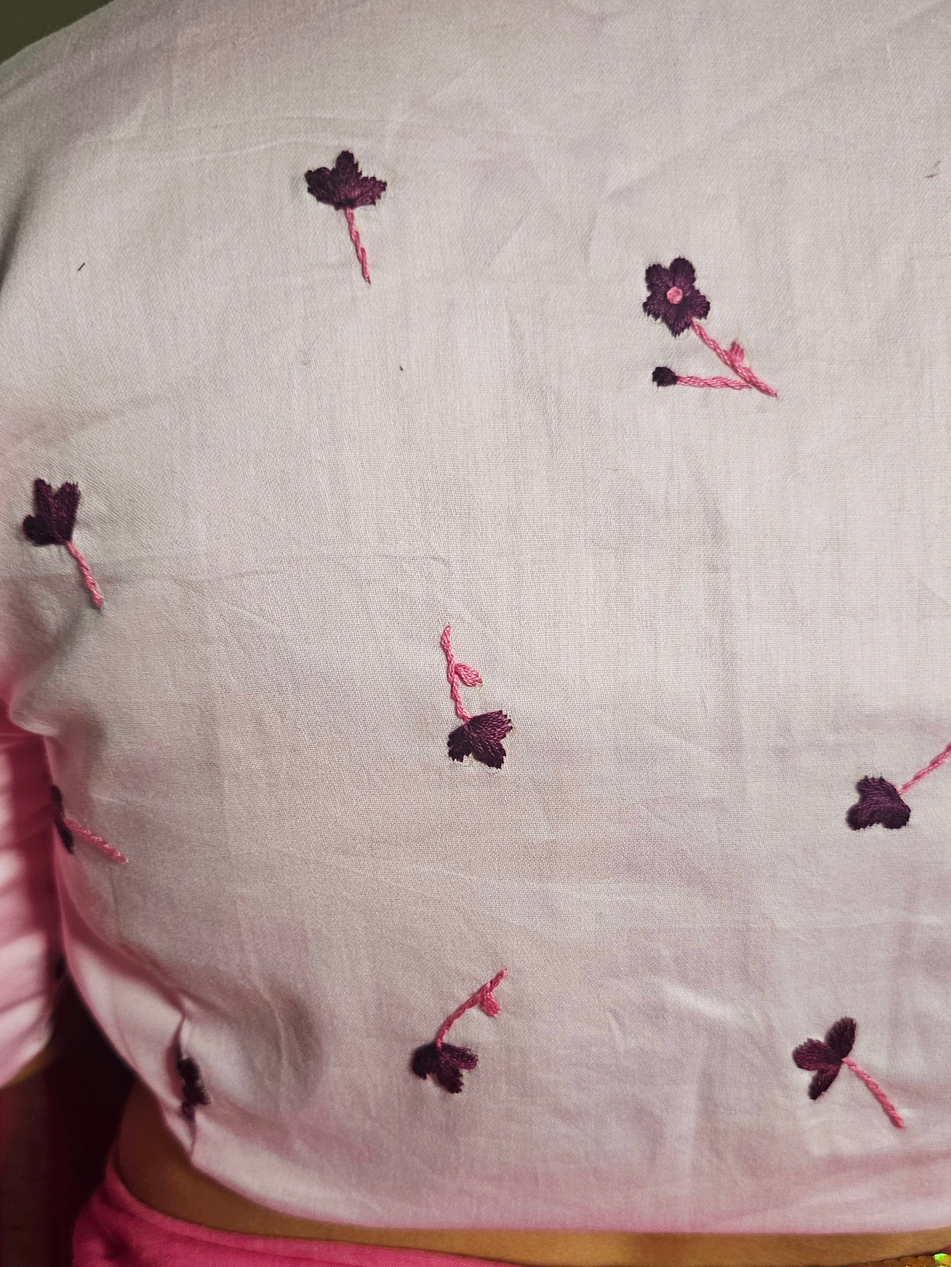 Introducing the Sugam Blouse: a delightful fusion of elegance and artistry. Delicate small flower motifs, meticulously hand-embroidered across the back, infuse this exquisite piece with a sense of whimsical charm. Each stitch tells a story of craftsmanship and beauty, celebrating the intricate details of nature. Elevate your style with the Sugam Blouse, where every wear becomes a celebration of grace and femininity, showcasing the timeless allure of handcrafted luxury.