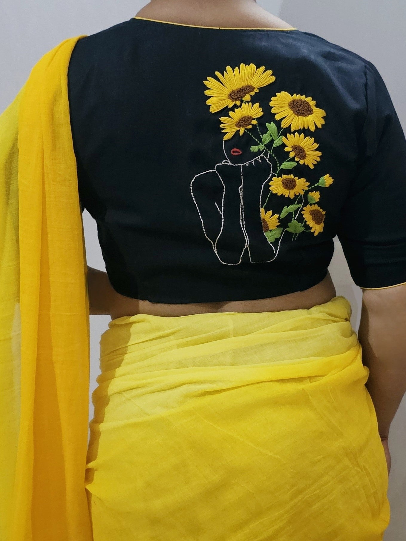 Sunlit Petal Blouse - Captivate in the allure of nature's brilliance with this hand-embroidered blouse, featuring a vibrant motif of sunflowers. Each stitch tells a story of artistry, bringing the joyous hues of sunflowers to life in elegant fashion.