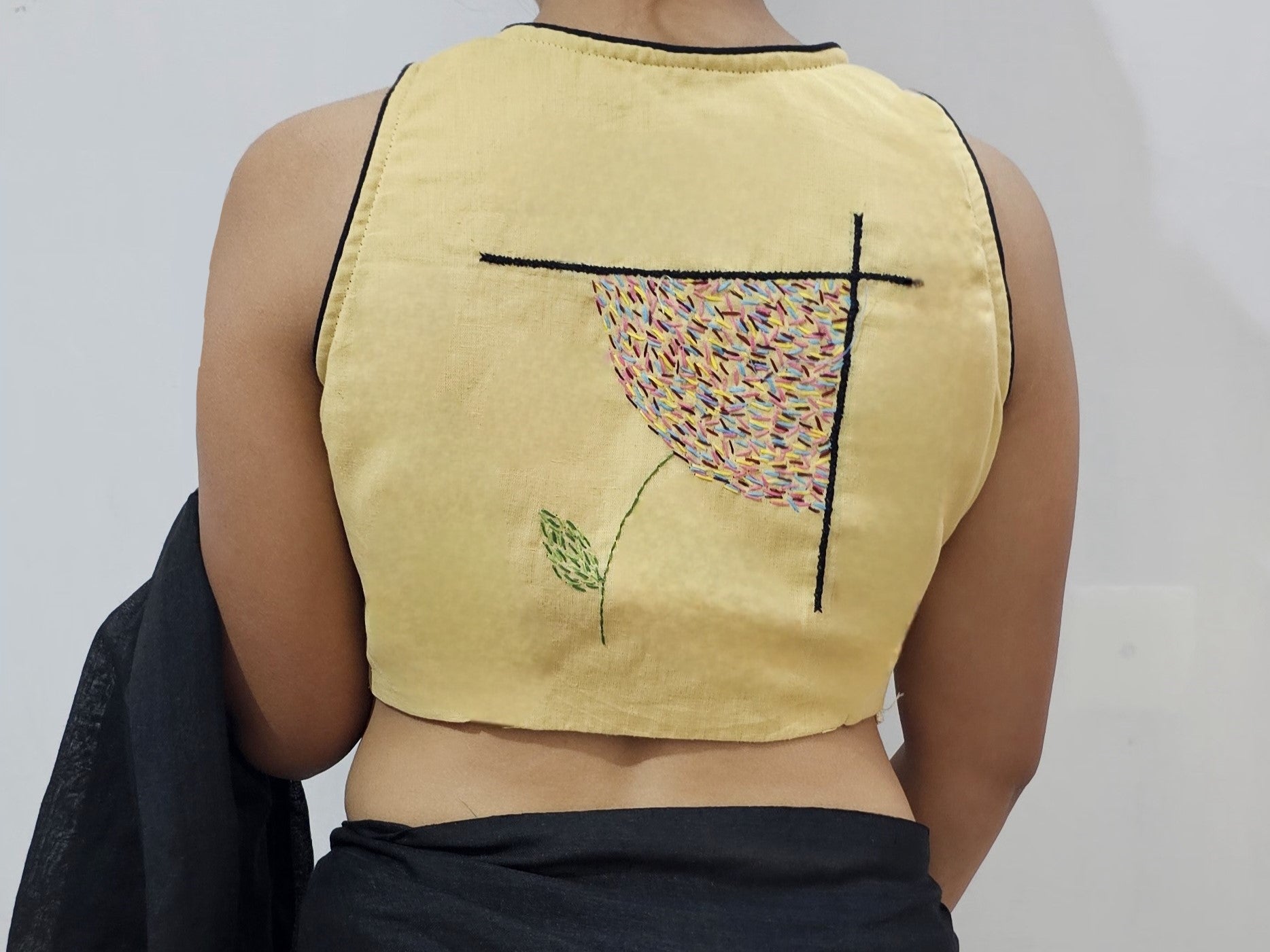 The "Surabhi Blouse" featuring hand-embroidered multicolored seed stitch motifs, effortlessly complements sarees of any color palette. Its intricate detailing enhances the overall look without overshadowing the saree's hues, making it an ideal choice for any occasion.