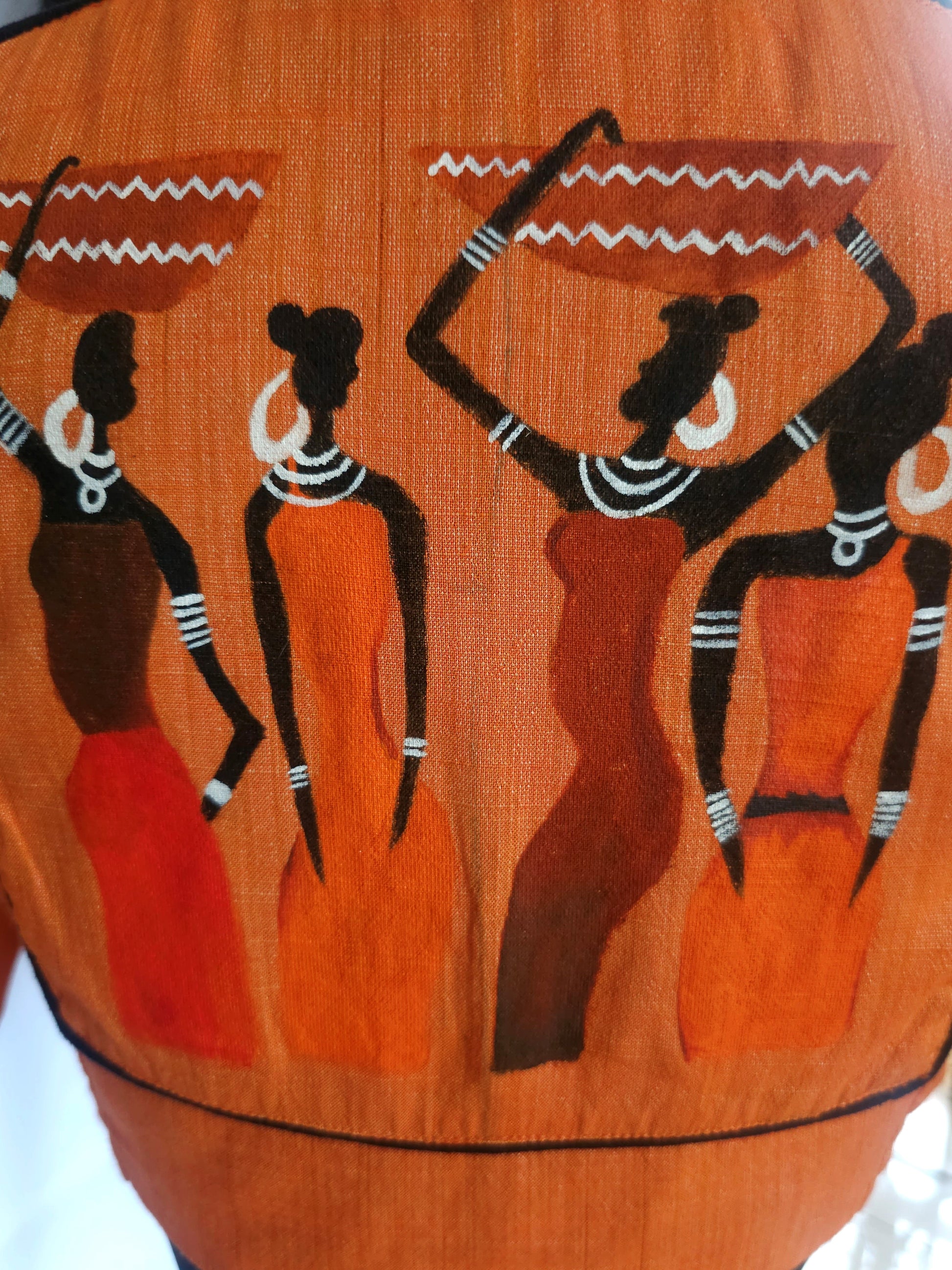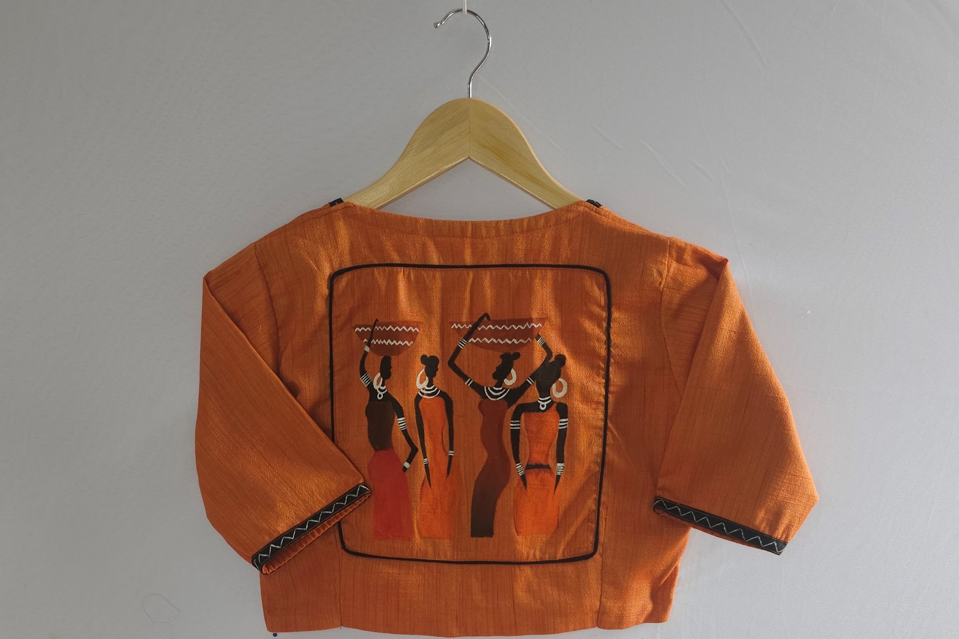 'Tribal Tint Blouse' This hand-painted blouse is a canvas of tribal tradition, depicting women in their ethnic attire with grace and poise. It's more than clothing; it's a wearable piece of art that speaks of heritage and strength.