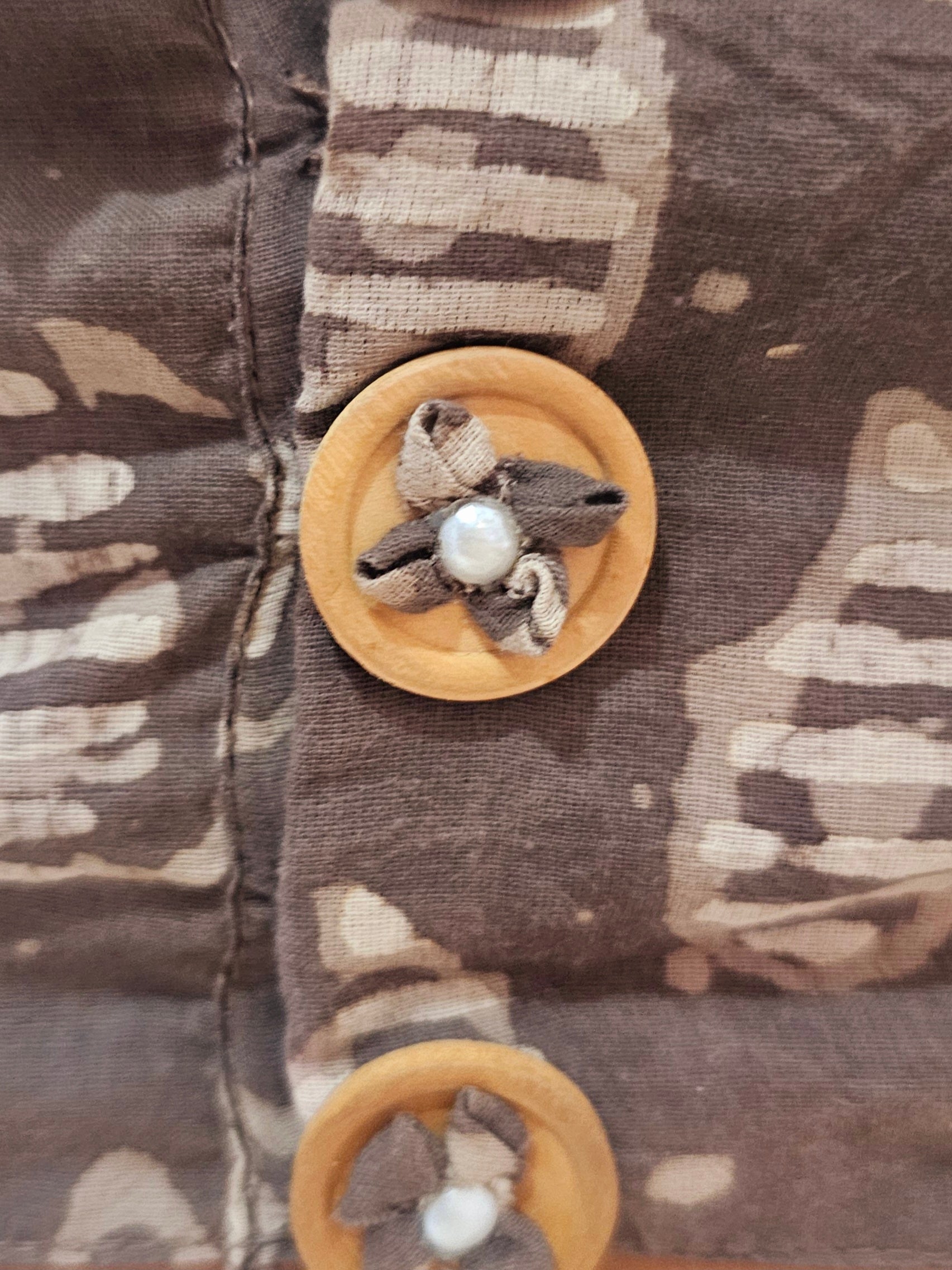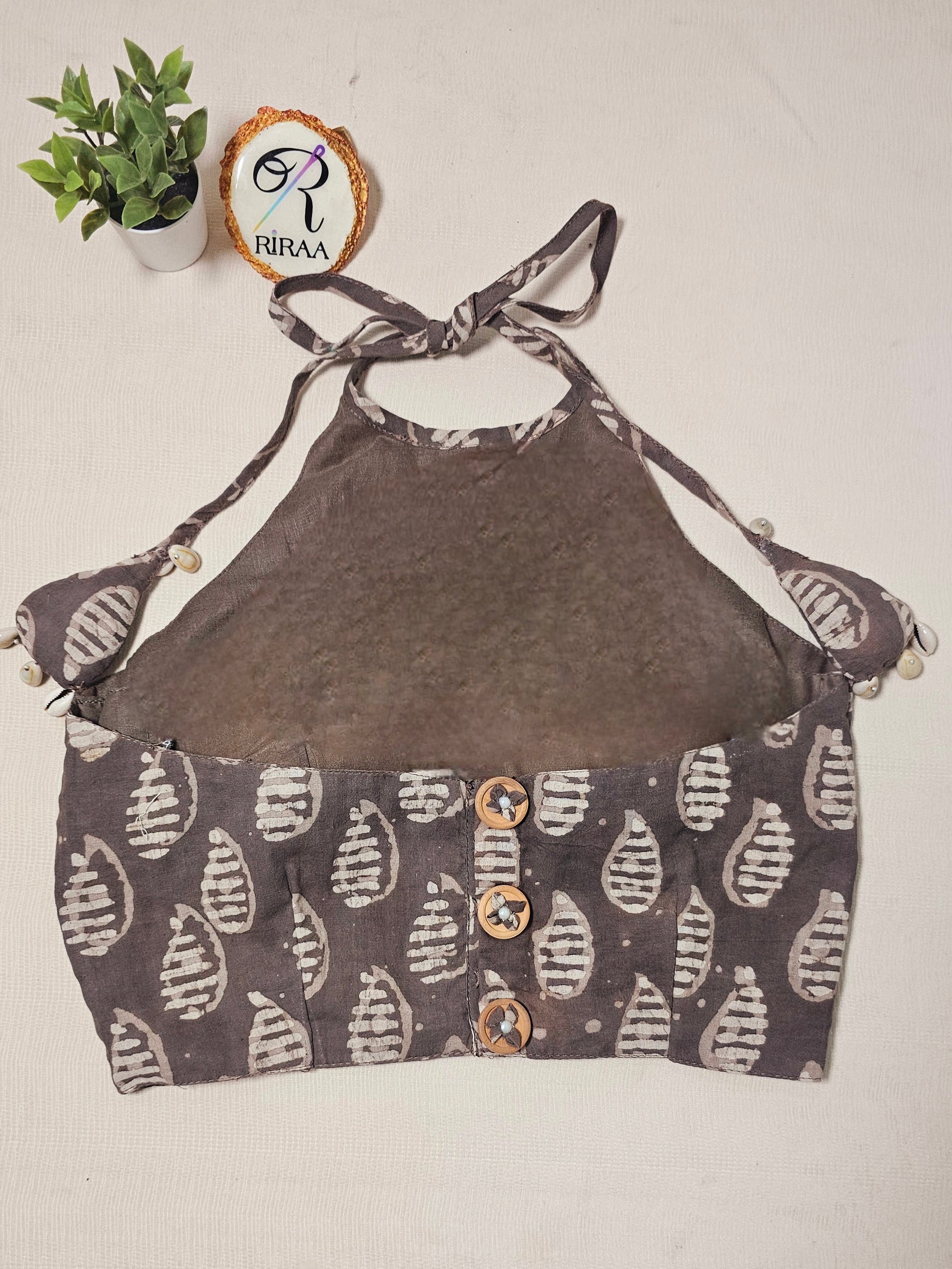 Discover the Triveni Blouse, where tradition meets contemporary fashion. This exquisite piece features a chic halterneck design, seamlessly blending modern aesthetics with classic charm. Adorned with meticulously hand-embellished floral patterns on beautifully crafted wooden buttons, the Triveni blouse is a celebration of style, grace, and heritage.