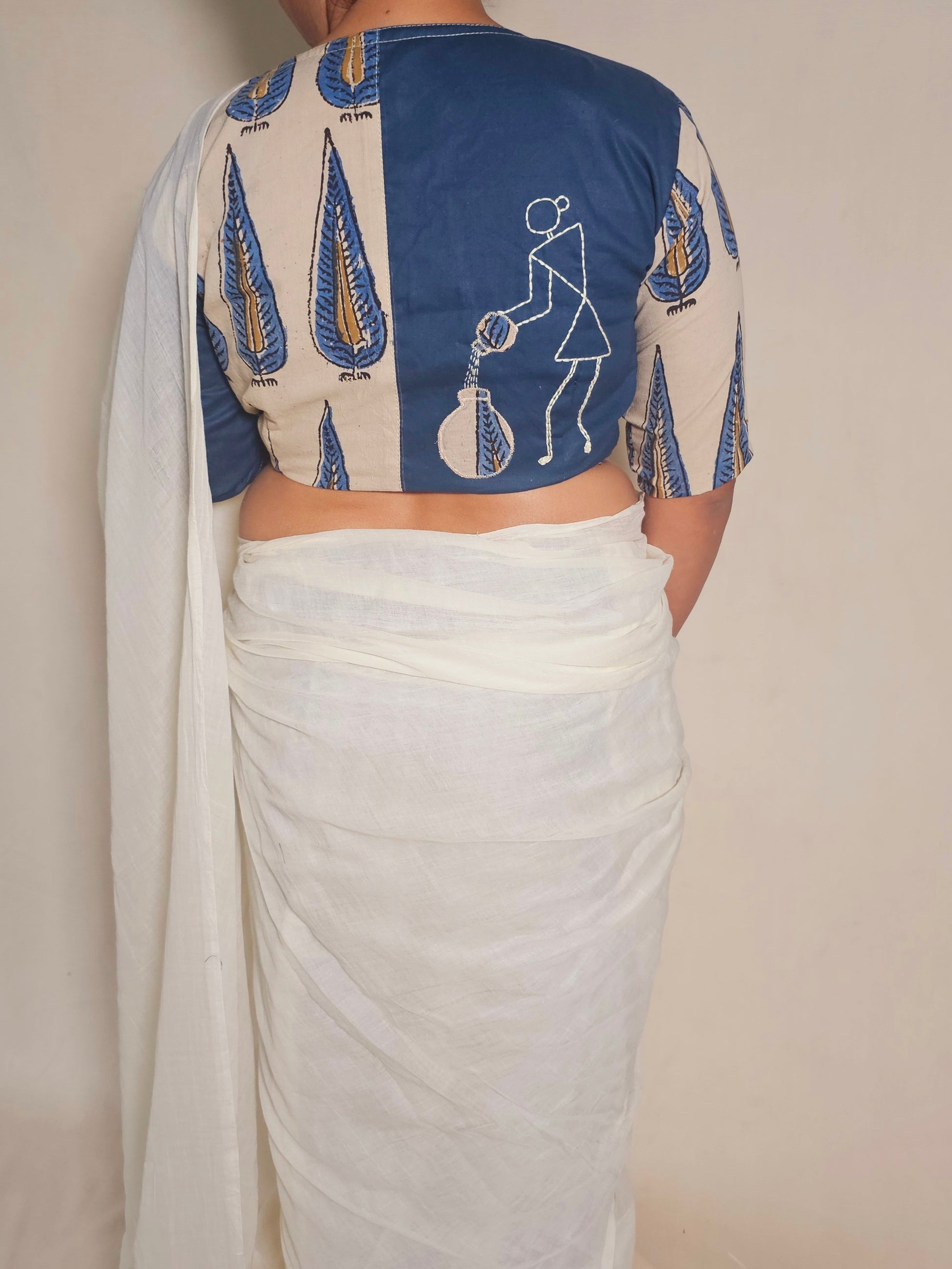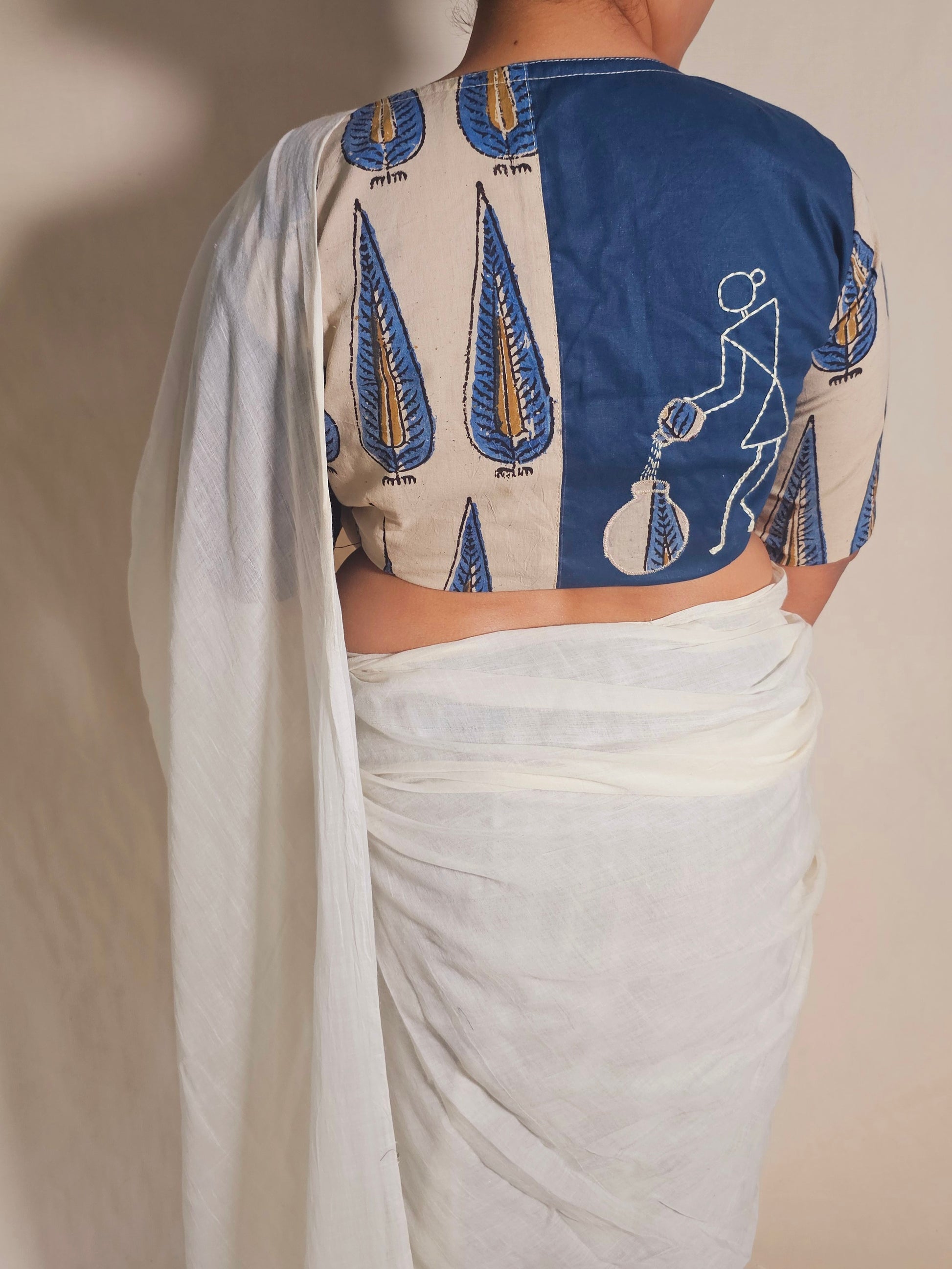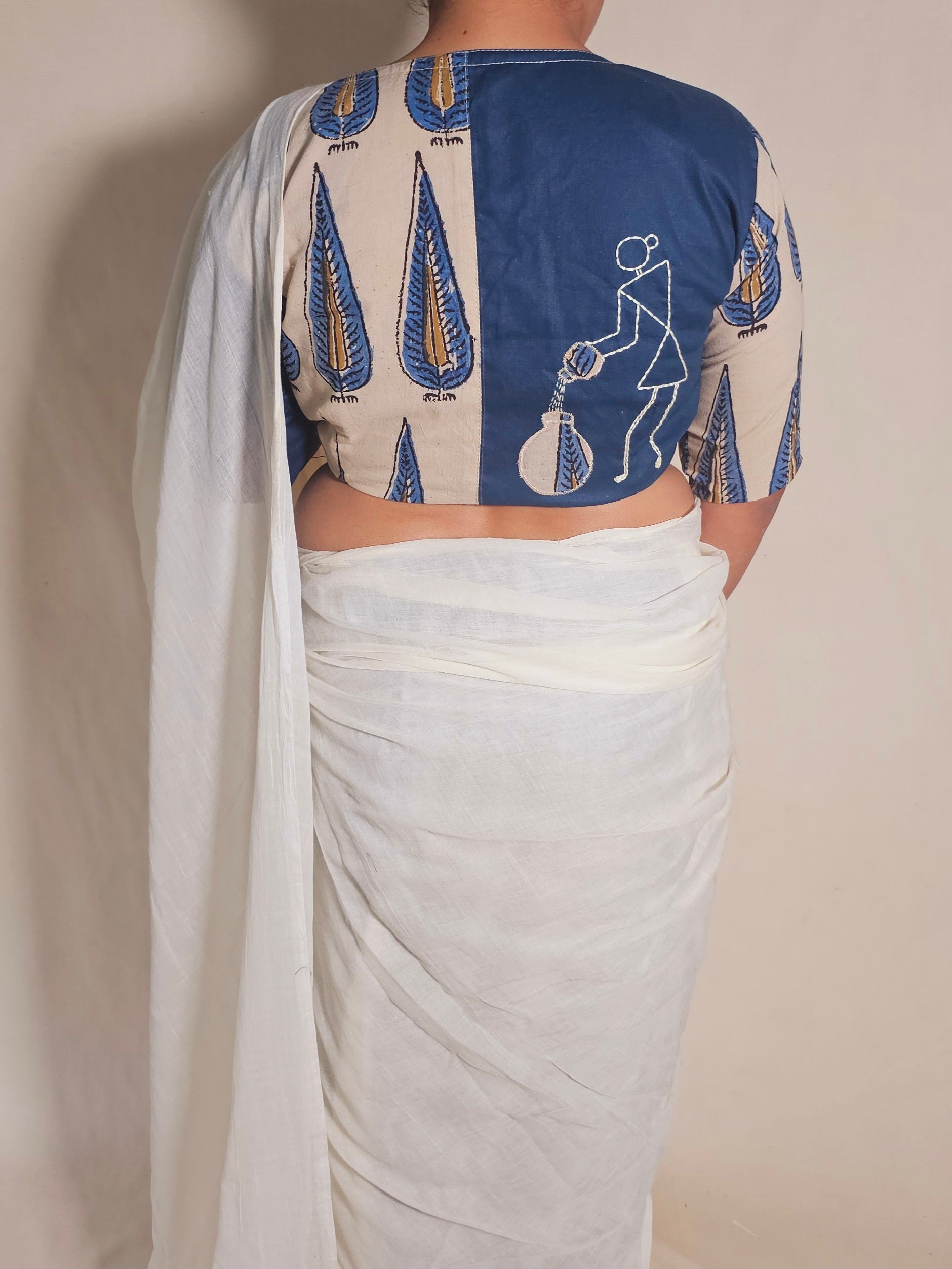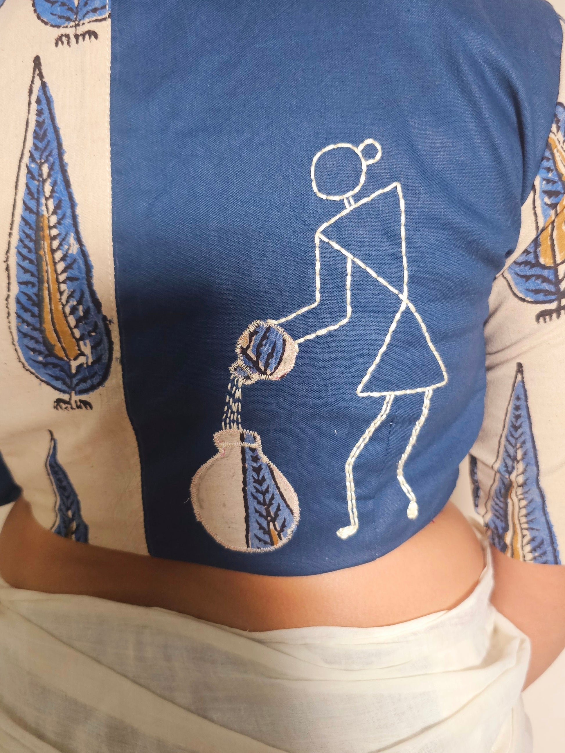 Warli Akriti Blouse : With hand-appliquéd Warli art, our blouse showcases the grace of a rural lady, celebrating the beauty of simplicity and culture in every thread.