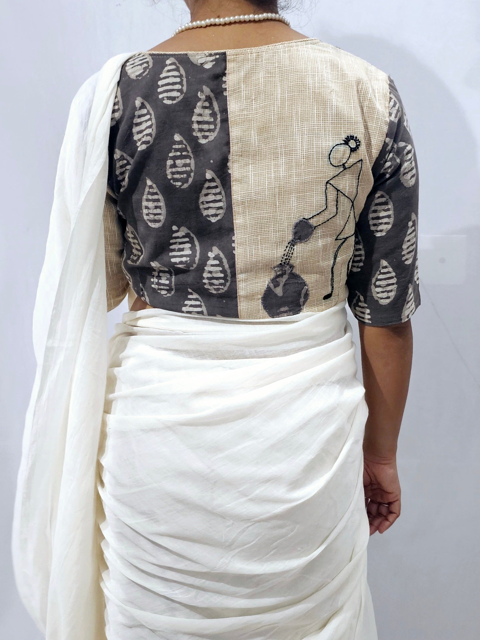 Warli Akriti : With hand-appliquéd Warli art, our blouse showcases the grace of a rural lady, celebrating the beauty of simplicity and culture in every thread.
