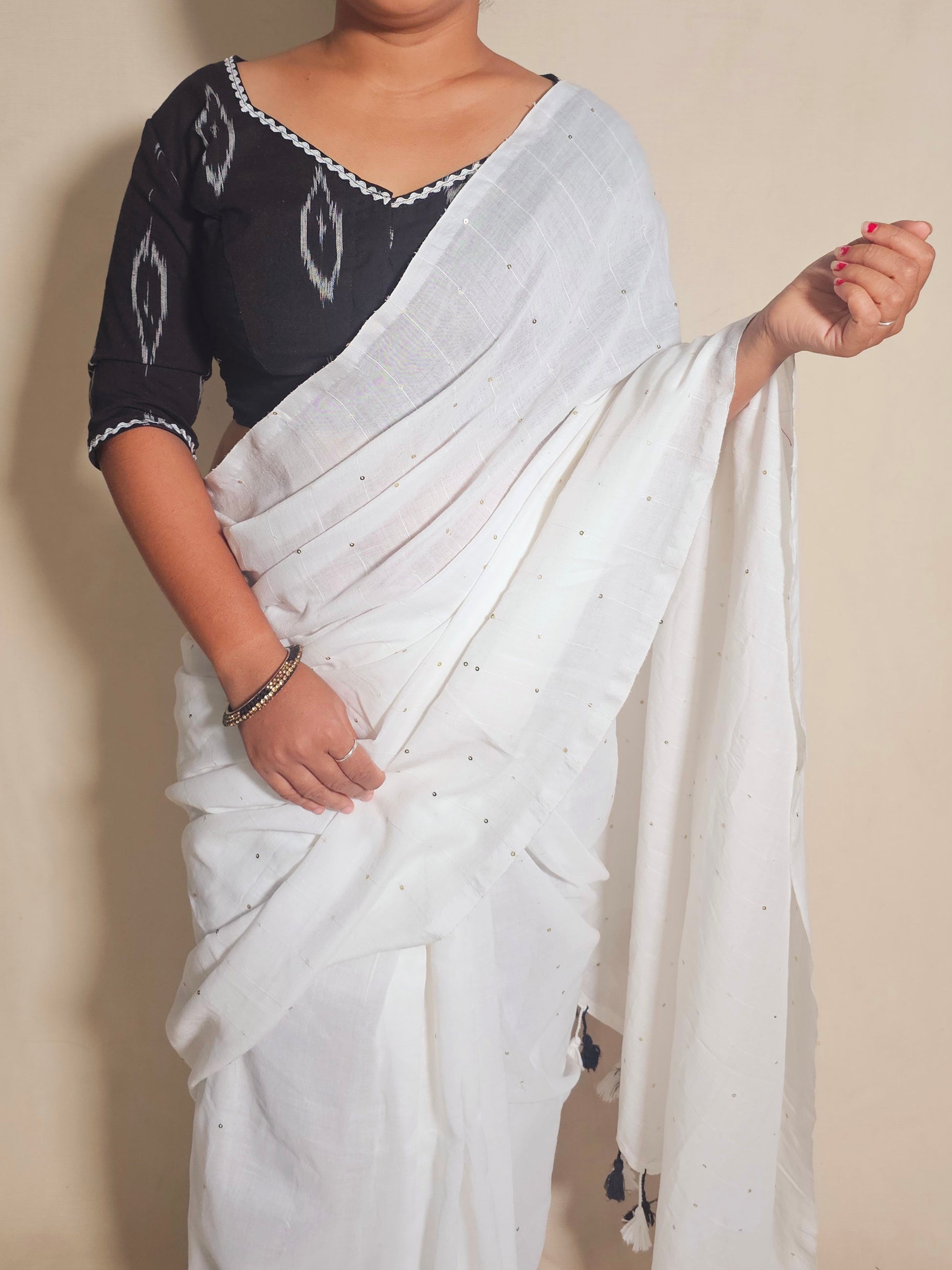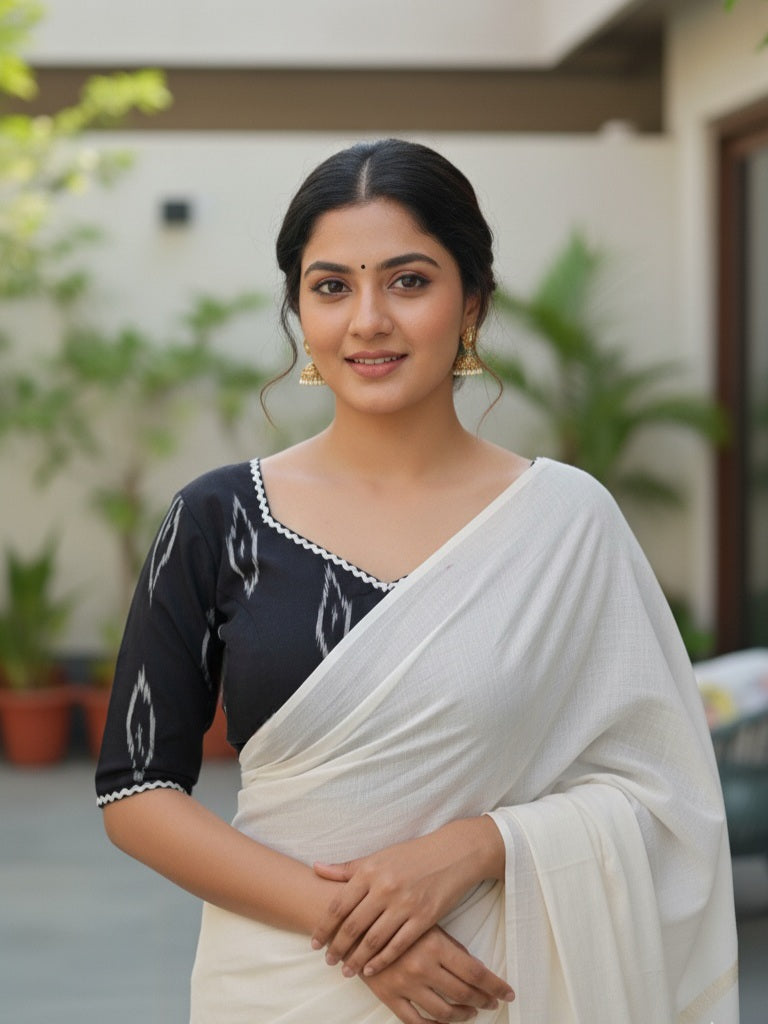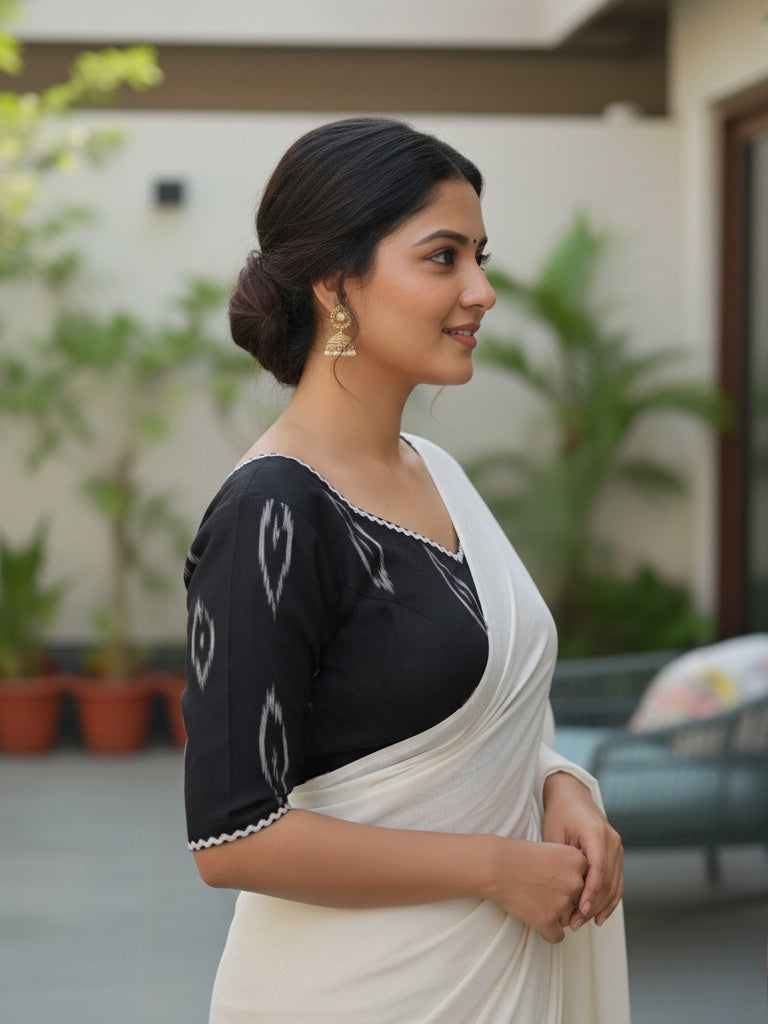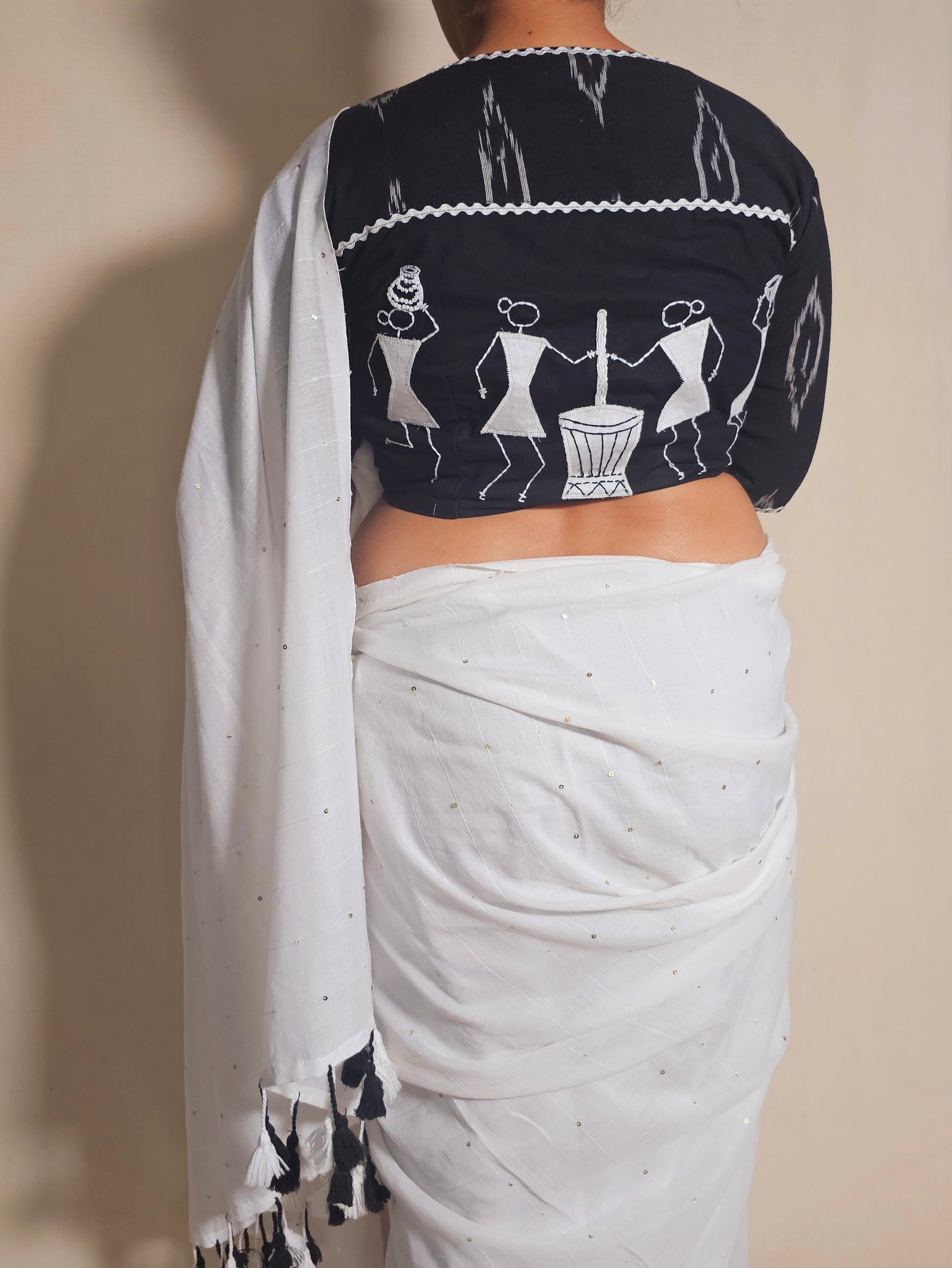Warli Jeevani Blouse - Not just a blouse, but a canvas of stories — Warli Jeevani carries the lives of women in every motif, stitched with applique and hand embroidery on Ikkat cotton.