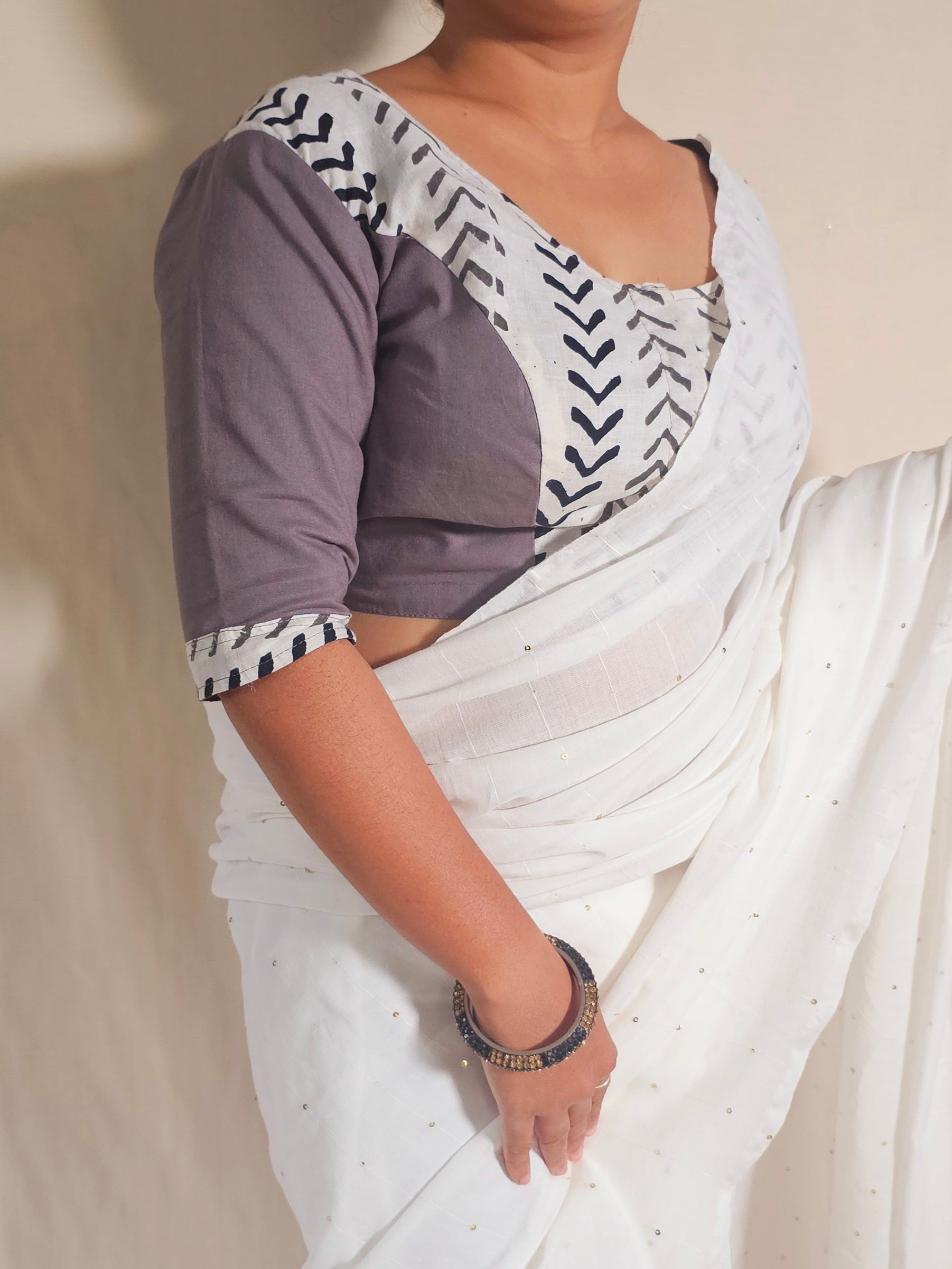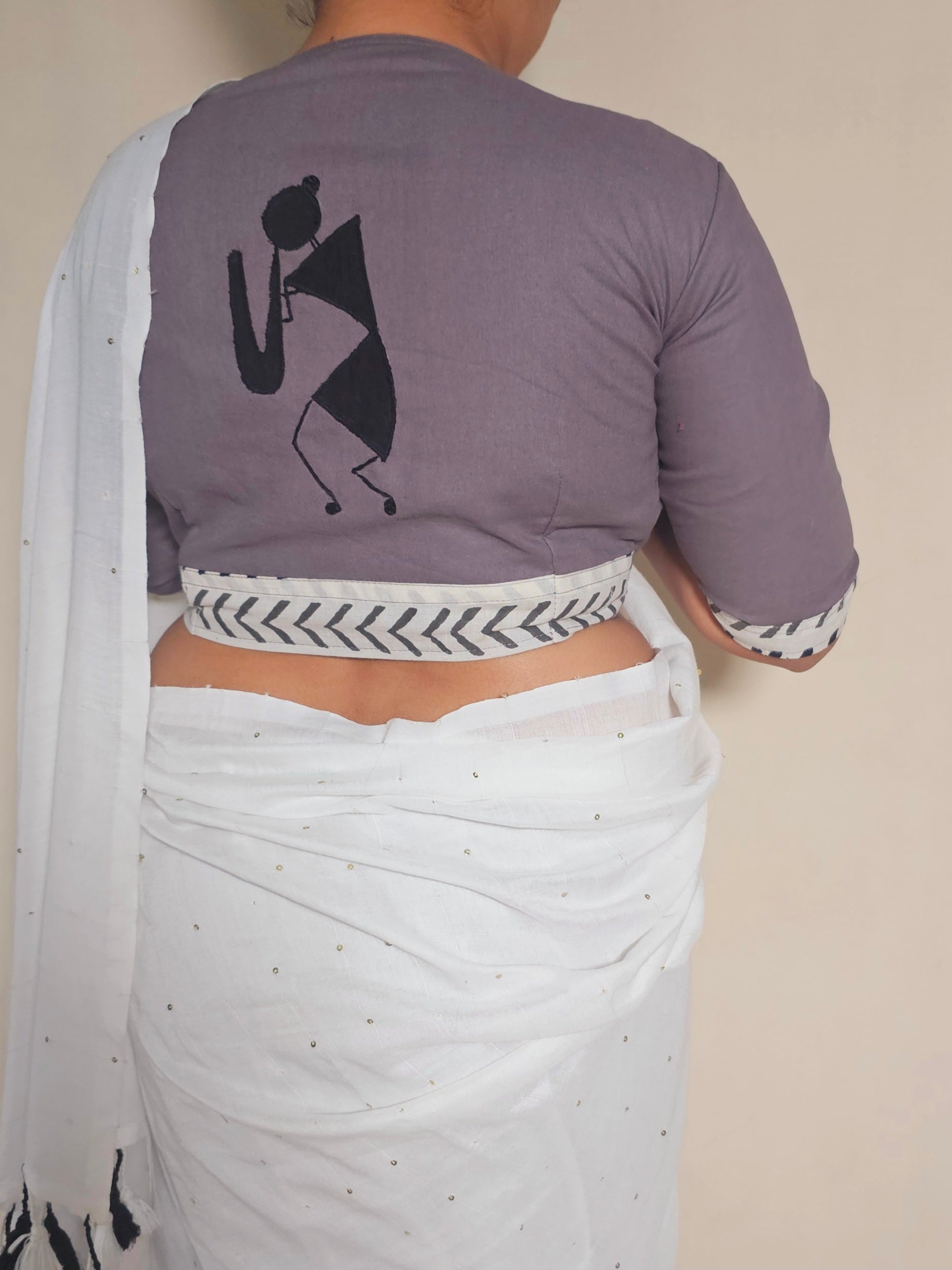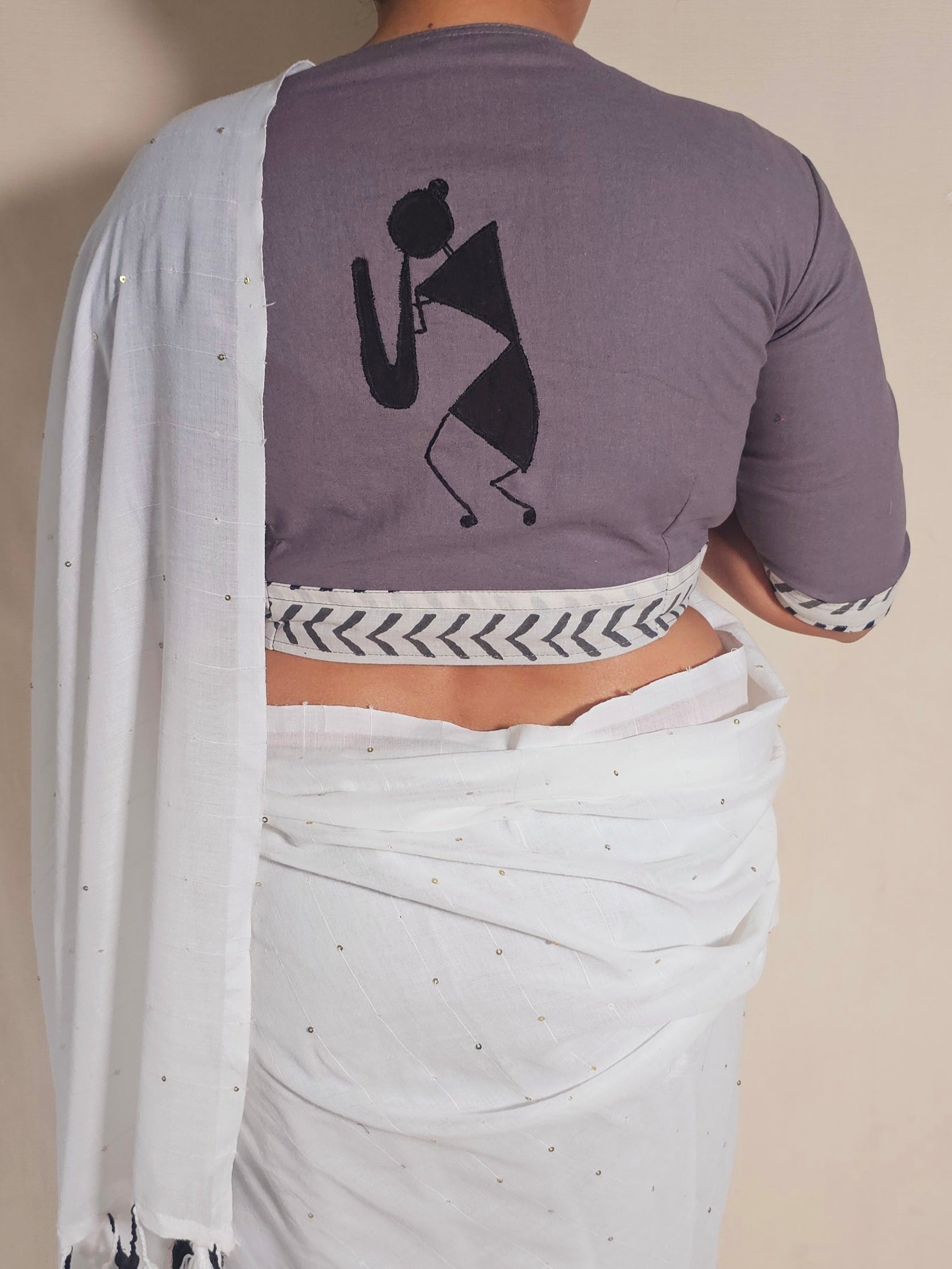 Warli Tune Blouse : Let the melodies of tribal warli culture resonate in our "WARLI TUNE" blouse, Where Warli stories are expertly appliqued into the fabric of handloom elegance. Pair it with white mulmul saree for elegance.